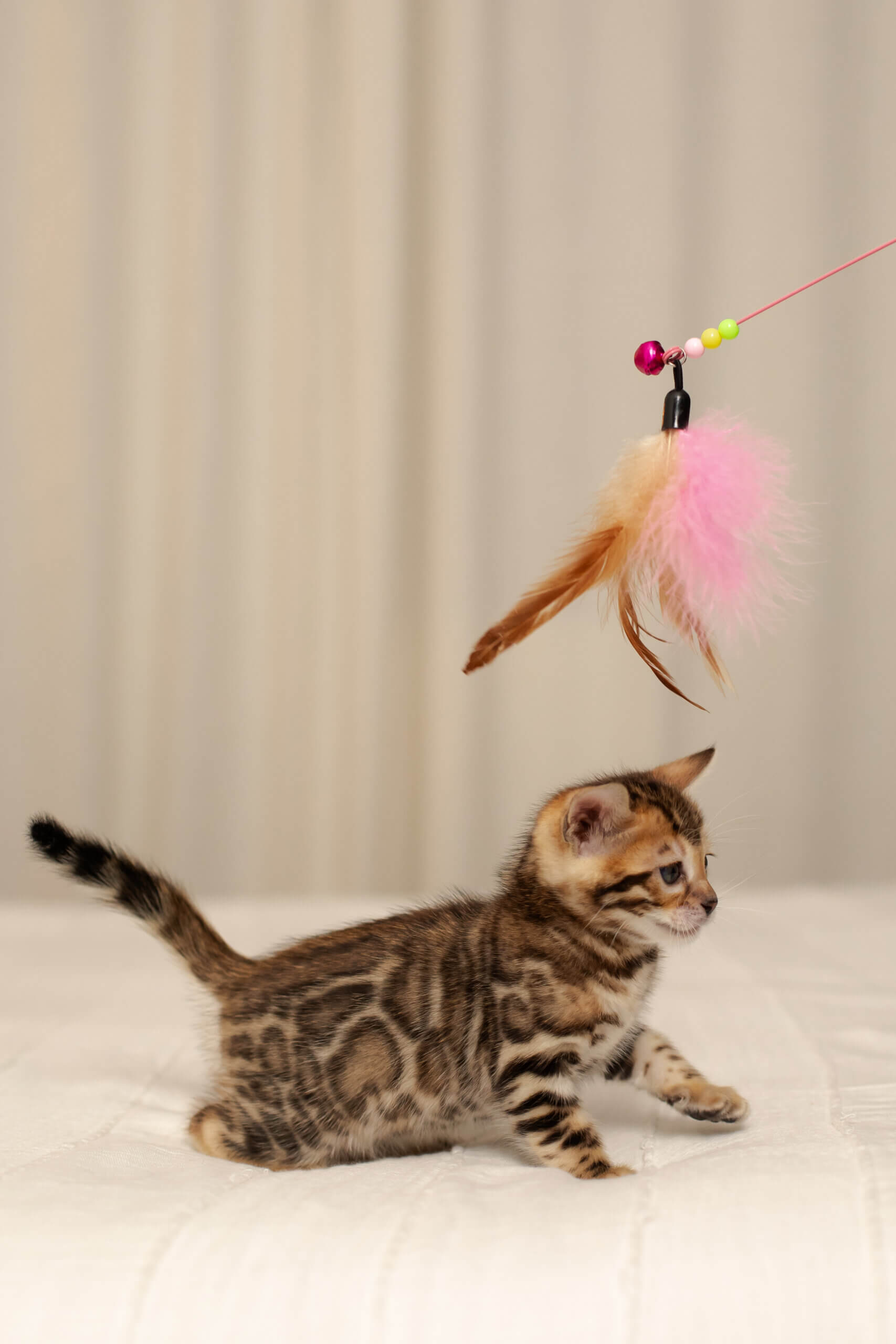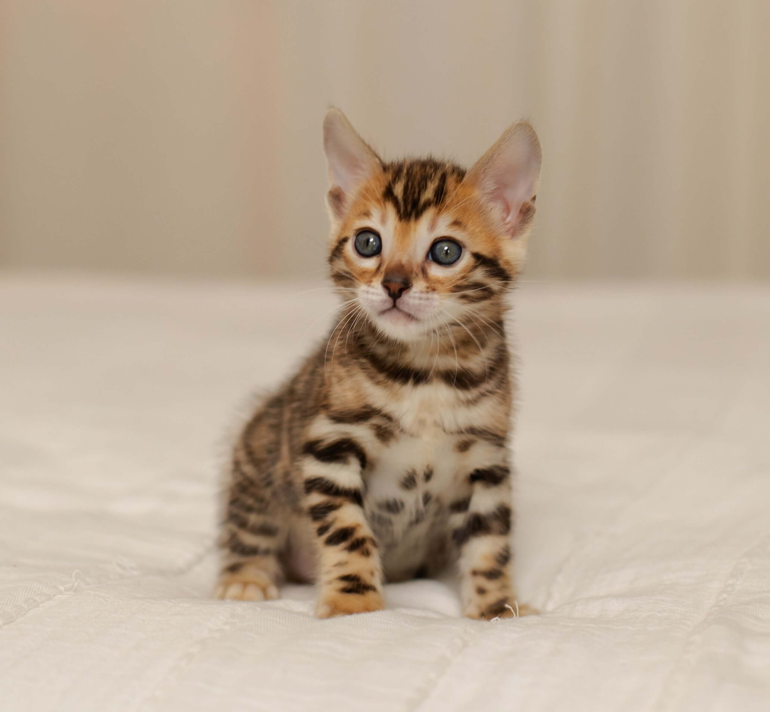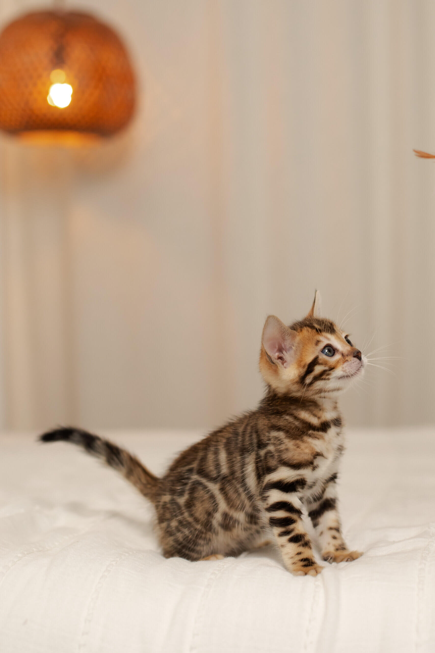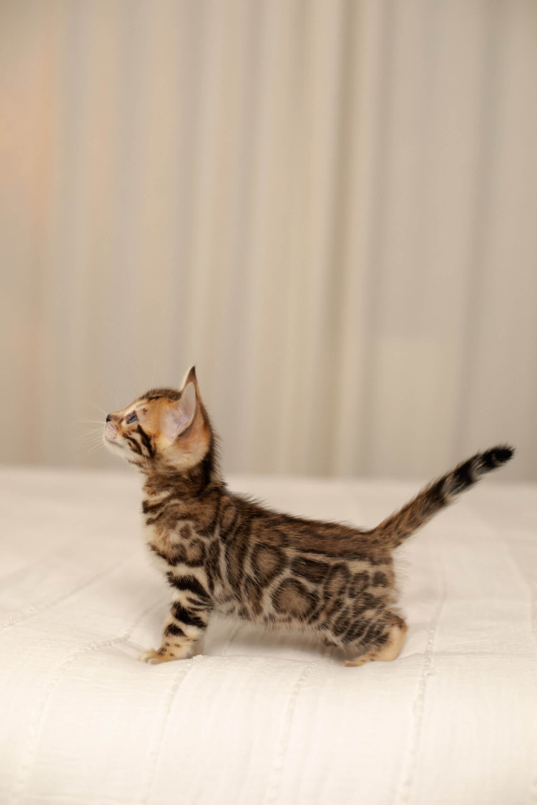 Meet Jasmine, our enchanting Bengal girl whose emerald-green eyes will melt your heart at first glance. With her velvety brown spotted tabby coat and graceful presence, Jasmine brings a touch of wild beauty into every room—yet her favorite place is right beside you, purring softly and nuzzling for warmth.