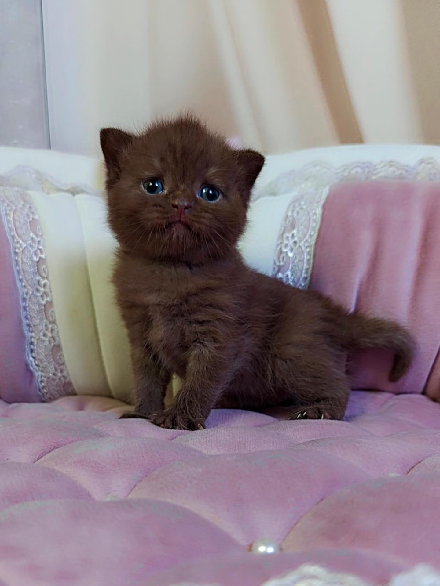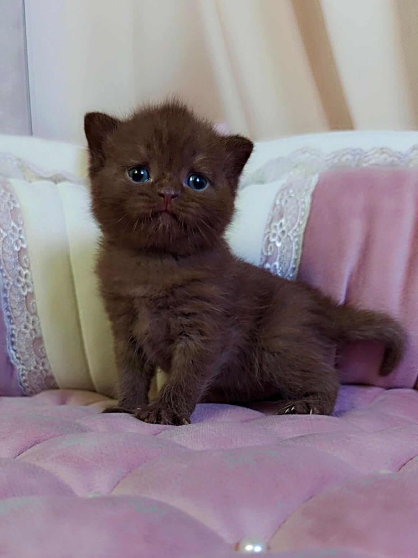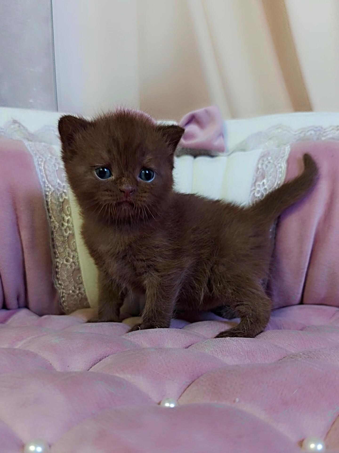 Meet Jasper, a breathtaking Chocolate Scottish Straight kitten whose yellow eyes are like golden lanterns in a dusk-lit room. His plush, cocoa-hued coat feels impossibly soft—imagine stroking velvety silk each time you run your fingers through his fur. When Jasper curls against you, he radiates gentle warmth and mesmerizing calm, making each cuddle unforgettable.