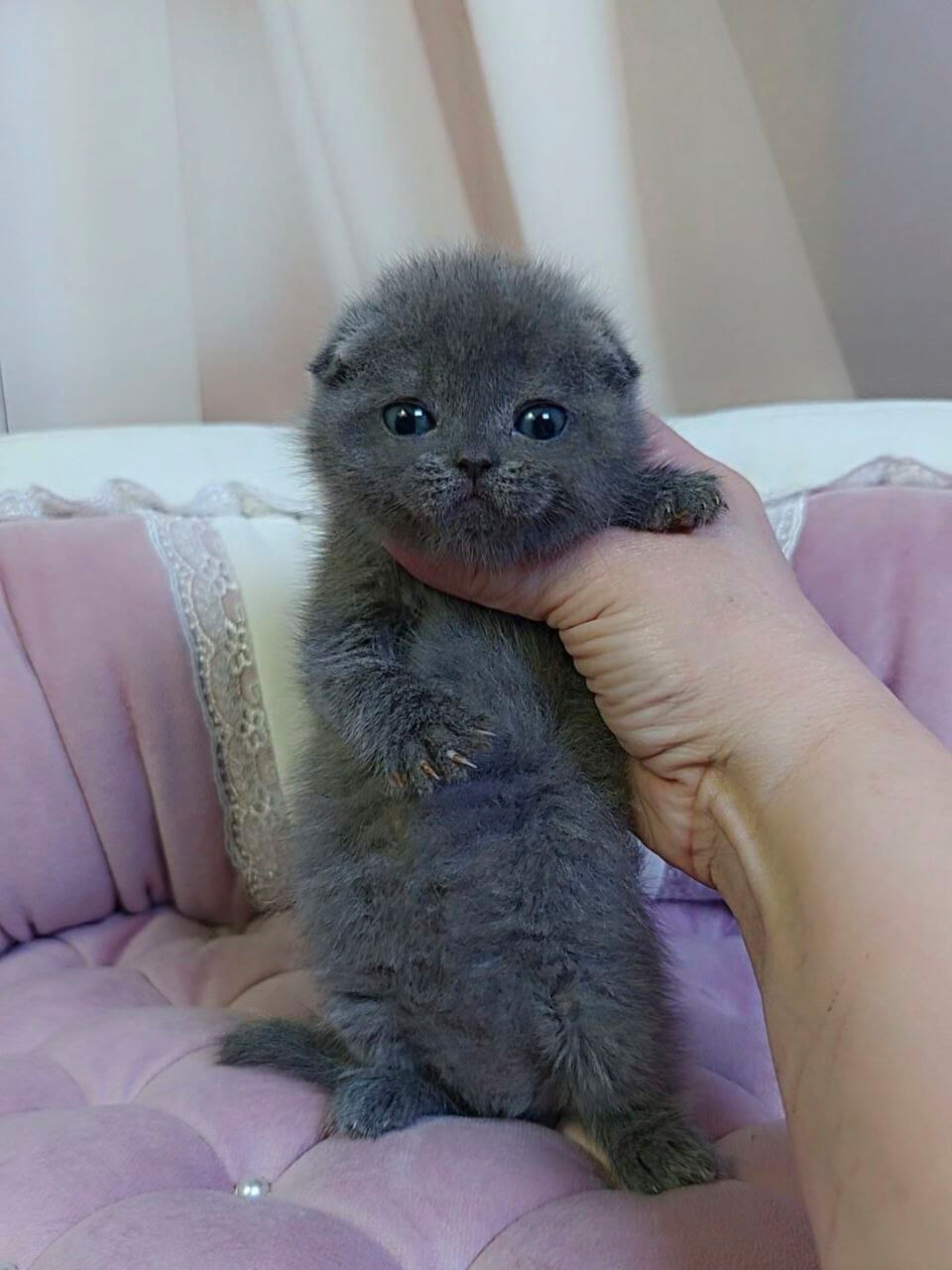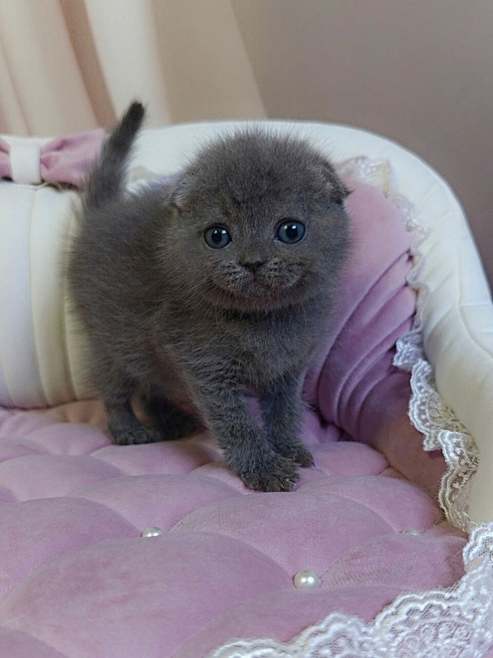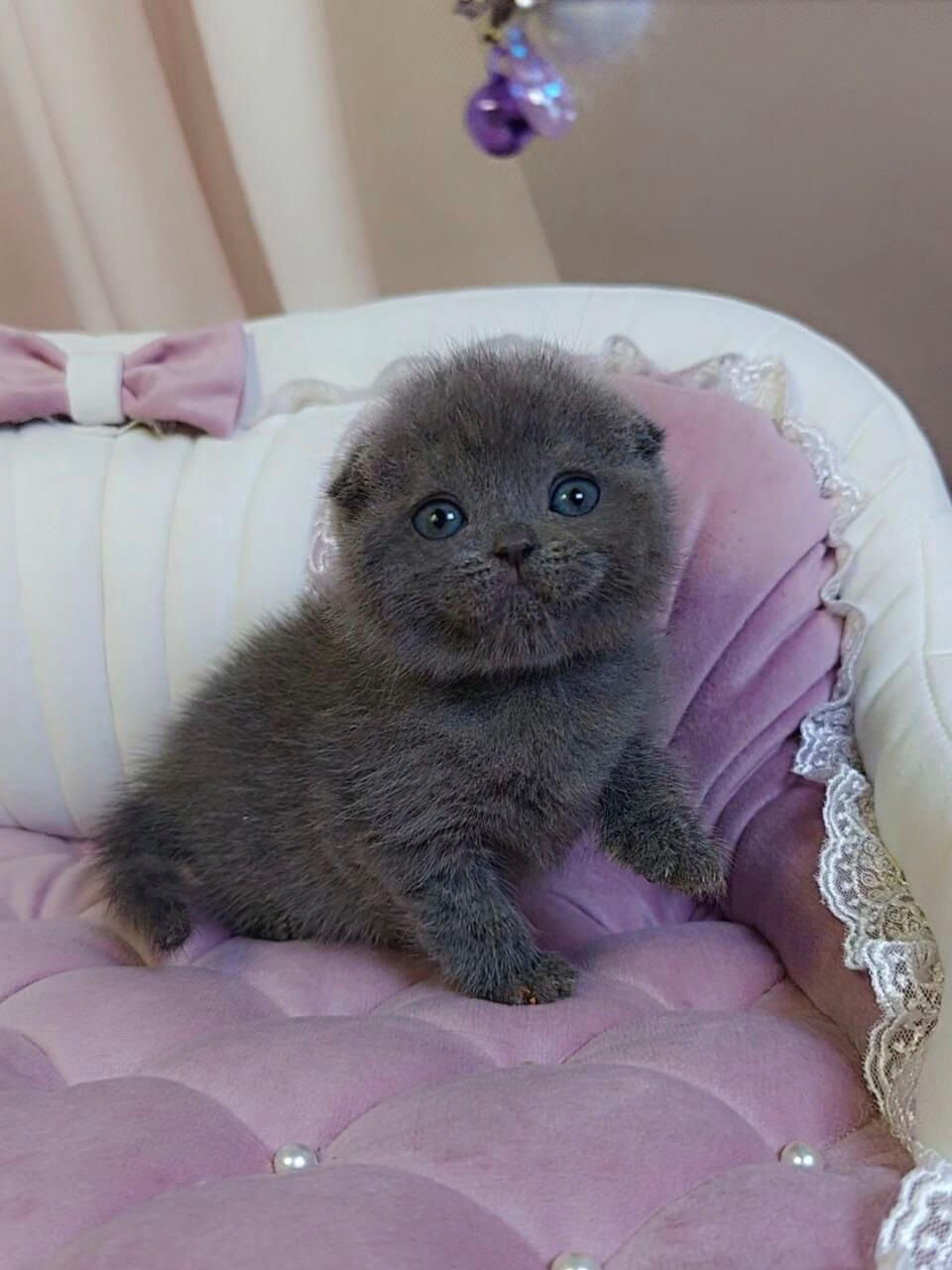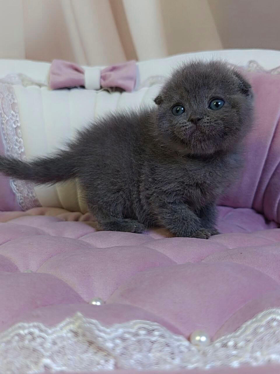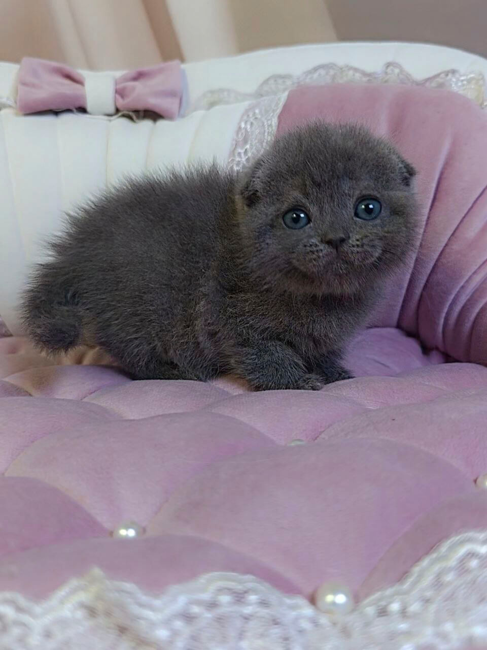 Jelly’s personality is as enchanting as her look: she’s a true Scottish Fold in every sense. This blue Scottish Fold kitten greets you at the door with a low, welcoming trill and a pause for a head tilt, her curiosity undimmed by routine. She’s known for curling near your lap, folding into the crook of your arm as if it were custom-made for her comfort. Each evening, you’ll find her perched atop soft blankets, quietly watching you read or work, whiskers twitching as she soaks up every detail of your world.