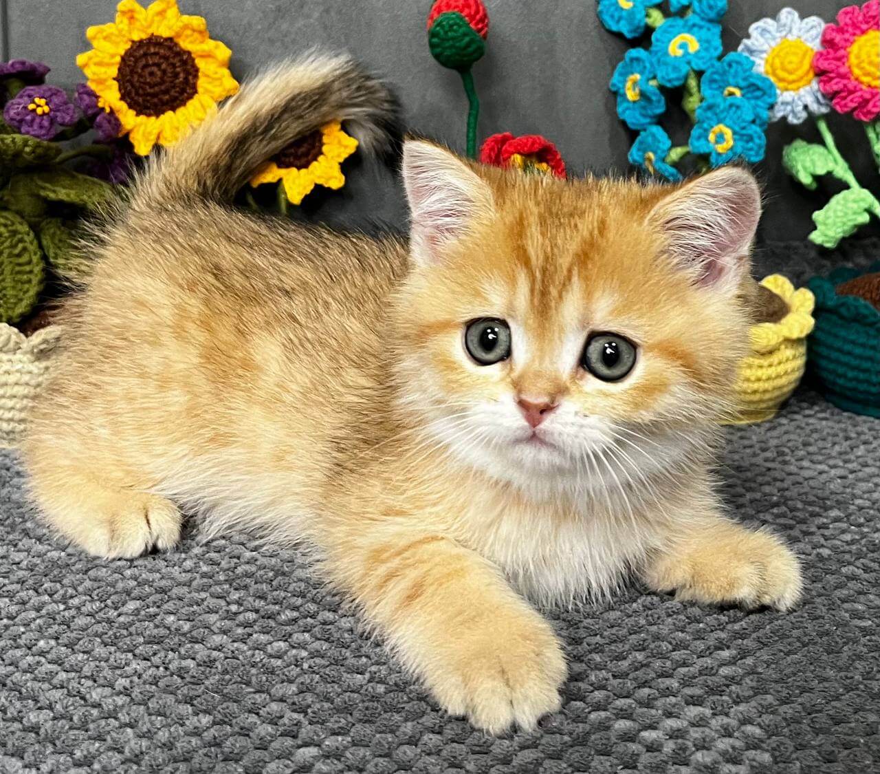 Jenny is a Black Golden Tabby Spotted Scottish Straight kitten whose gentle, shimmering coat ripples between rich gold and deep velvet black. When you pick her up, she melts into your arms, the stripes on her legs striking against the warmth of your hands. Her brilliant green eyes meet yours with a tranquil steadiness, inviting you in.