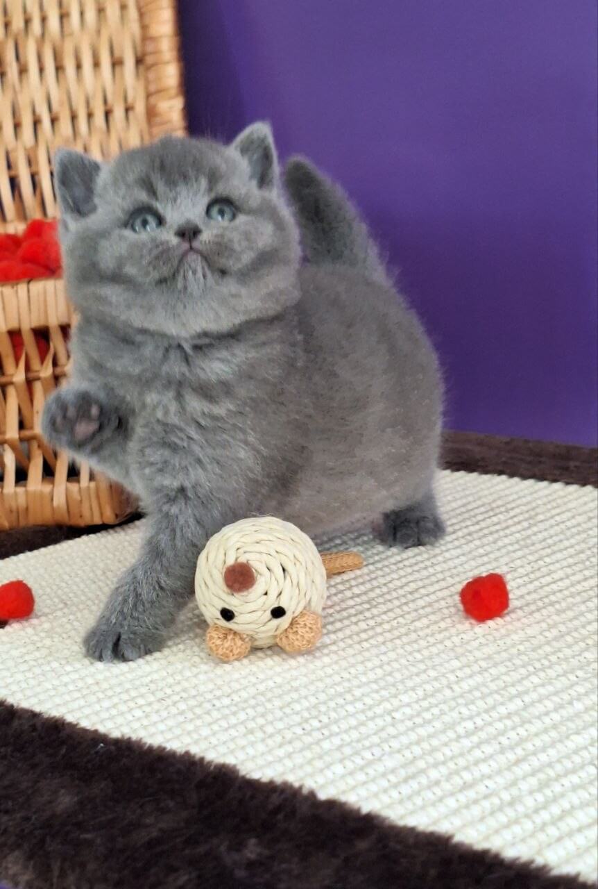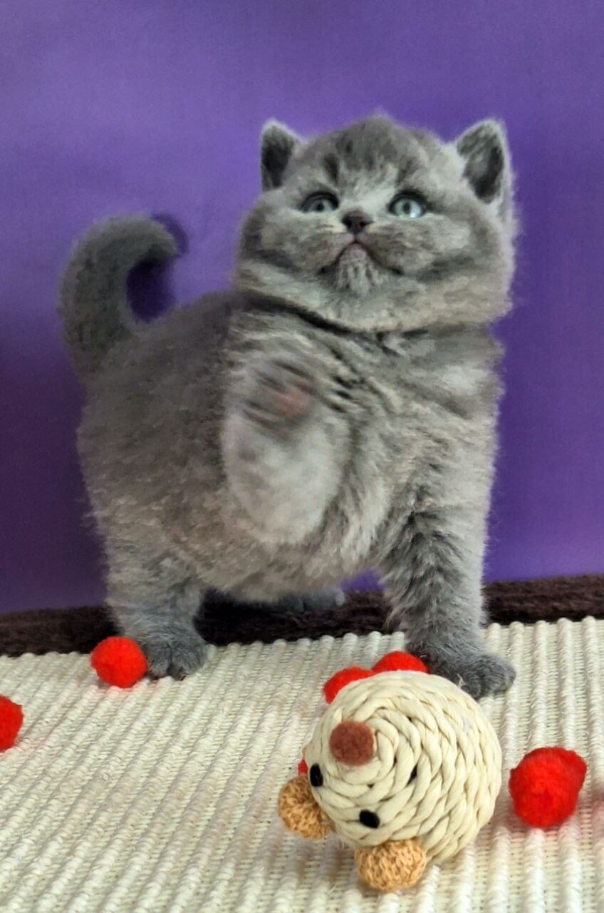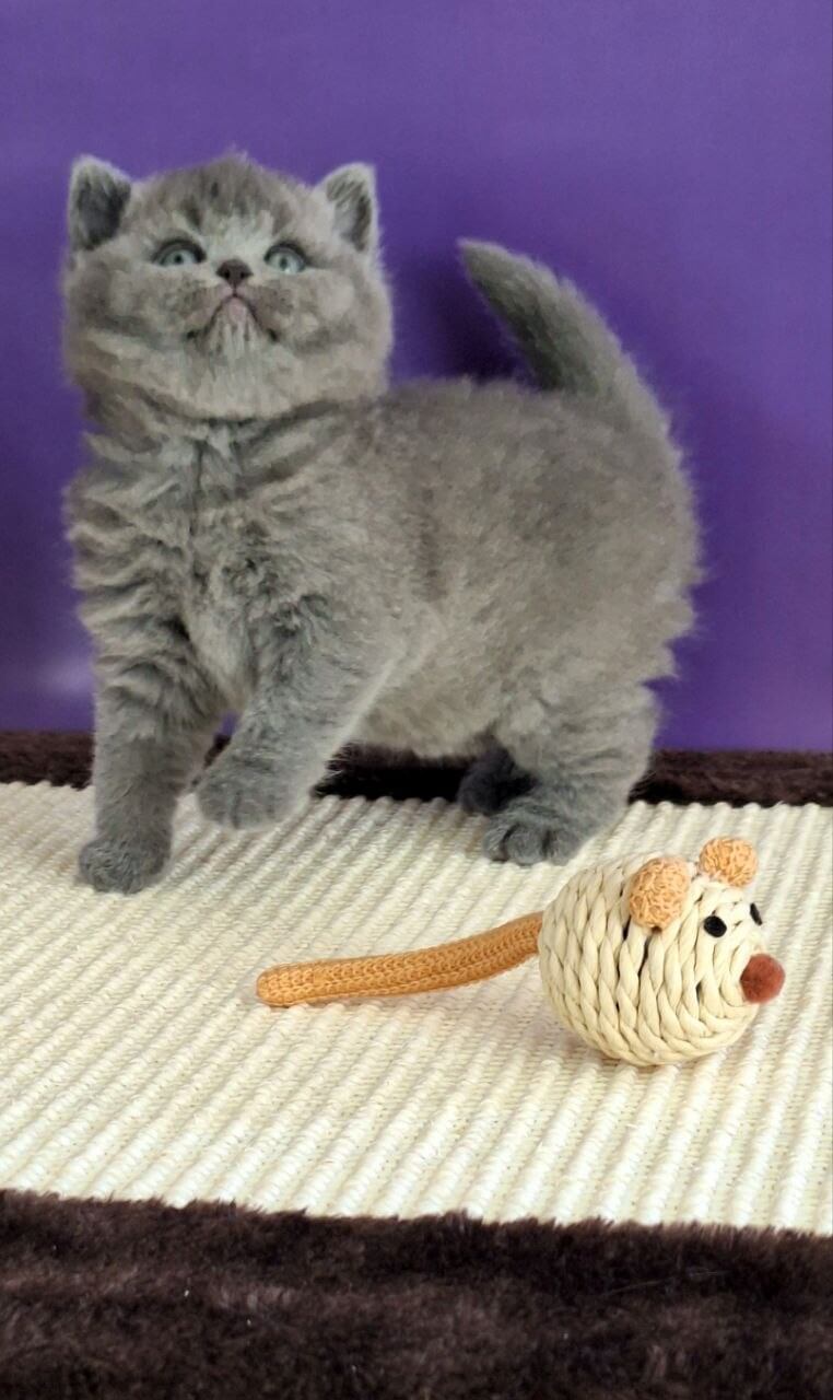 Jeremina, a Blue British Shorthair kitten with plush, silvery-blue fur, feels like the softest velvet as you hold her close. Her yellow eyes glow like warm lanterns, lighting up her face with curiosity and serenity. Every slow blink and gentle purr invites you into her peaceful, steady presence. She has an endearing weight, grounding you the moment she settles in your arms.