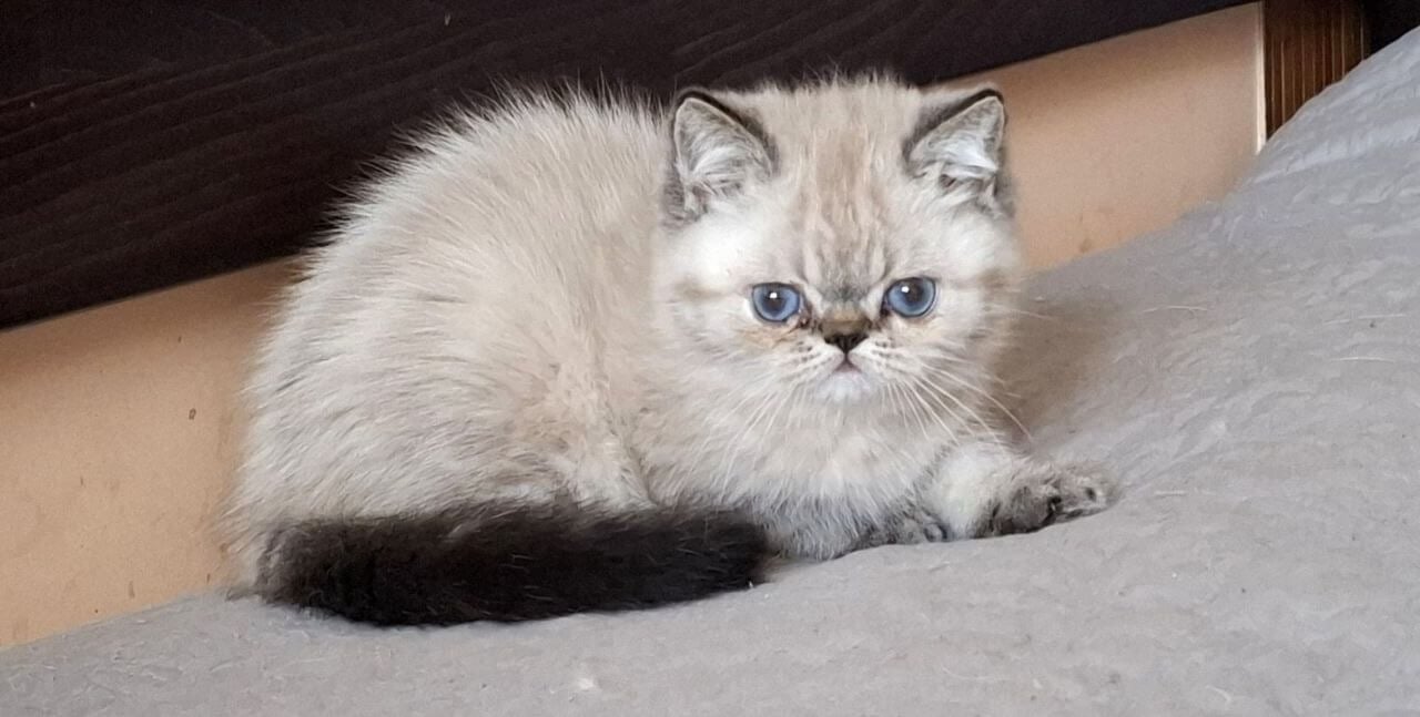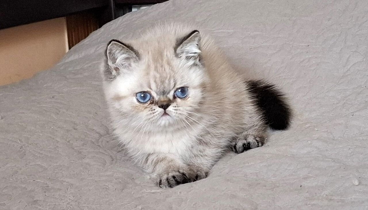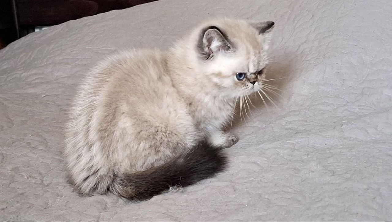 With one look into Jery’s glacial blue gaze, you’ll feel the calm gravity only a show-quality Seal Lynx Point Persian kitten brings. Her coat is astonishing—silky-soft, with creamy, snow-kissed fur tipped delicately in smoky seal hues. Each gentle stroke across her plush chest or cheek sends warmth straight to your heart.