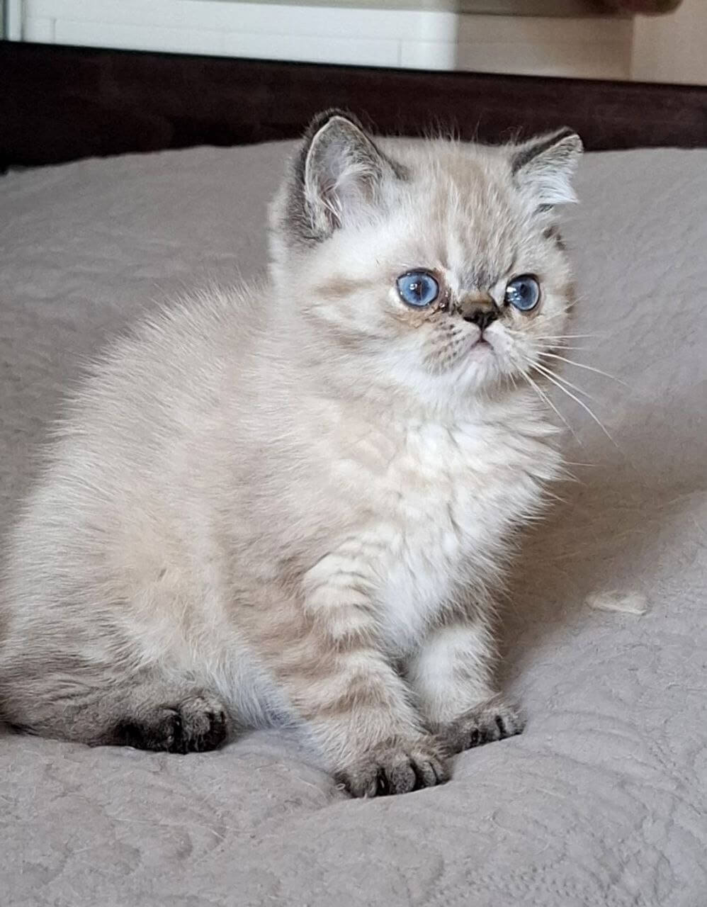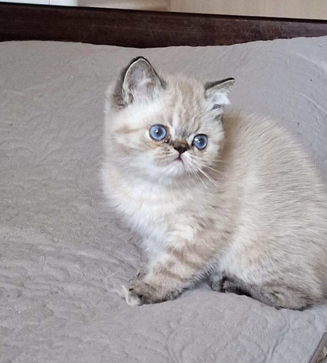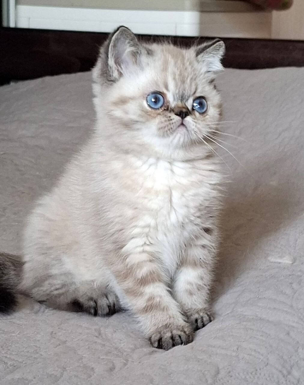 With one look into Jery’s glacial blue gaze, you’ll feel the calm gravity only a show-quality Seal Lynx Point Persian kitten brings. Her coat is astonishing—silky-soft, with creamy, snow-kissed fur tipped delicately in smoky seal hues. Each gentle stroke across her plush chest or cheek sends warmth straight to your heart.
