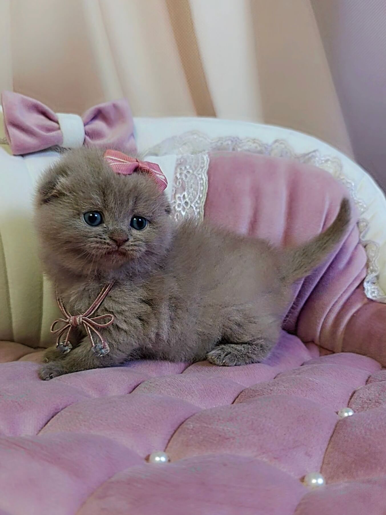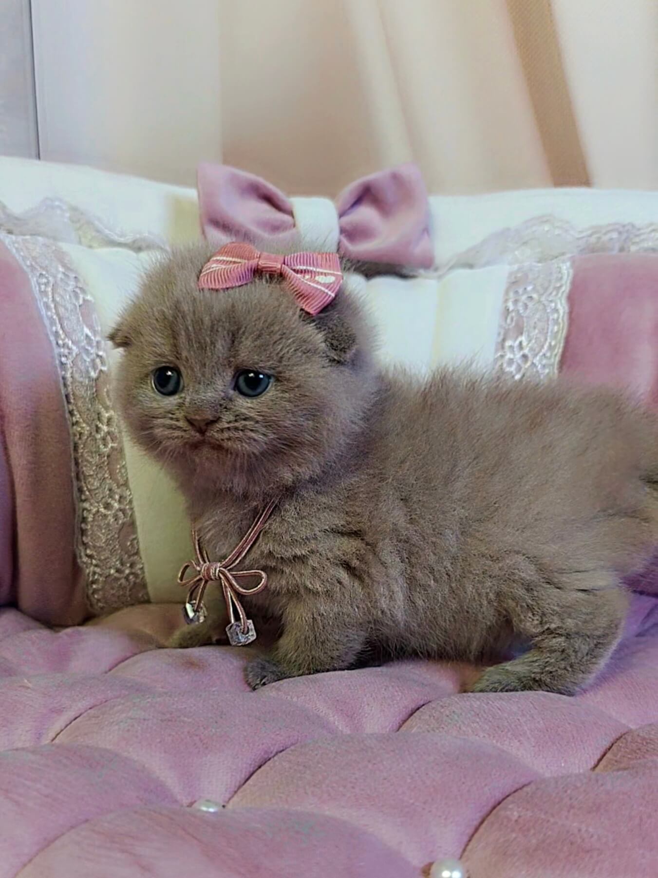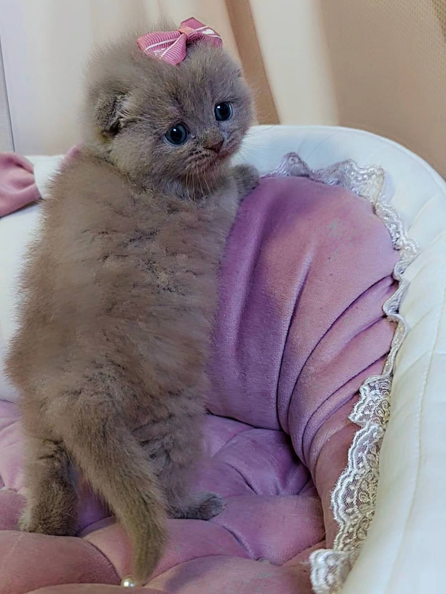 Jetta is a Lilac Scottish Fold kitten whose silken coat feels impossibly plush beneath your fingertips, inviting gentle strokes with every encounter. Her yellow eyes, set like amber drops, glow warmly in soft light and gaze up at you with steadfast curiosity. The gentle curve of her folded ears frames a darling face that promises constant company.