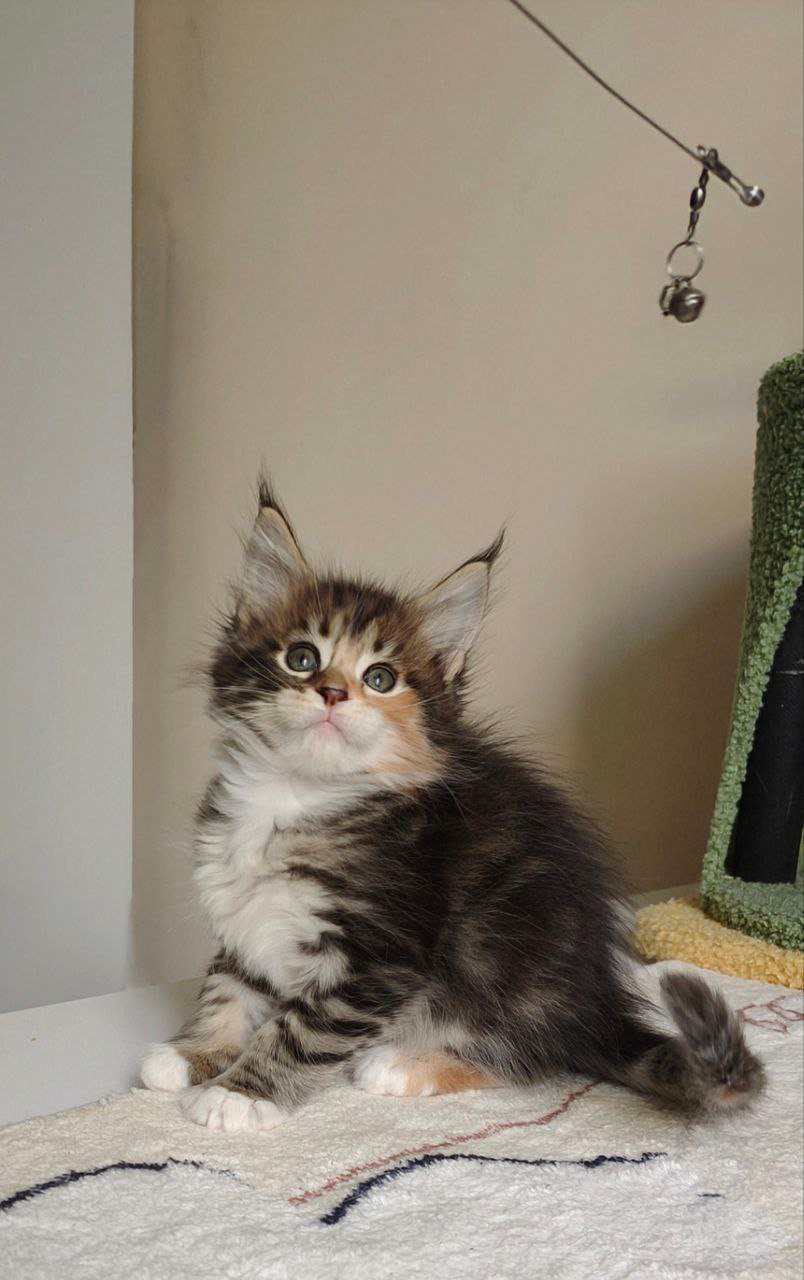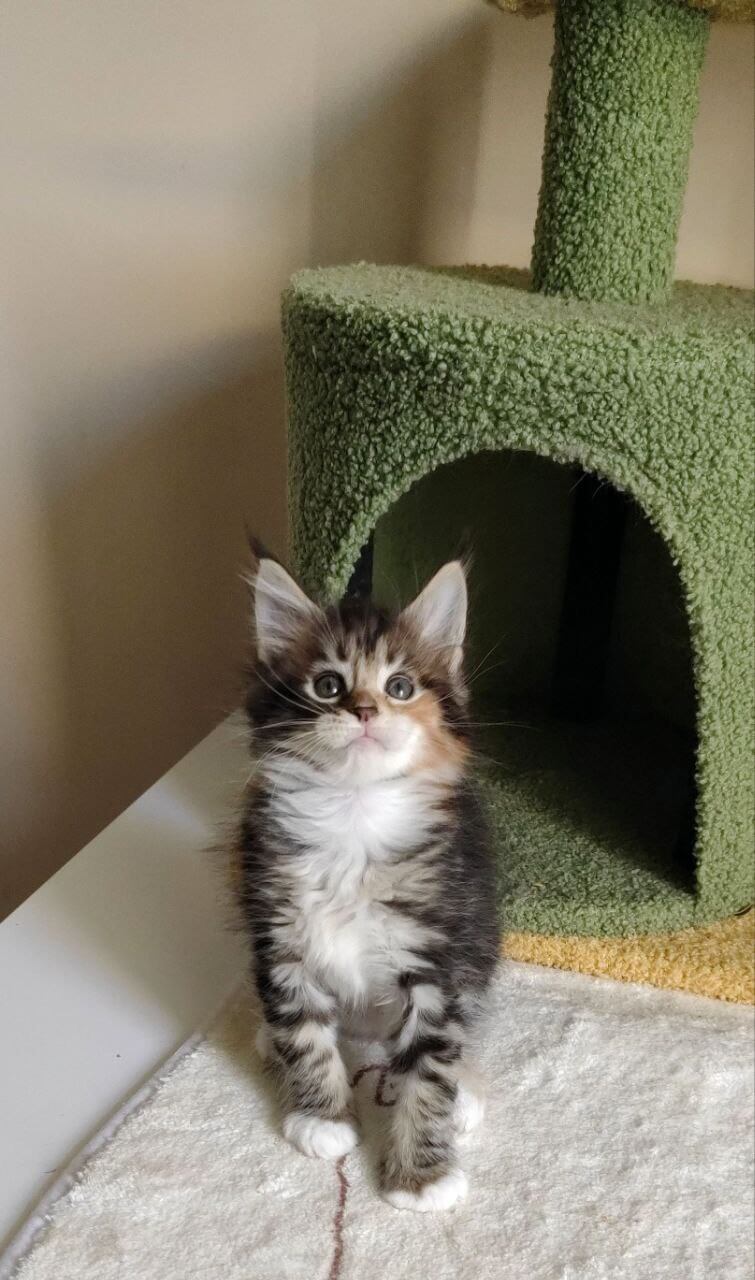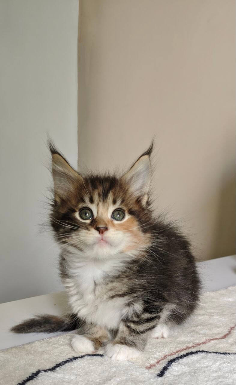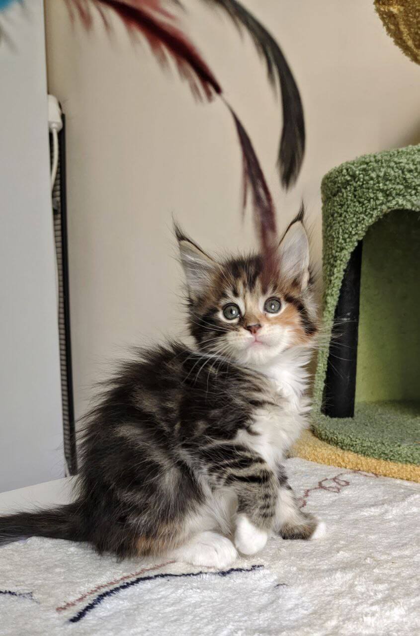 Meet Karina, our exquisite female Maine Coon with a stunning black tortie coat accentuated by patches of white. Her enchanting yellow eyes are sure to capture your heart. Born on August 14, 2025, Karina hails from champion bloodlines and is show quality, making her a true standout.