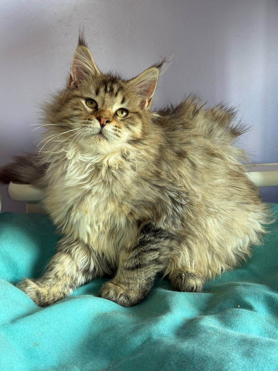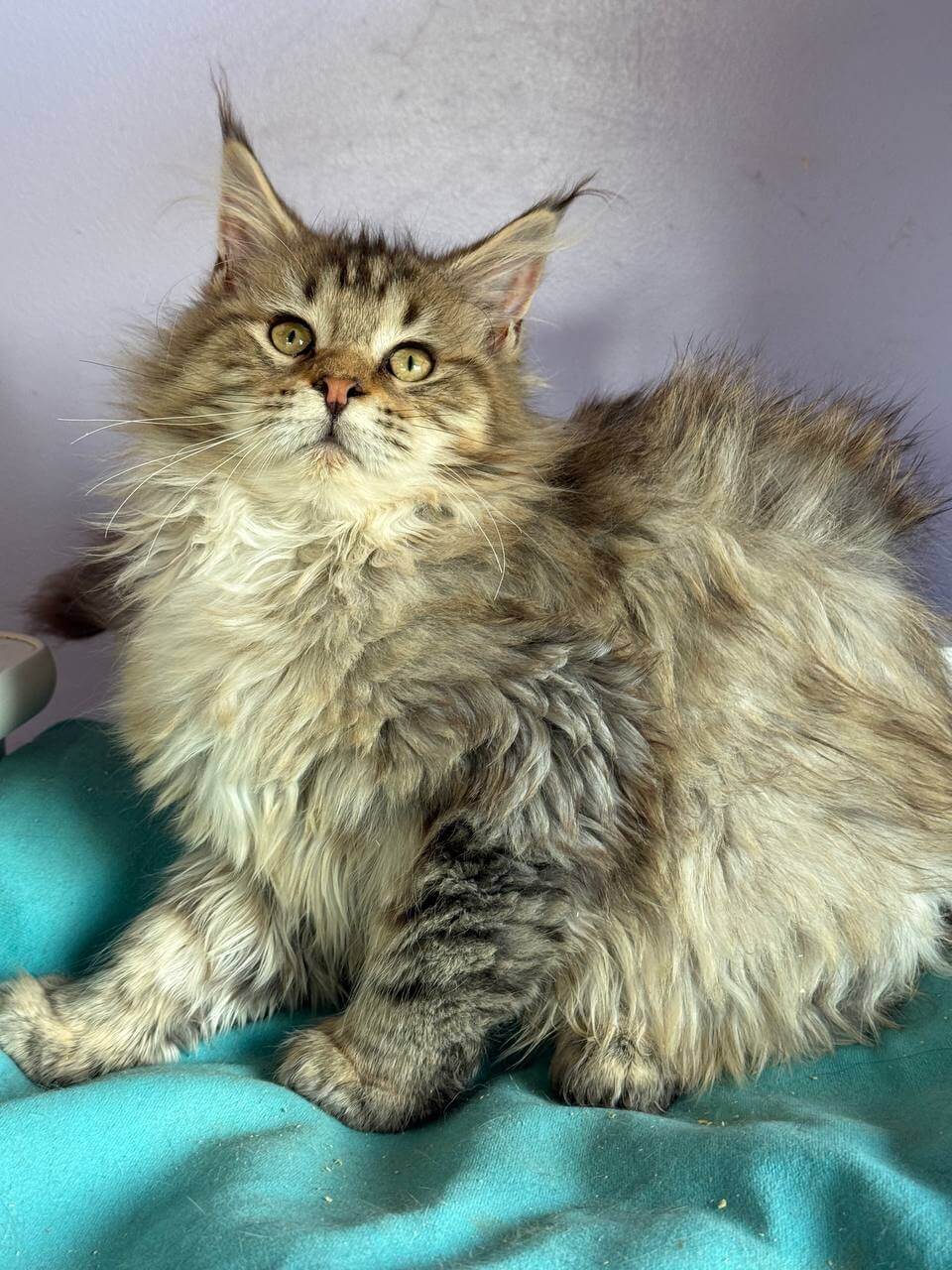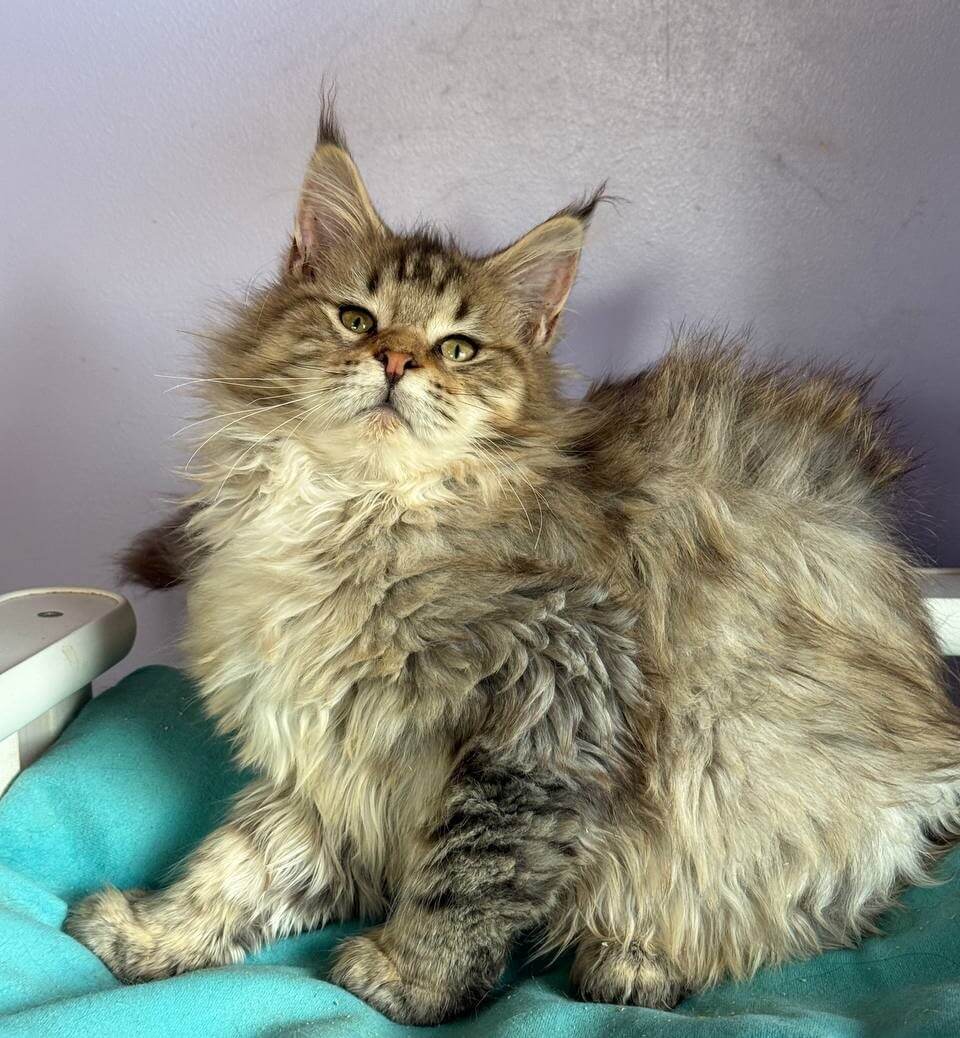 When you gently lift Katrin, her Black Tabby Spotted Maine Coon kitten coat feels luxurious—silky yet substantial under your fingers, with the signature plush ruff brushing your wrist. Her deep yellow eyes, flecked with amber, meet yours with an understanding far beyond her weeks. Under warm light, her dramatic black markings glow against a soft brown canvas.