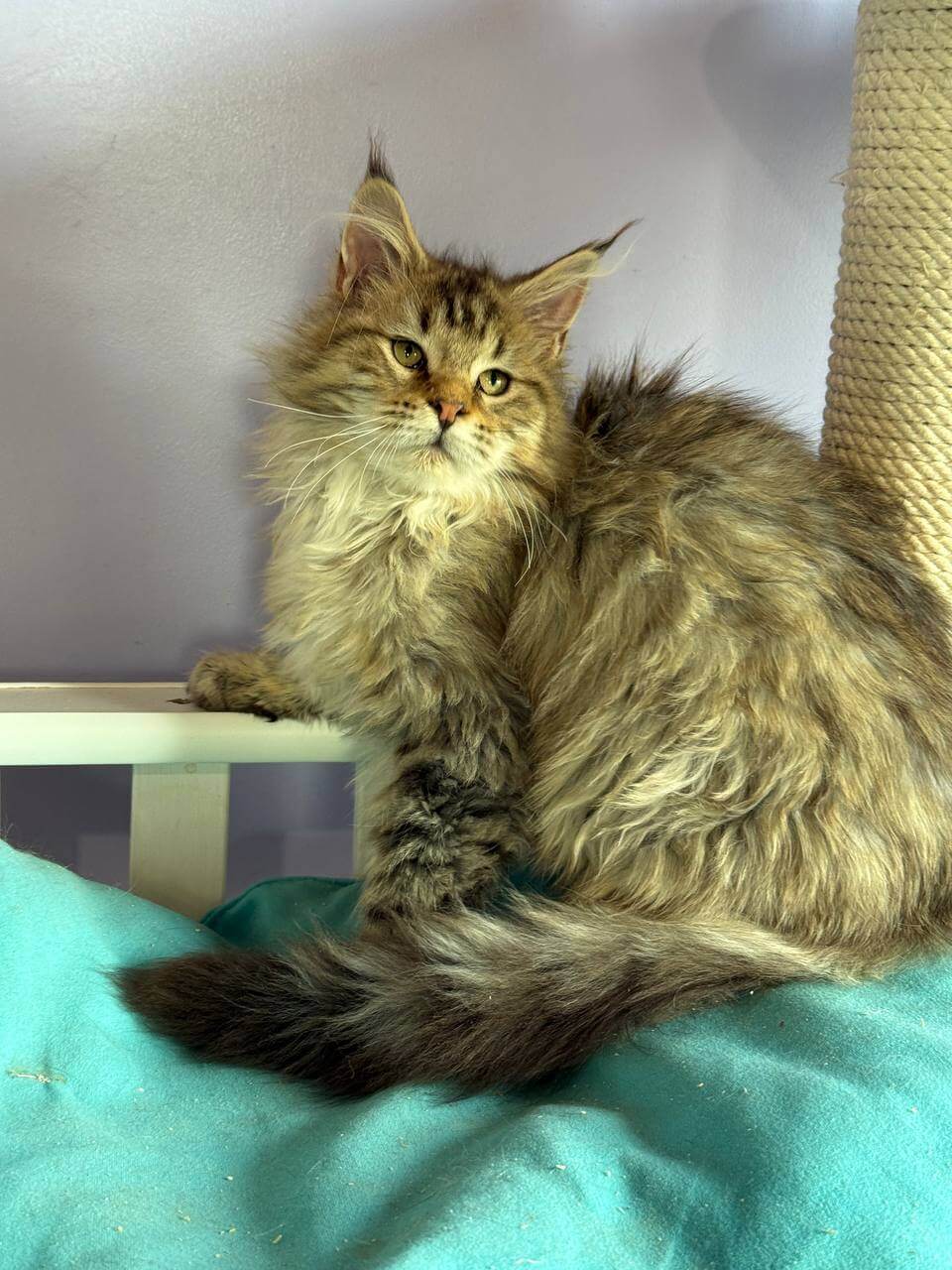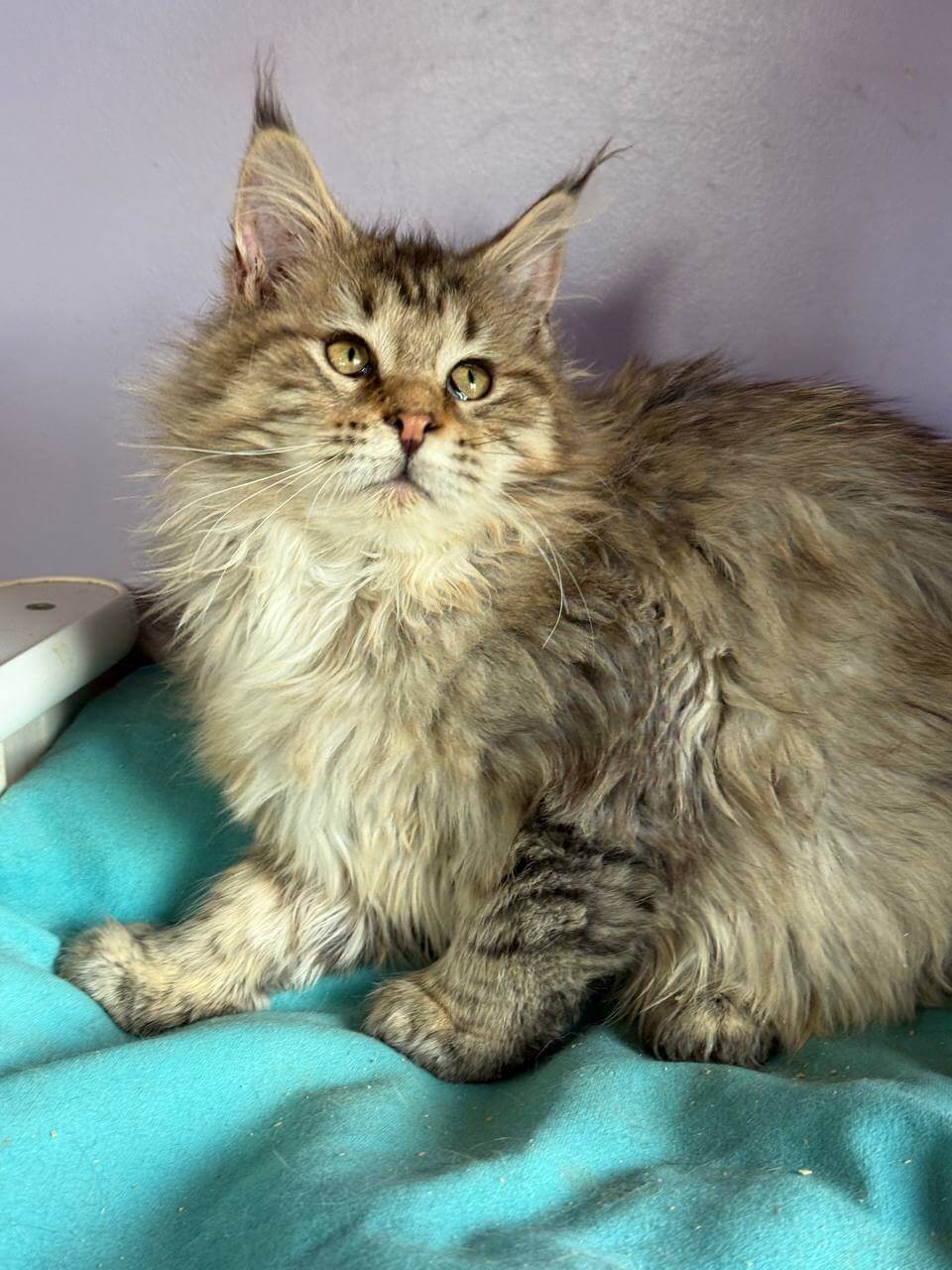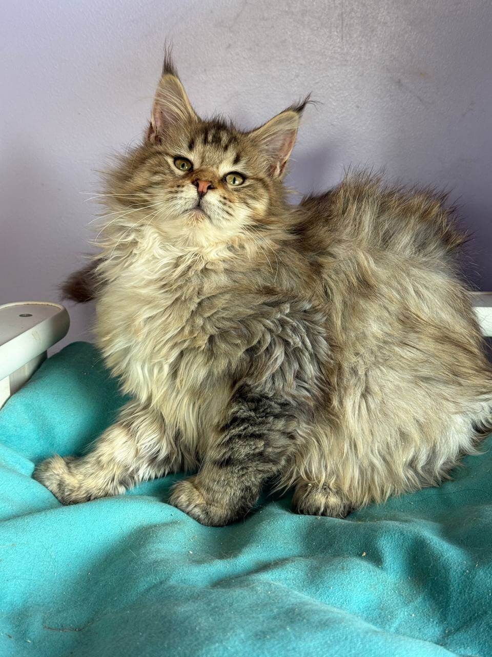 When you gently lift Katrin, her Black Tabby Spotted Maine Coon kitten coat feels luxurious—silky yet substantial under your fingers, with the signature plush ruff brushing your wrist. Her deep yellow eyes, flecked with amber, meet yours with an understanding far beyond her weeks. Under warm light, her dramatic black markings glow against a soft brown canvas.