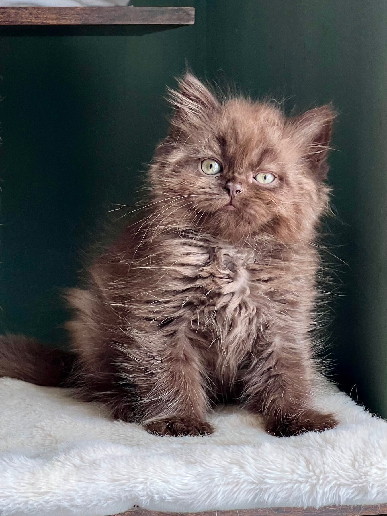 Meet Kay, a charming male Scottish Straight Highland kitten with a delightful chocolate coat and captivating yellow eyes. Kay was born on April 15, 2025, and comes from champion bloodlines, making him show quality. He’s ready to join his forever home on August 15, 2025. Located in Europe, he is available for reservation and can be delivered to the USA, with pick-up available at our Wood Dale location or delivery to other states from Chicago.