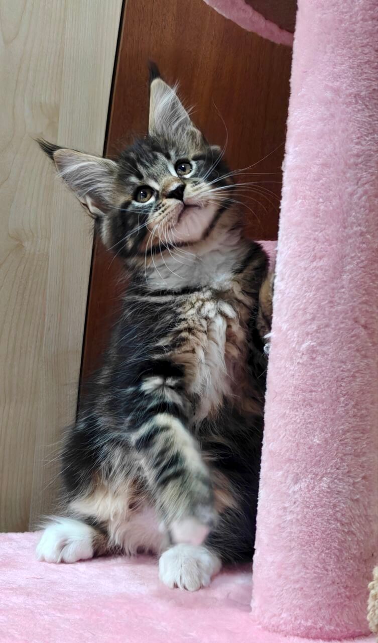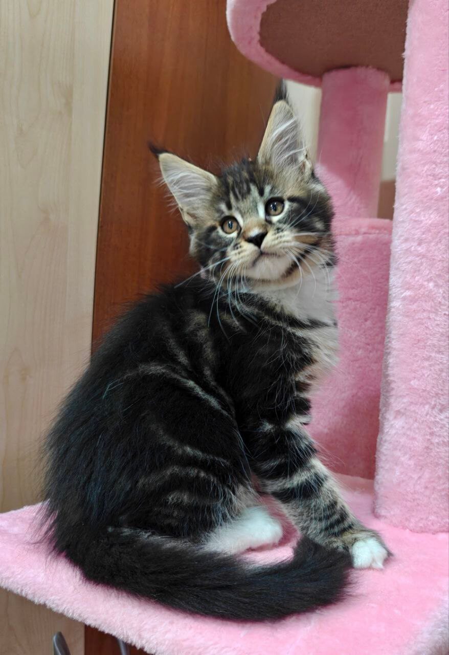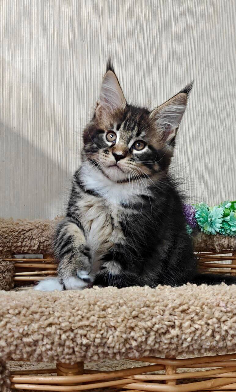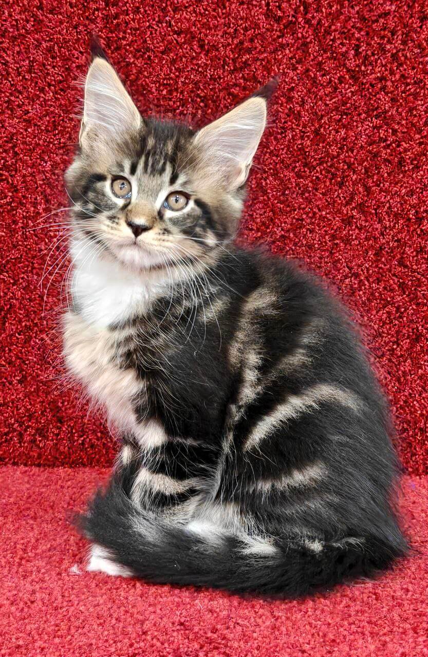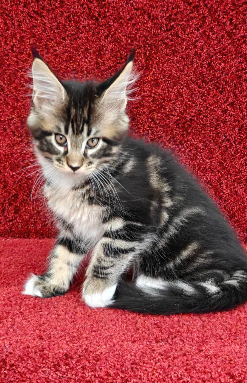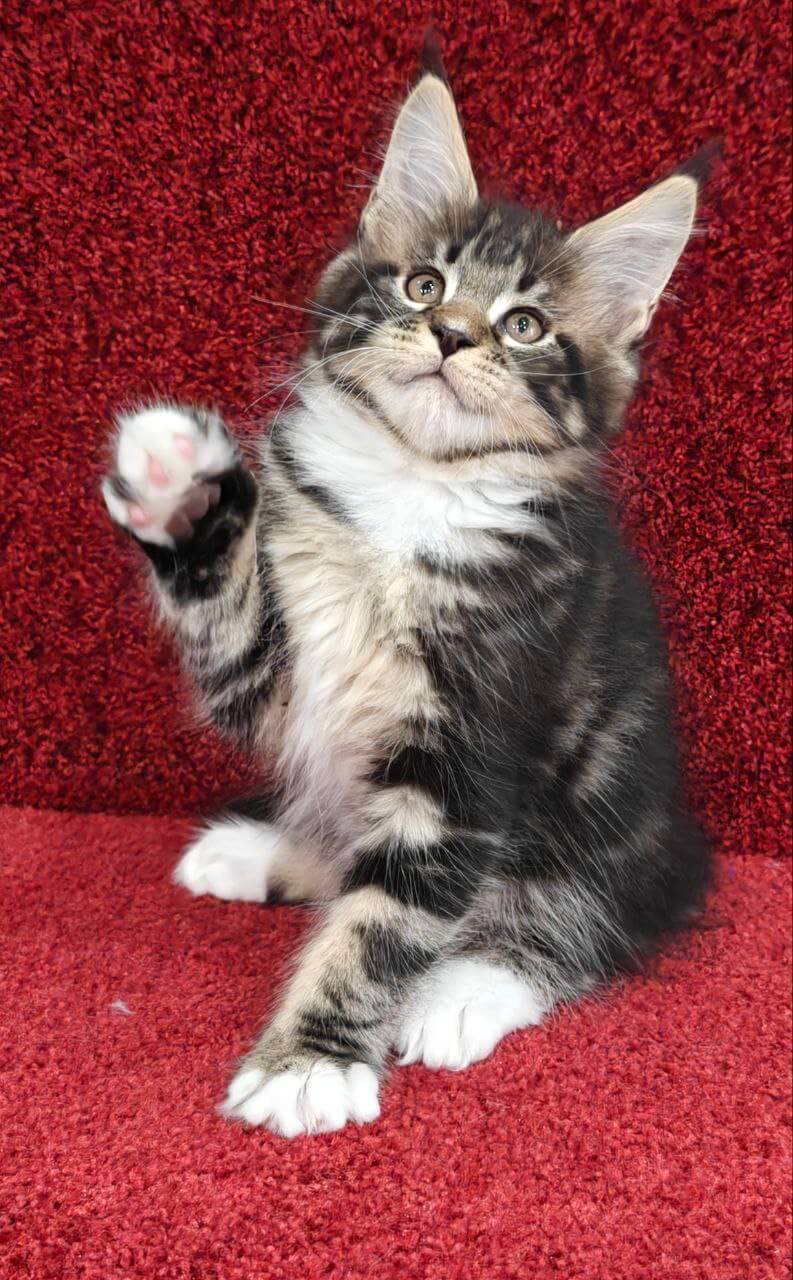 Meet Kelvin, an adorable male Maine Coon kitten with a striking black tabby blotched coat accented by white. His enchanting yellow eyes make him irresistibly charming. Born on August 14, 2025, Kelvin is bred from champion bloodlines and is of show quality. He will be ready to leave his breeder house on December 14, 2025, and will be neutered as a pet. Although located in Europe, Kelvin is available for reservation in the USA through our website. You can pick him up at our Wood Dale, USA location or arrange delivery from Chicago to other states. Kelvin comes with a conditional pedigree; please contact us for pricing. A $500 deposit is required to reserve him, with the final payment due upon pickup. Enjoy 7-day support to assist with all of Kelvin’s needs. Follow our Instagram for a sneak peek at our playful kittens and more!