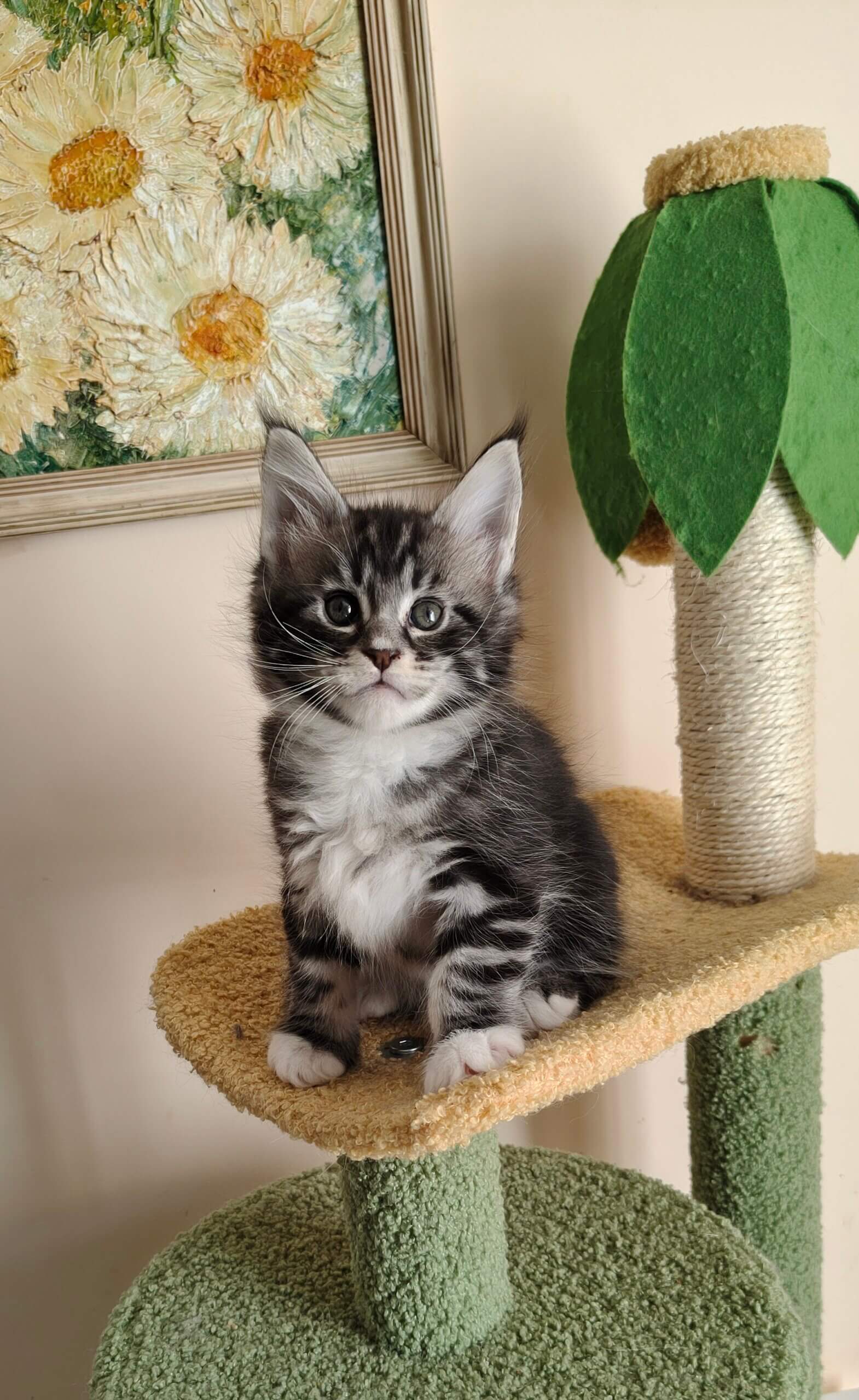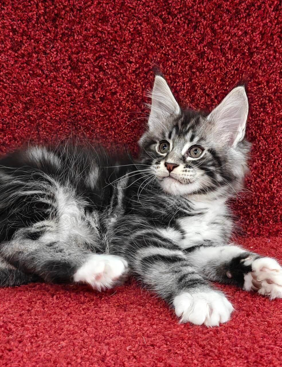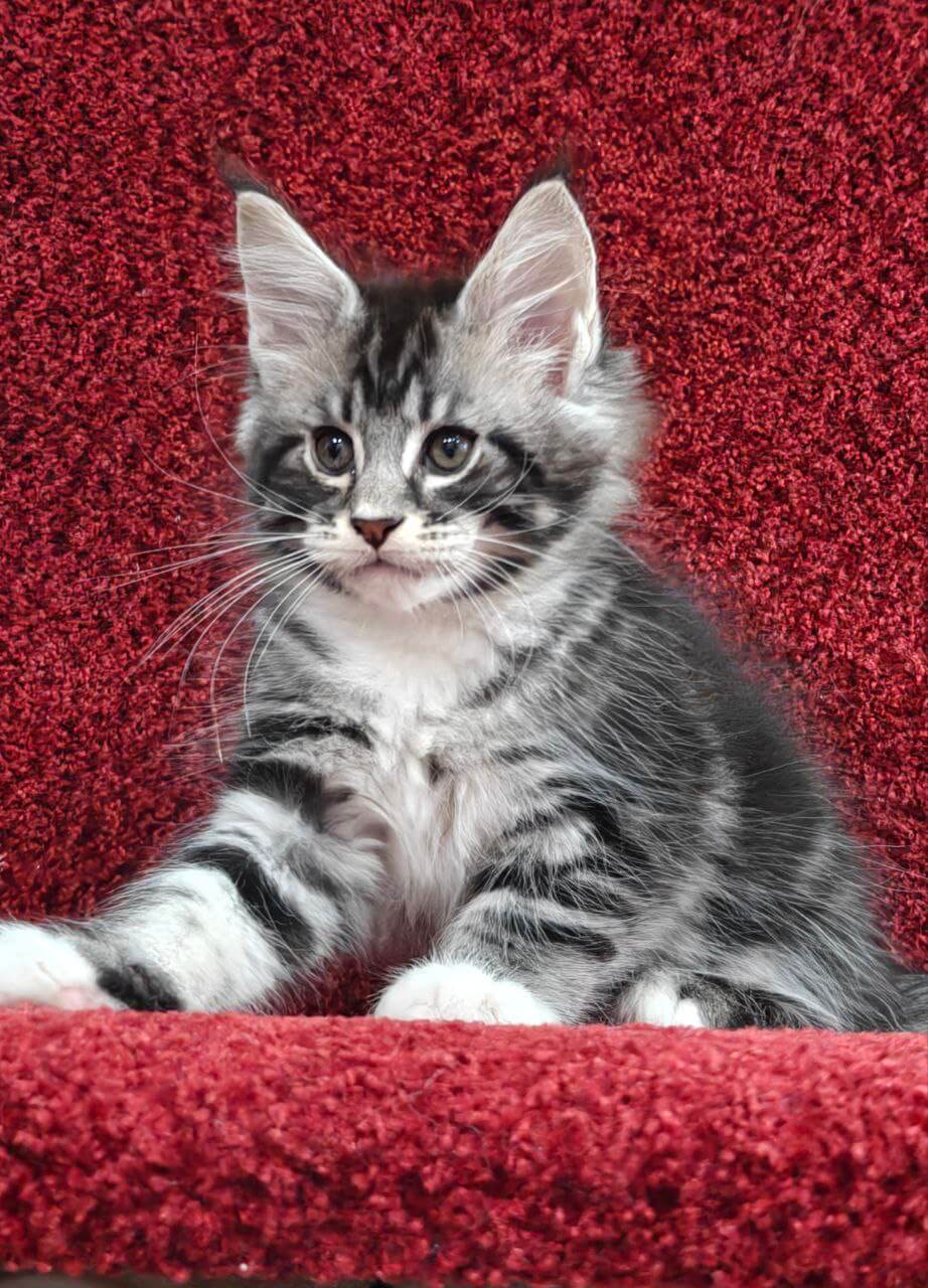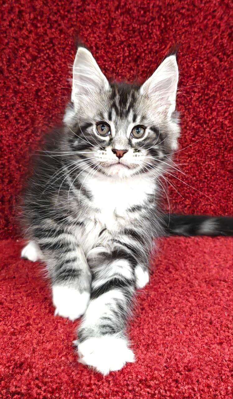 Meet Kent, a stunning male Maine Coon kitten available for sale. With his captivating black tabby blotched coat accented by white and striking yellow eyes, Kent is a show-quality kitten with champion bloodlines. Born on August 14, 2025, he will be ready to join his new family on December 14, 2025. Kent comes registered and can be reserved on our website for delivery in the USA from Chicago or picked up directly at our Wood Dale location. Kent is available as a pet and will be neutered/spayed upon request. For additional breeding rights, please inquire. A WCF pedigree is available for those interested. A $500 non-refundable deposit is required to reserve Kent. Rest assured, we provide 7-day support for all your kitten care needs. Contact us for more information!