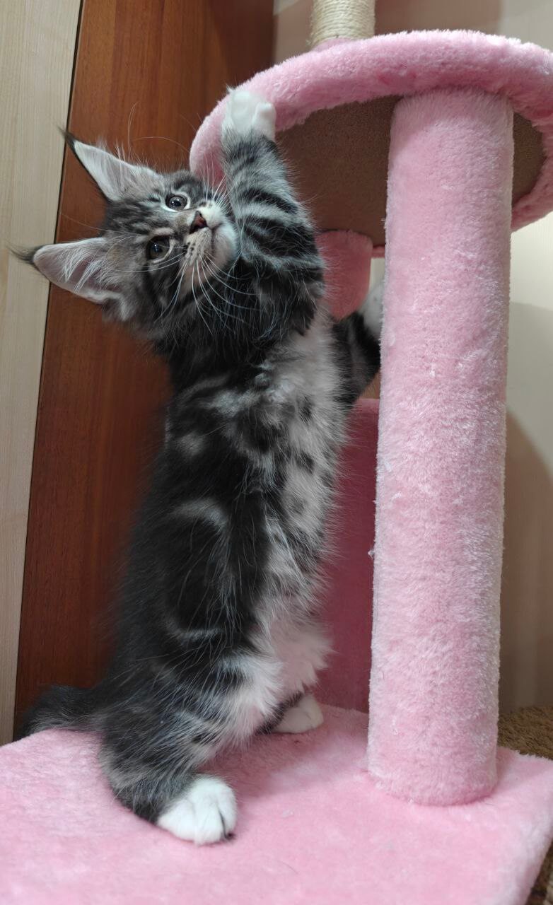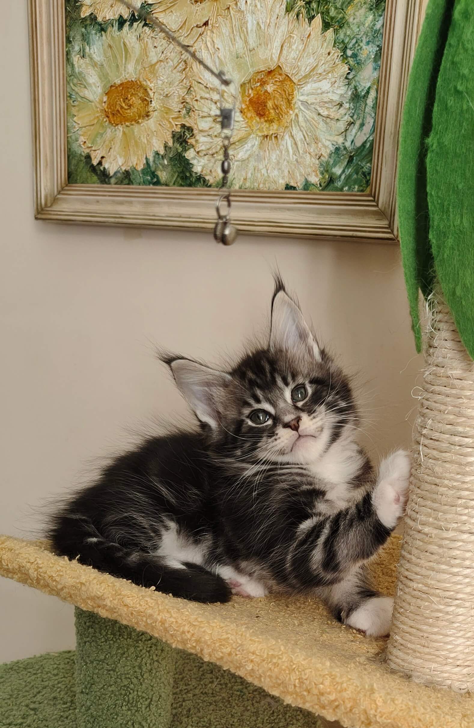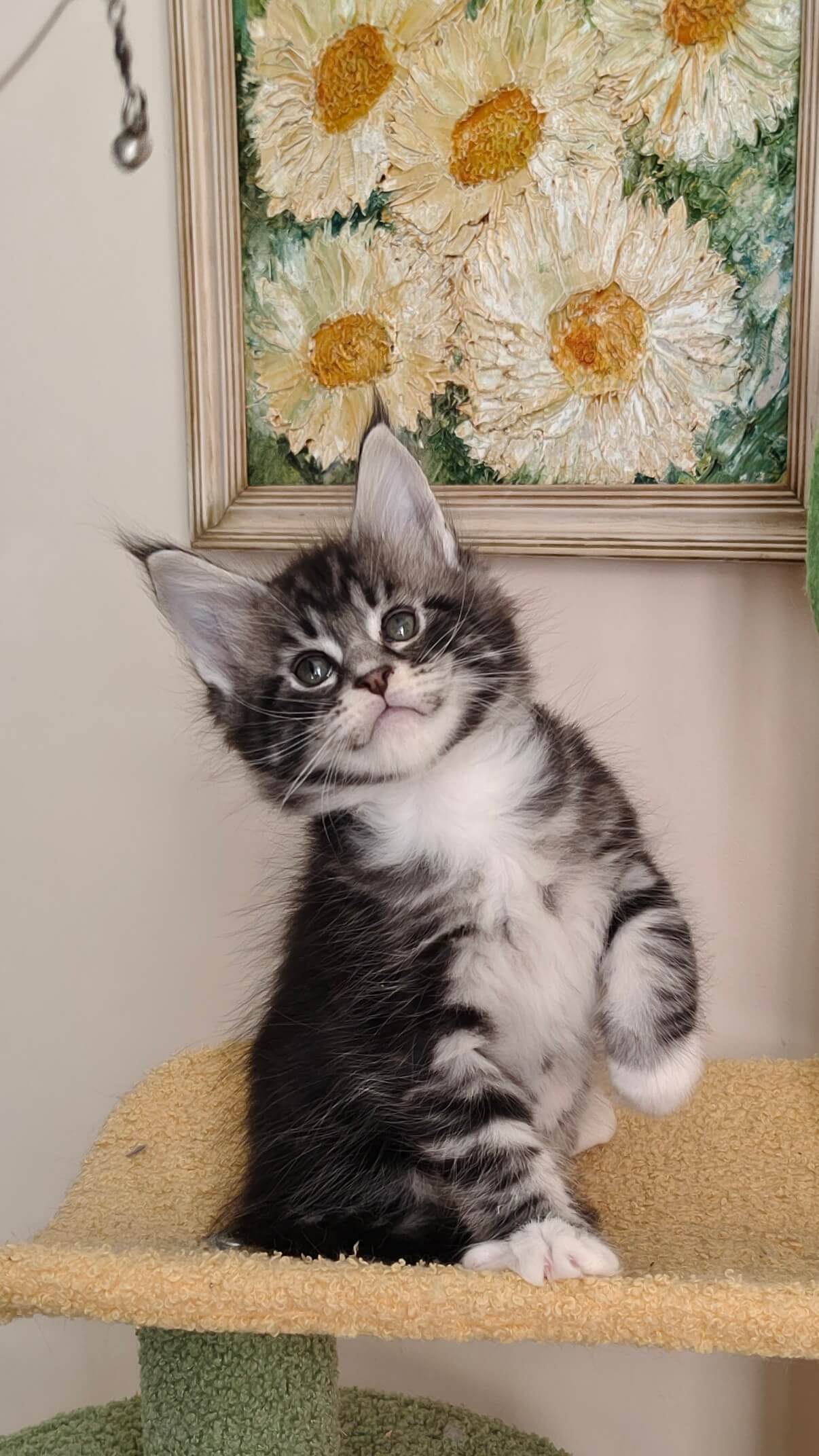 Meet Kent, a stunning male Maine Coon kitten available for sale. With his captivating black tabby blotched coat accented by white and striking yellow eyes, Kent is a show-quality kitten with champion bloodlines. Born on August 14, 2025, he will be ready to join his new family on December 14, 2025. Kent comes registered and can be reserved on our website for delivery in the USA from Chicago or picked up directly at our Wood Dale location. Kent is available as a pet and will be neutered/spayed upon request. For additional breeding rights, please inquire. A WCF pedigree is available for those interested. A $500 non-refundable deposit is required to reserve Kent. Rest assured, we provide 7-day support for all your kitten care needs. Contact us for more information!
