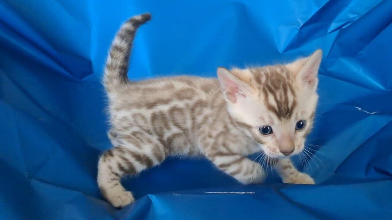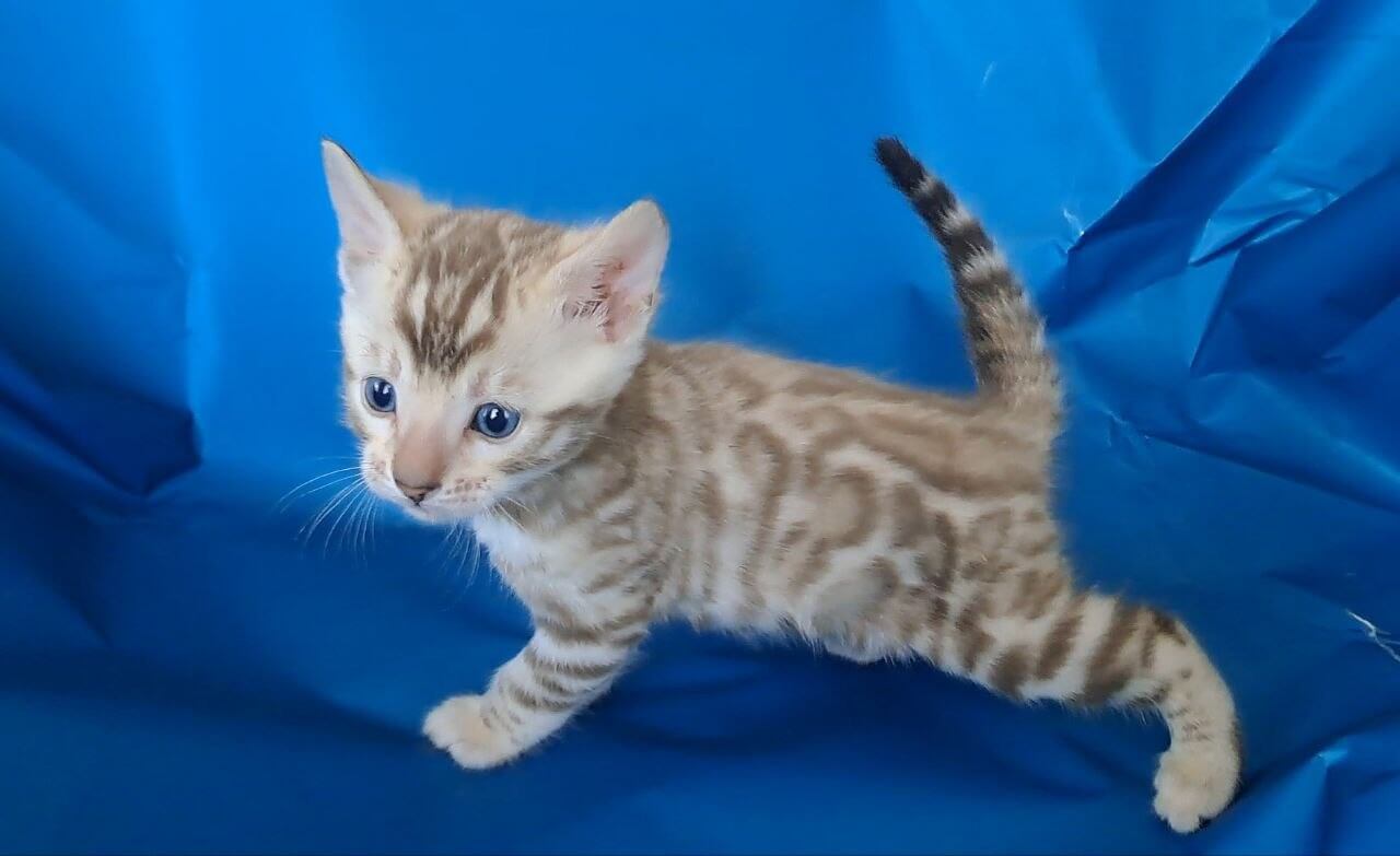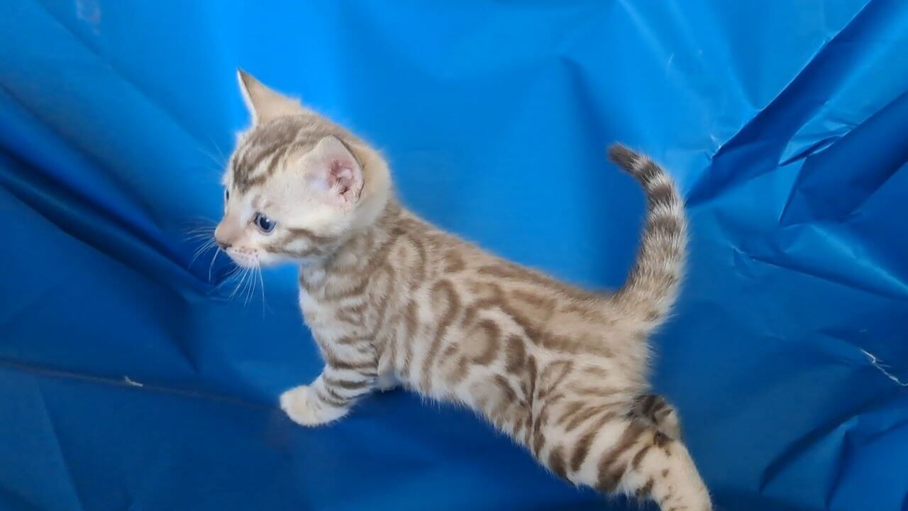 Sleek as velvet and kissed with dazzling black spots, Kevin is a Black Spotted Mink Bengal kitten whose plush coat begs to be stroked. His blue eyes glow with intelligence, reflecting the hue of early morning clouds. When you hold Kevin, he nestles close, radiating gentle warmth and a sense of utter contentment in your arms.