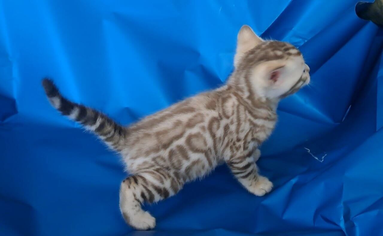 Clever and athletic, Kevin’s curious Bengal nature shines through in every move. He’ll greet you with a trilling meow, tail curled high, ready to explore the room’s every secret. At play, he leaps and spirals after wand toys, but dozes curled on your chest, soft paws kneading against your shirt. This is the kitten who learns your routines—and joins them.