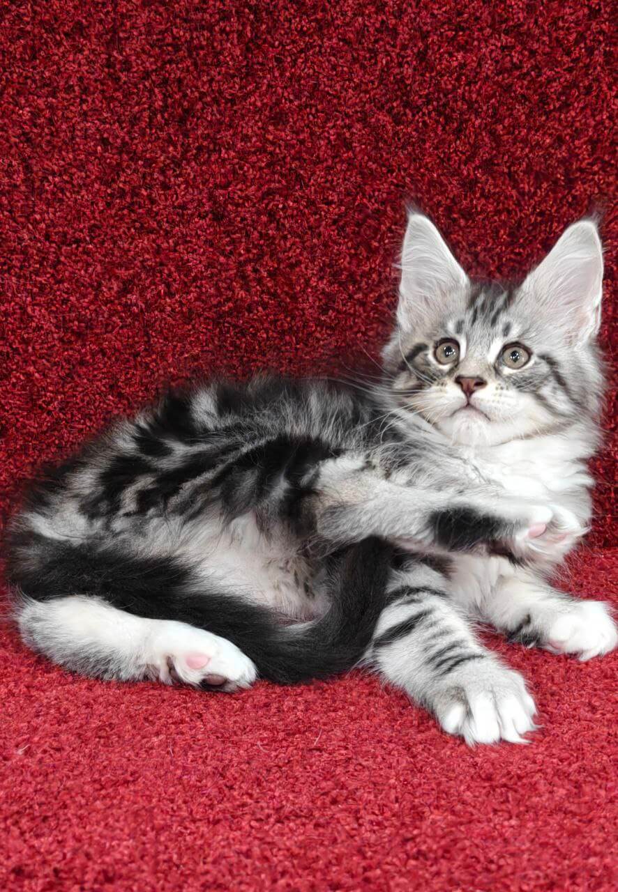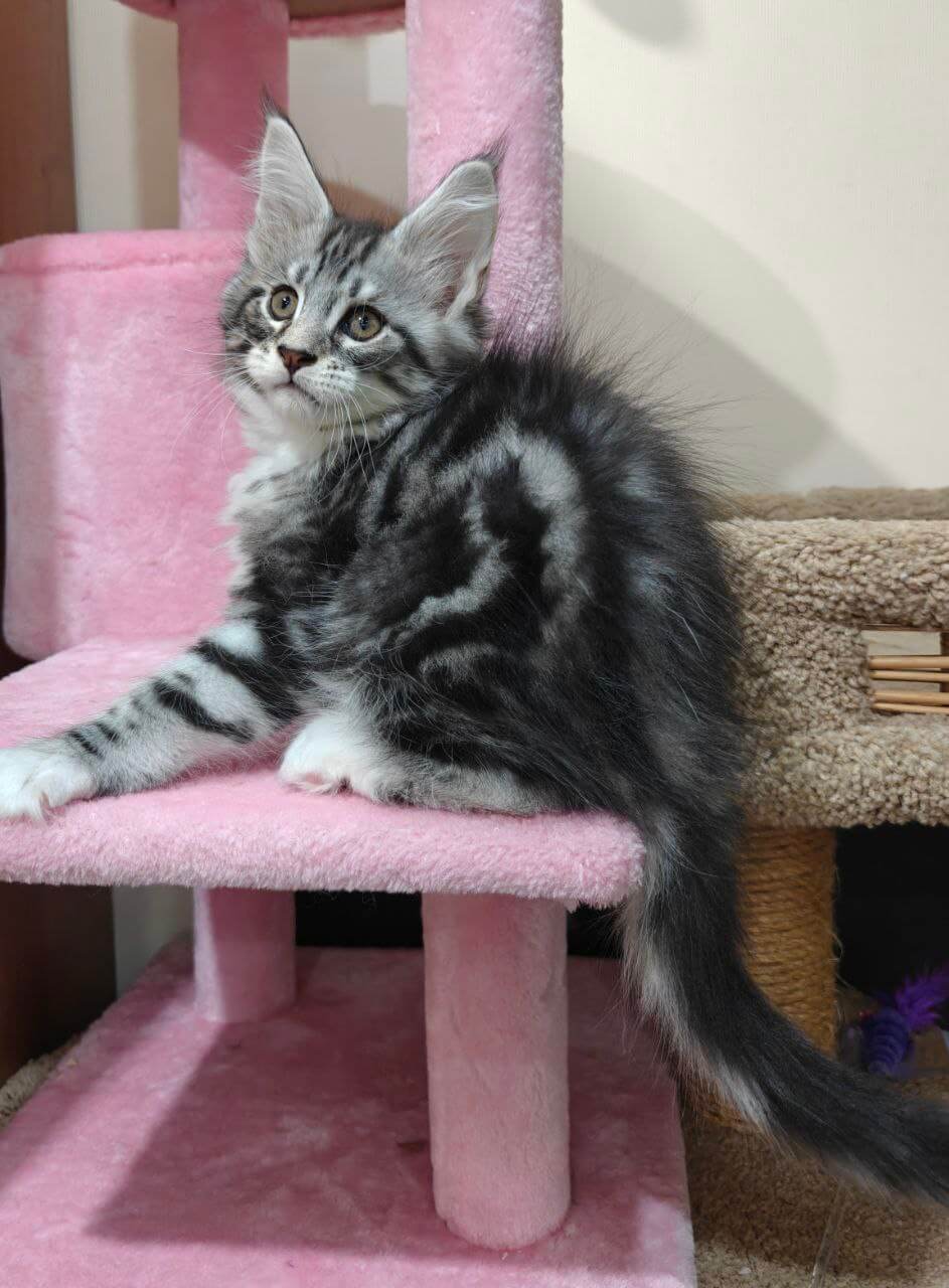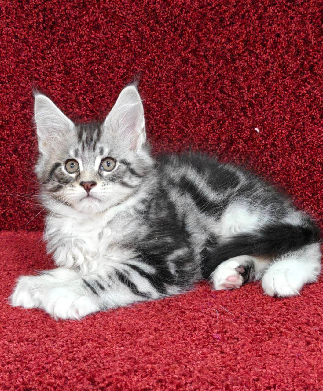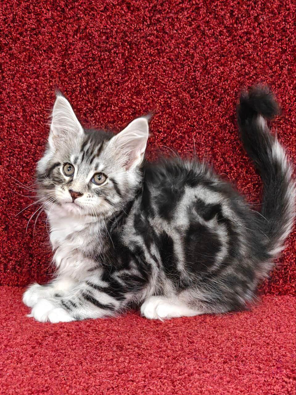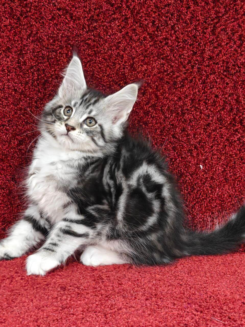 From the moment Kimberly looks up at you with his golden-yellow eyes, you’ll know you’ve found a lifelong friend. This stunning Maine Coon boy is the very picture of feline majesty—his luxurious black silver tabby coat glimmers with delicate white, soft to the touch and perfect for cozy cuddles. Kimberly is everything you dream a Maine Coon could be: calm, loyal, irresistibly affectionate, and always ready for play or a comforting snuggle.
