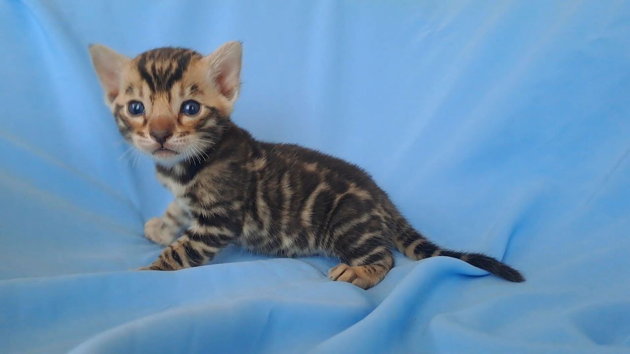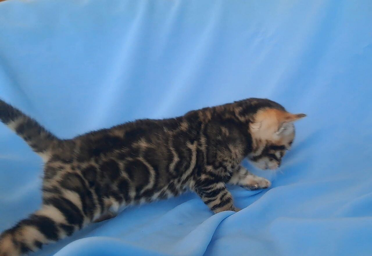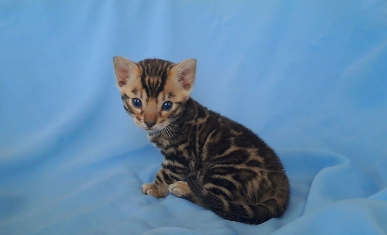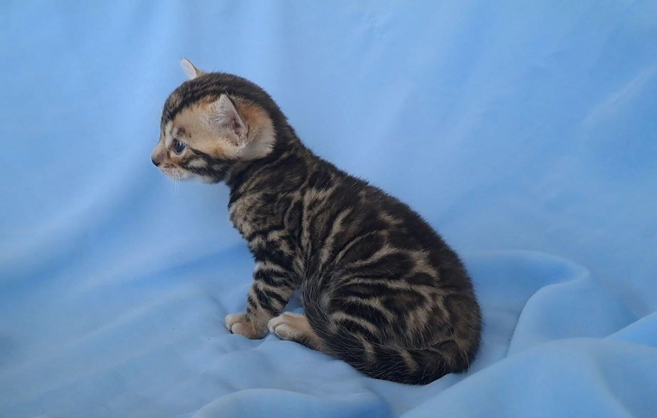 Hold King in your arms and experience the velvet silk of his Black Spotted Bengal kitten coat, each spot vivid against a backdrop of midnight. His yellow eyes shimmer with gold as they meet your gaze, sparkling with curiosity and a dash of wild promise. The subtle rumble of his purr warms your chest as he settles in.