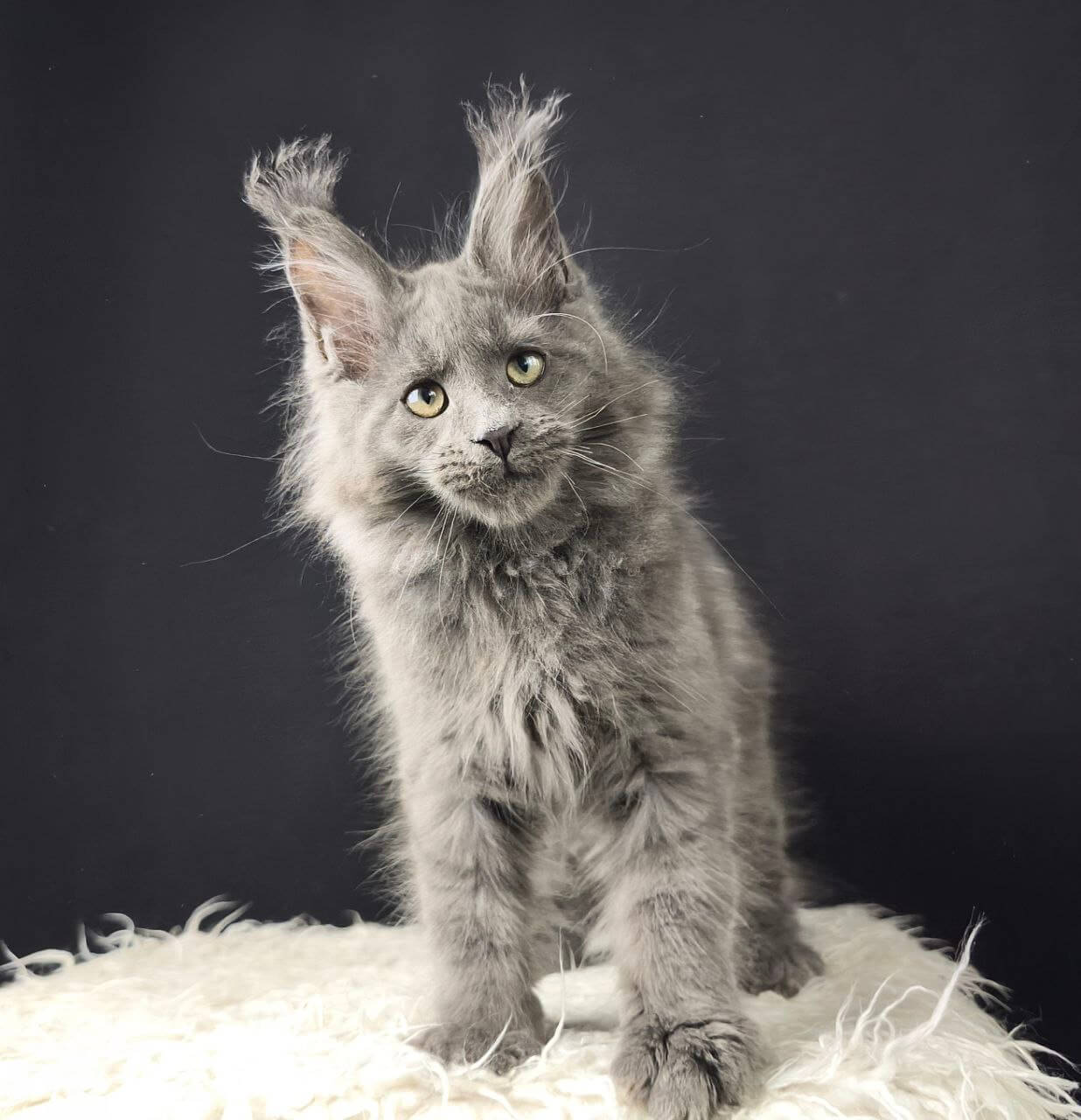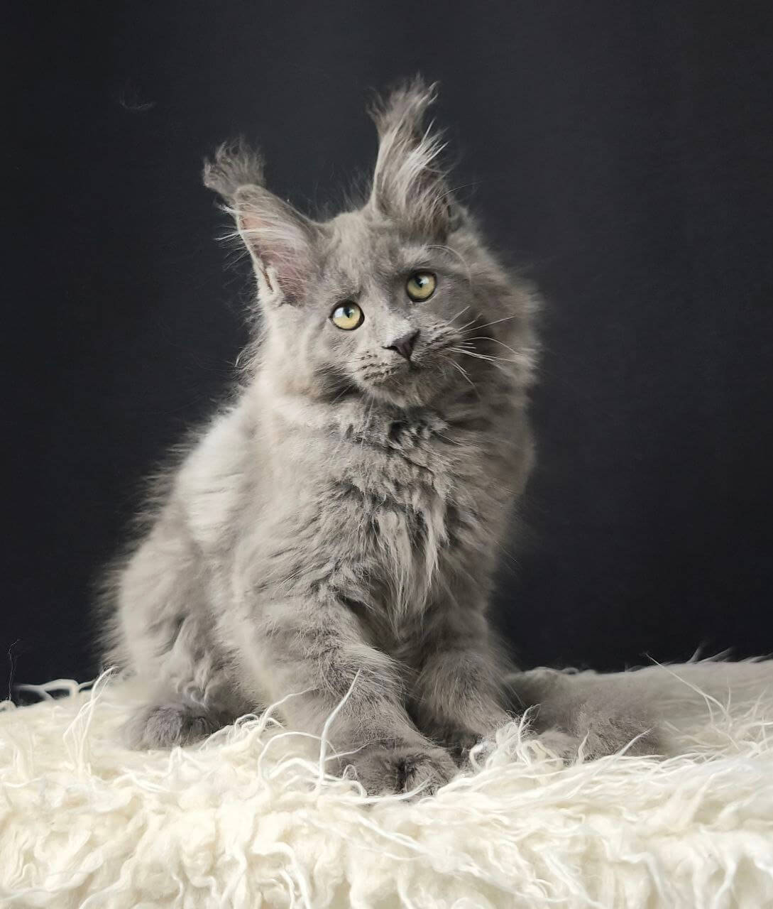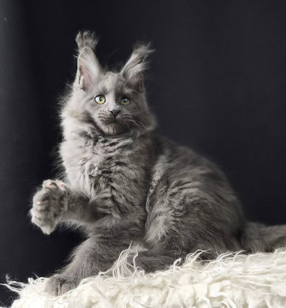 Meet Kioto – your blue-silver Maine Coon daydream come true, ready to fill your arms and heart with gentle purrs and golden gazes.