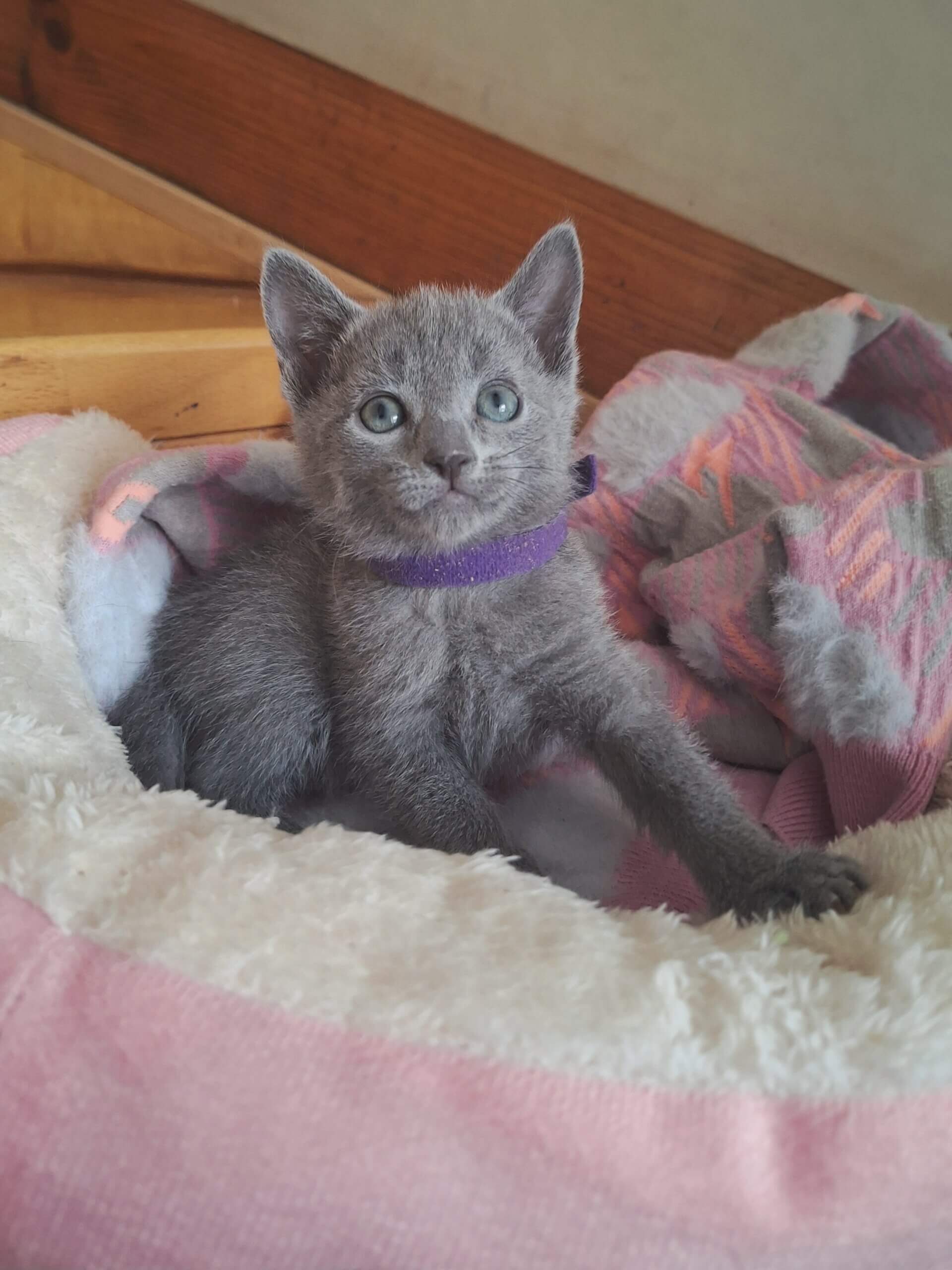 Blue Russian Blue kitten Kira is instantly captivating with her plush, silvery-blue coat so silky it begs to be stroked. When she meets your gaze, her luminous green eyes are both serene and deeply attentive, flickering with curiosity. The gentle heft of Kira in your arms brings warmth, as she purrs softly, completely at ease in your presence.
