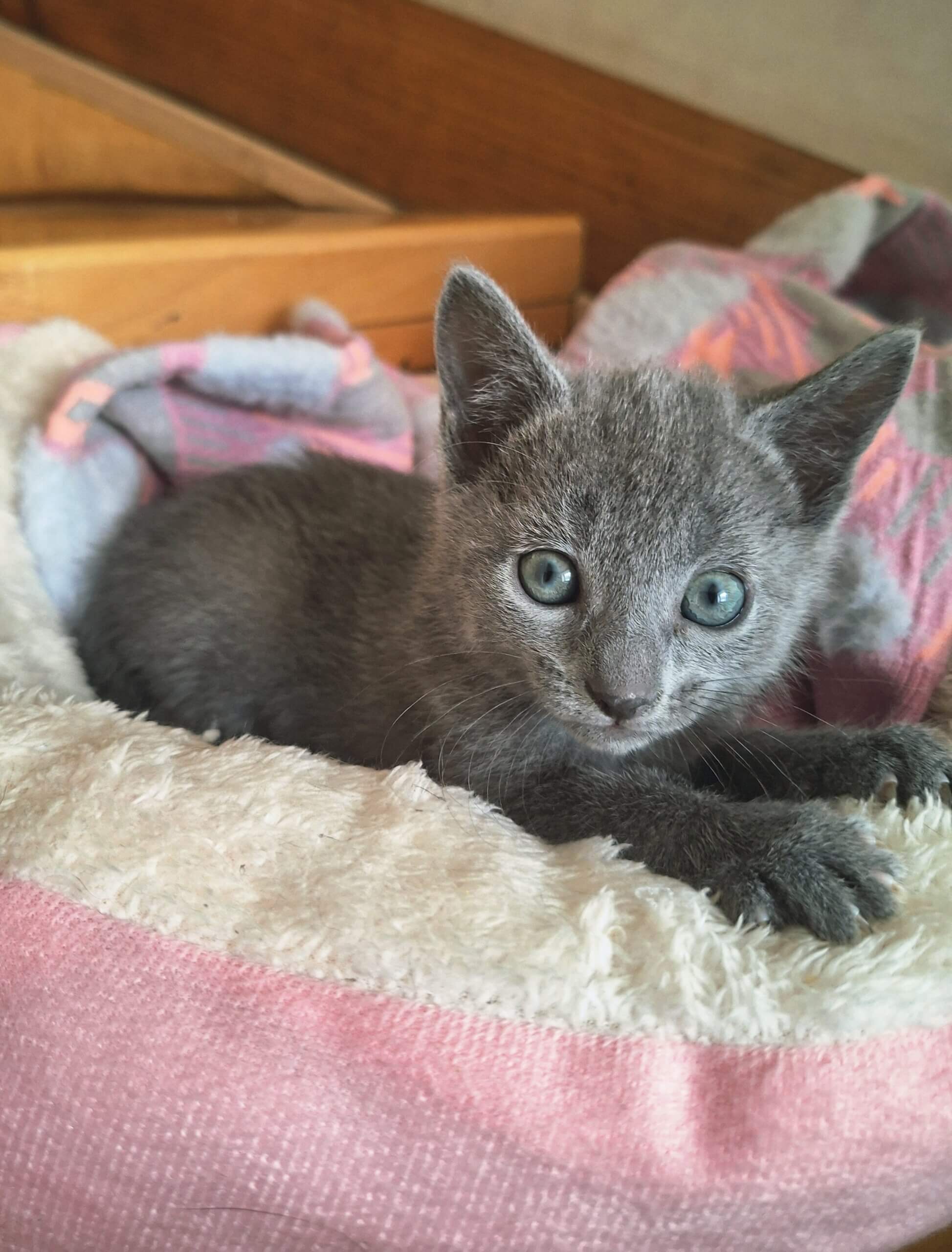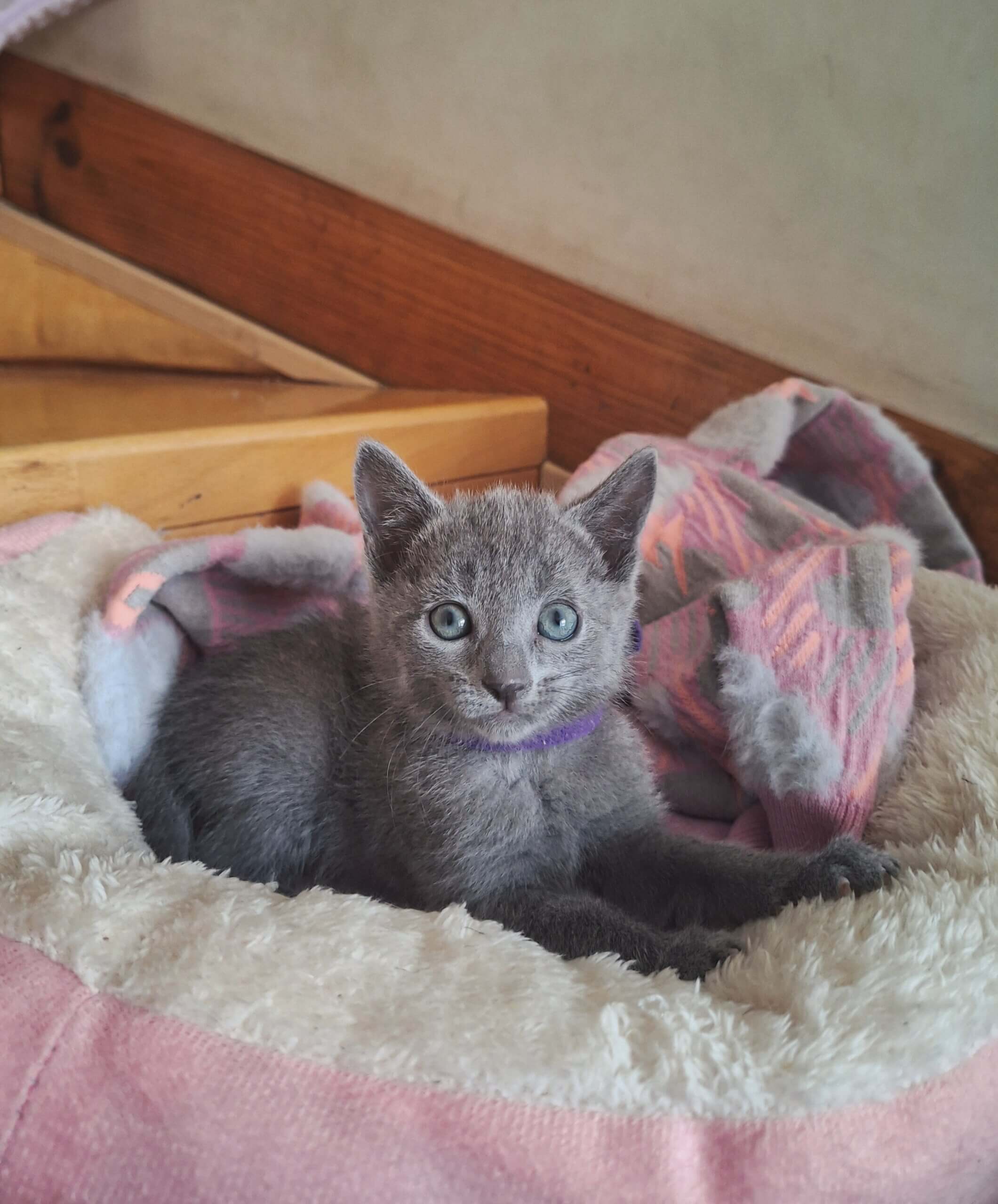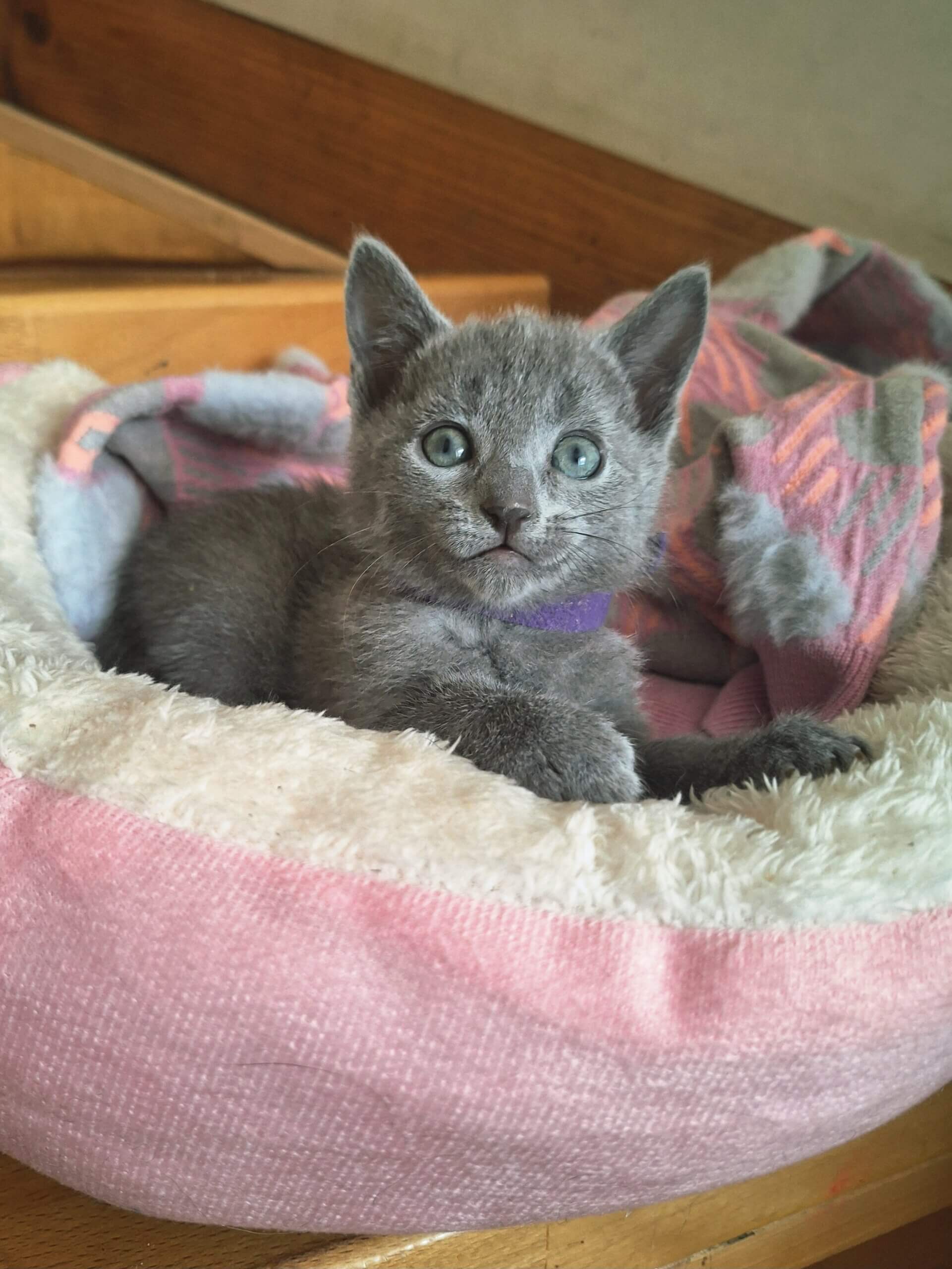 Kira is the type of Russian Blue who greets you with a delicately arched back and melodic trill when you return home, weaving around your ankles in quiet greeting. At play, she moves silently except for her little paws batting feather toys with precision, yet at night, Kira curls beside you with loyal, still devotion, always reserving her softest purrs for your touch.