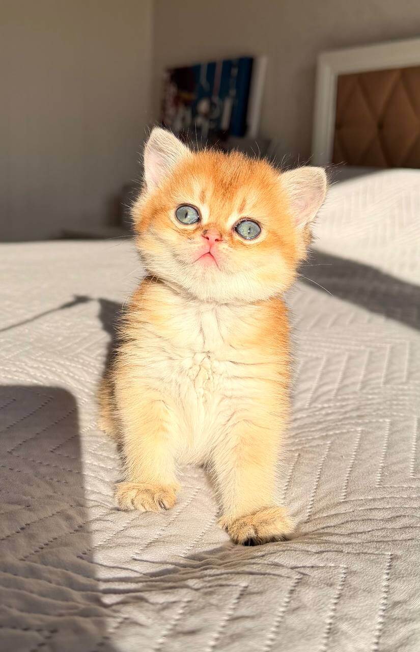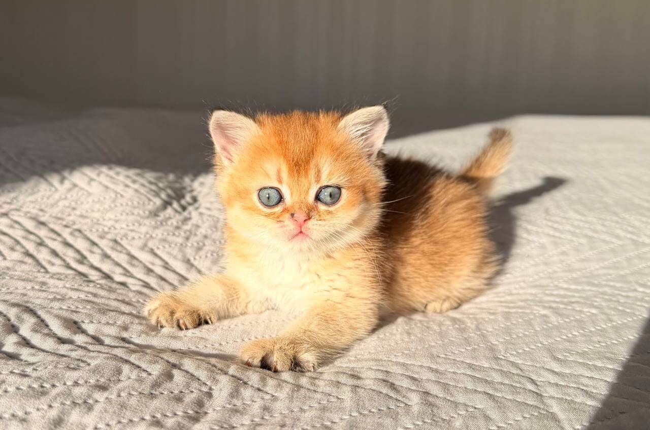 Nestled in your arms, Kitty’s Black Golden Shaded coat feels plush and decadent, every strand shimmering with sun-kissed warmth. Her green eyes are deep and lively, seeming to spark with curiosity whenever you meet her gaze. With signature round cheeks and a sturdy, velvet-soft presence, Kitty brings the unique charm of a Black Golden Shaded Scottish Straight kitten to life.