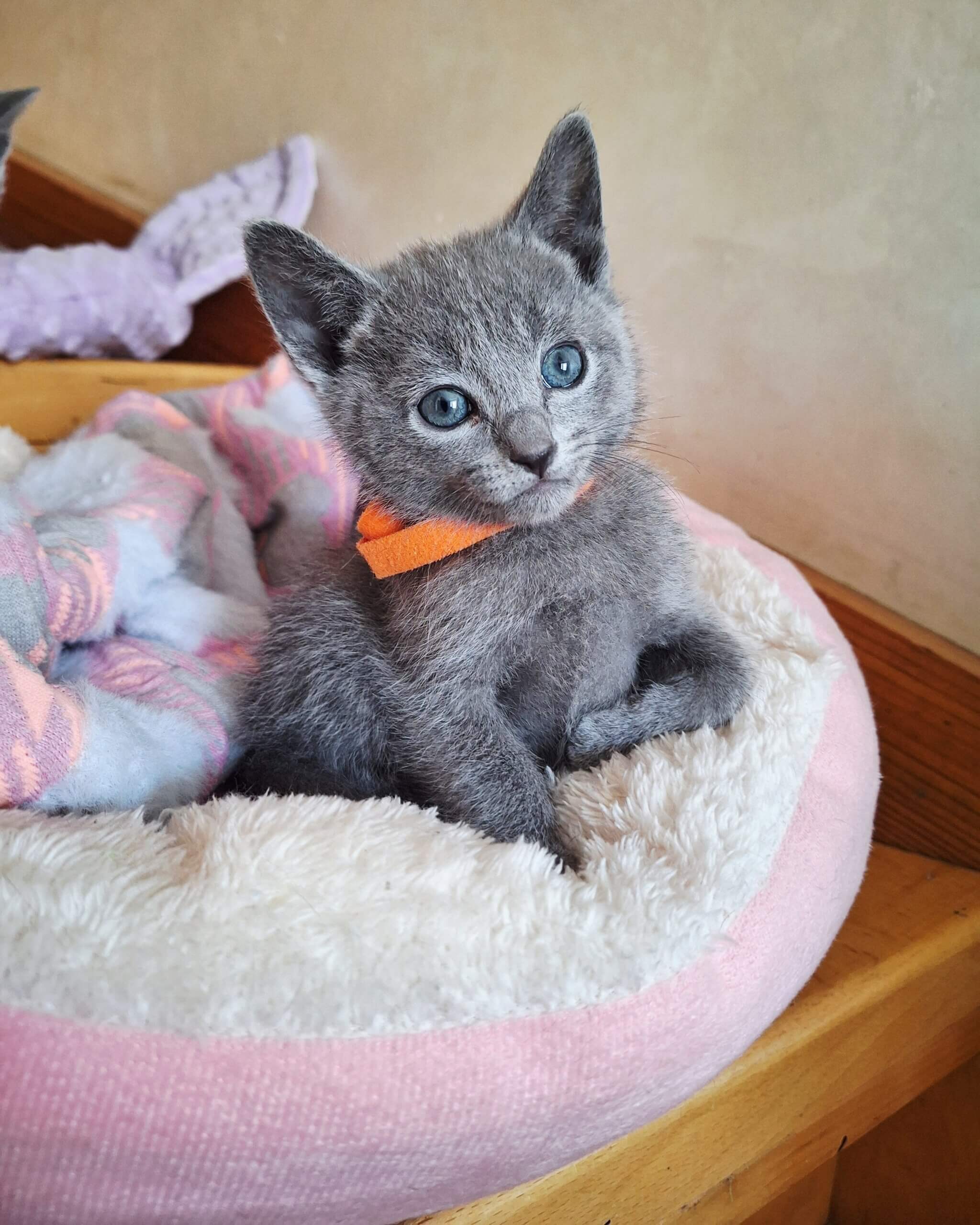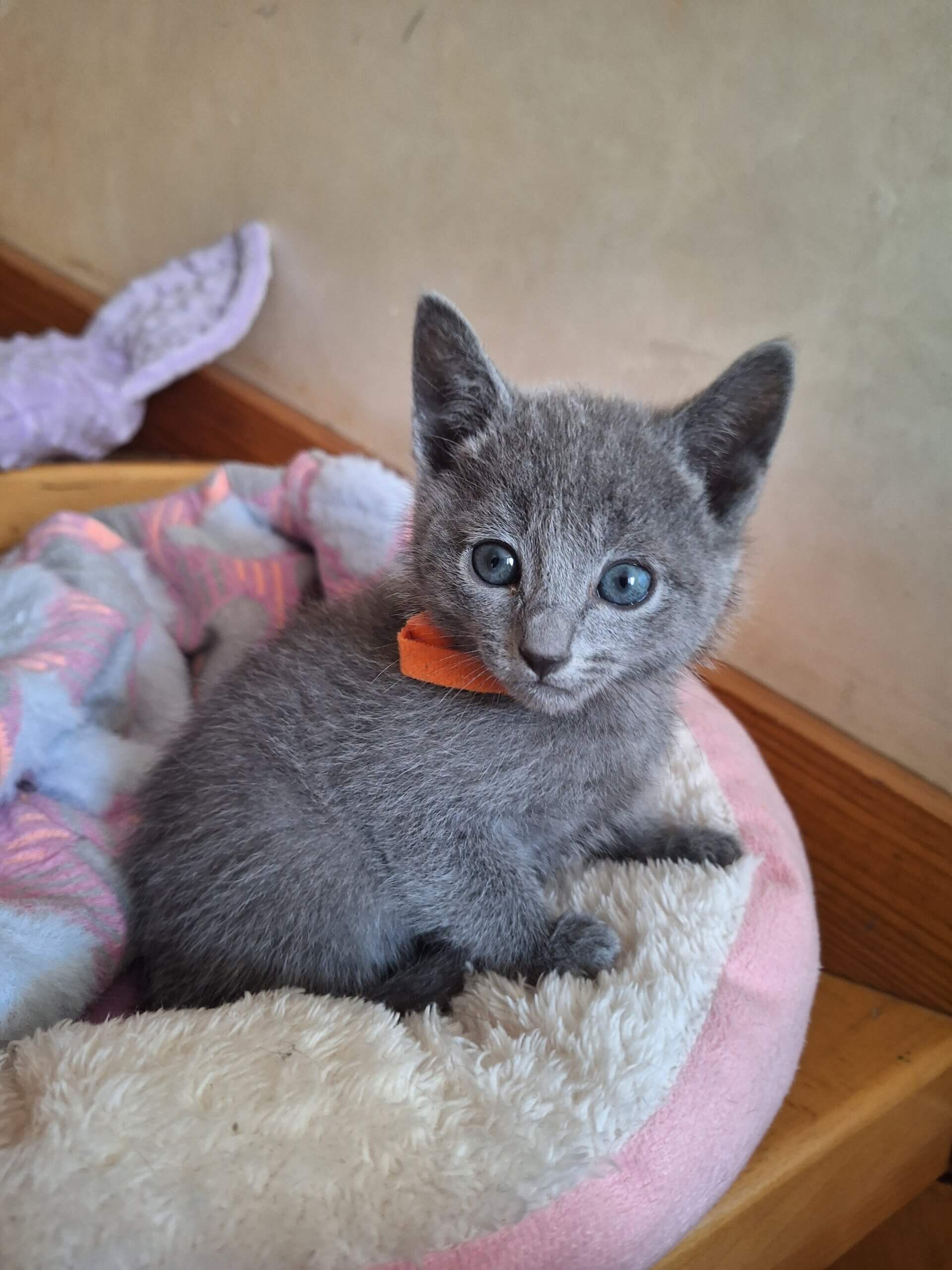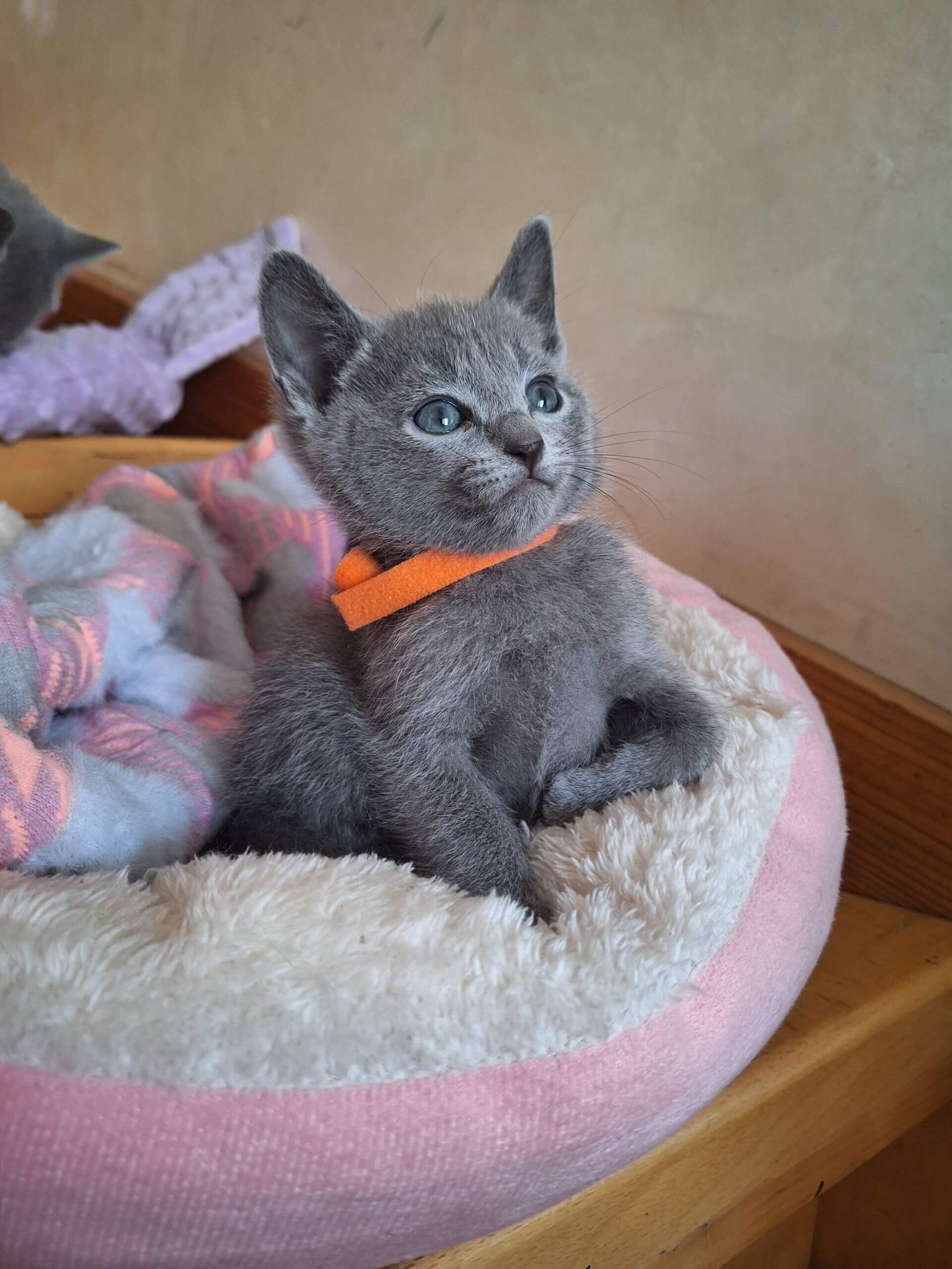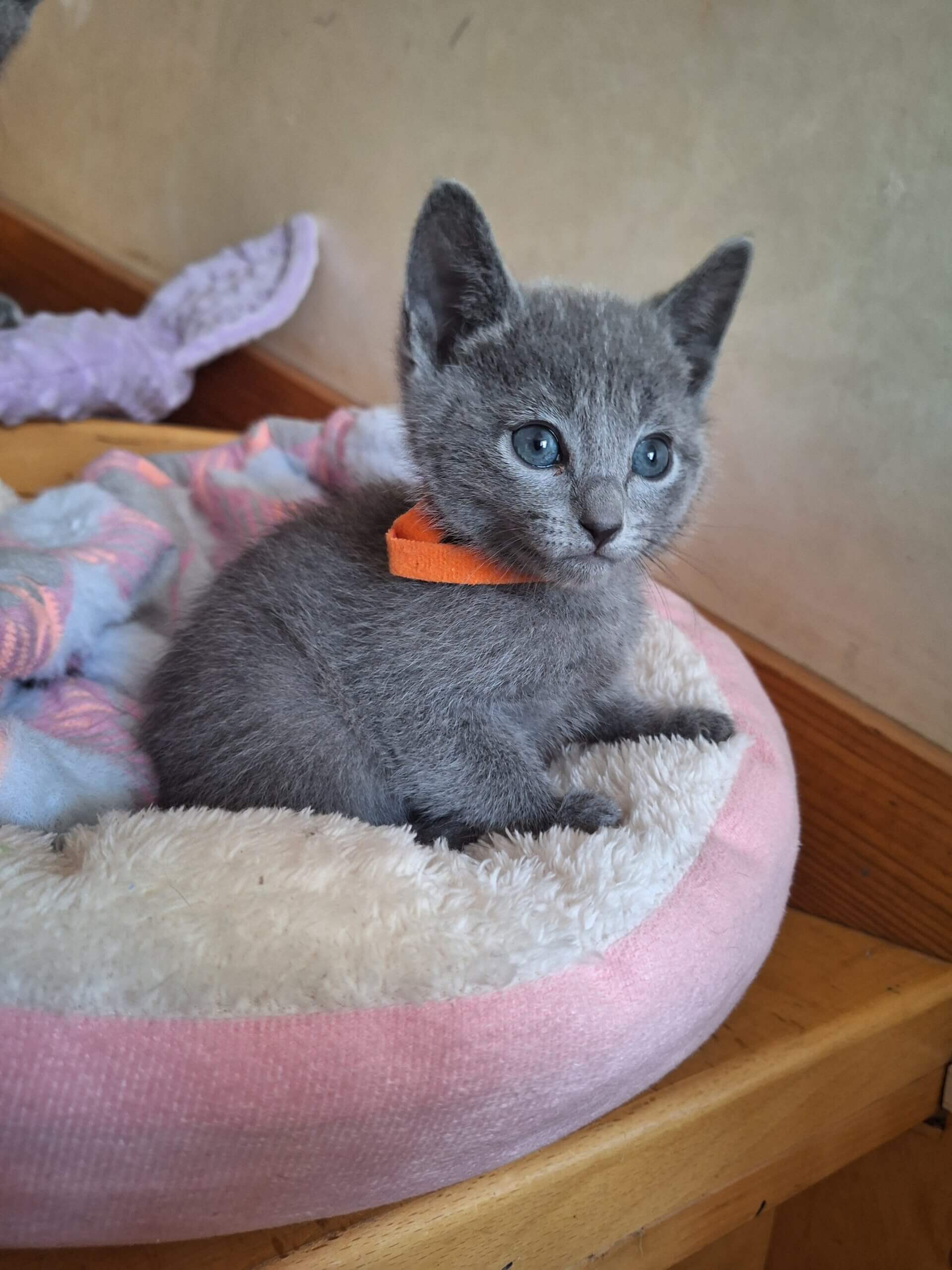 Kristall is a Blue Russian Blue kitten whose coat glimmers with a silvery sheen, cool and plush beneath your fingertips. His green eyes glisten with an emerald warmth, offering you a gentle, intelligent gaze. When you cradle Kristall in your arms, he melts into your hold, purring softly as if he’s known your touch forever.