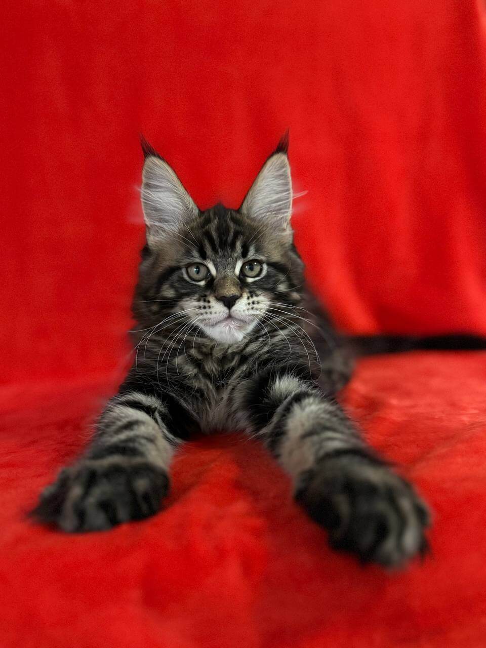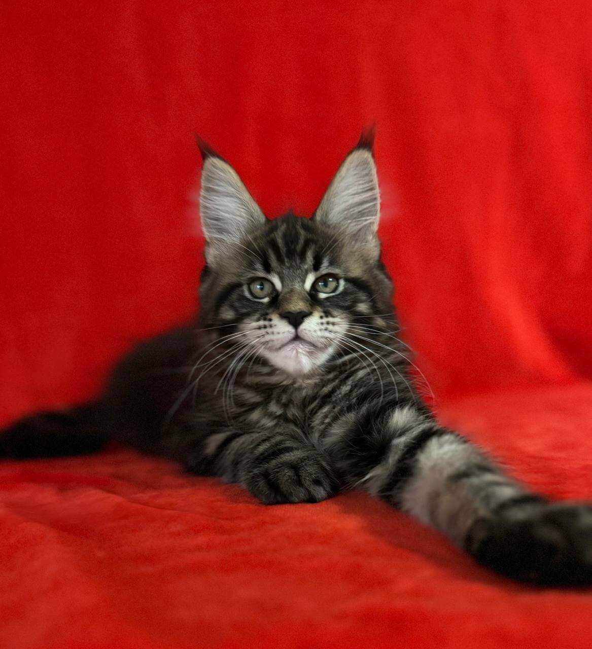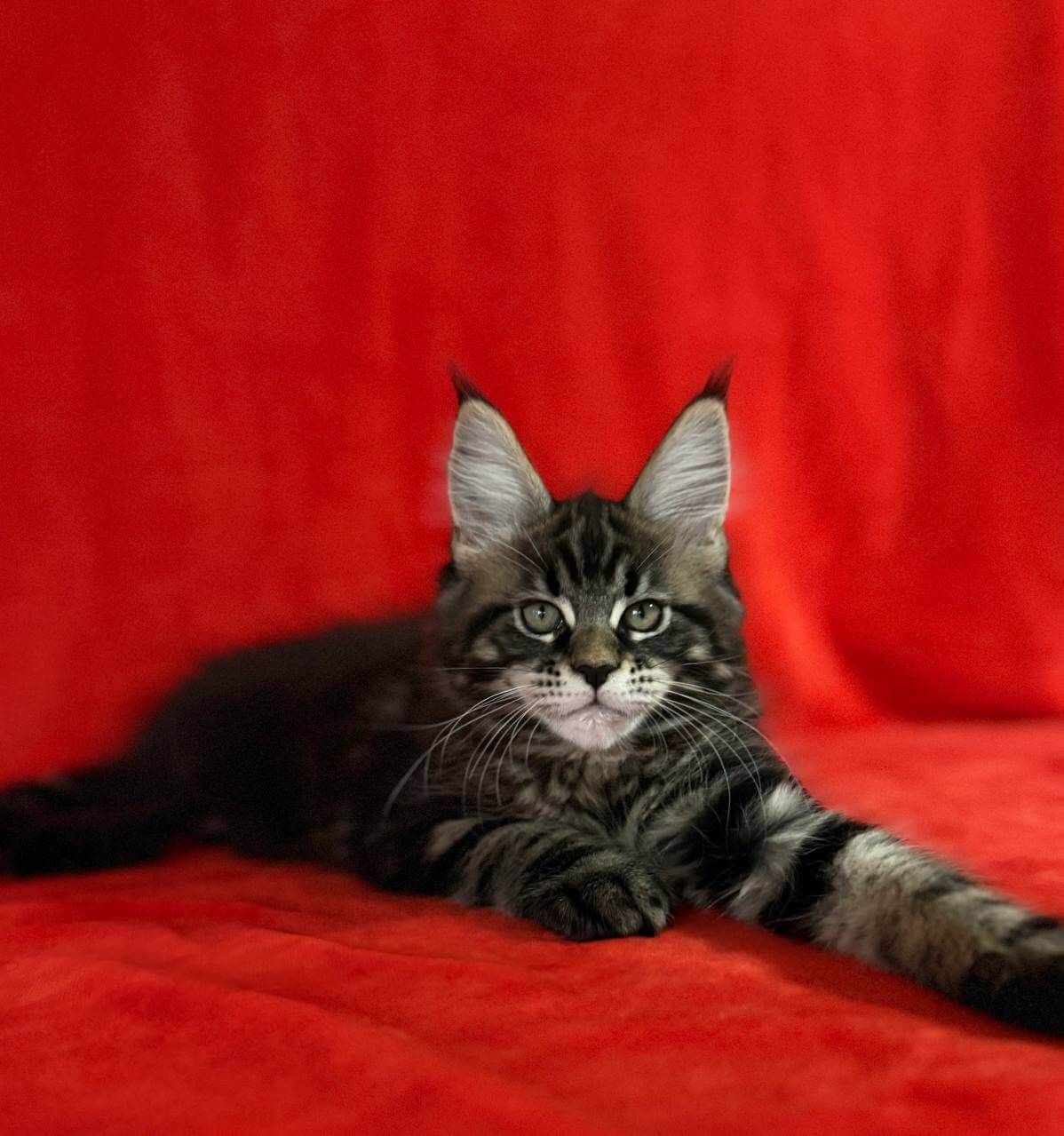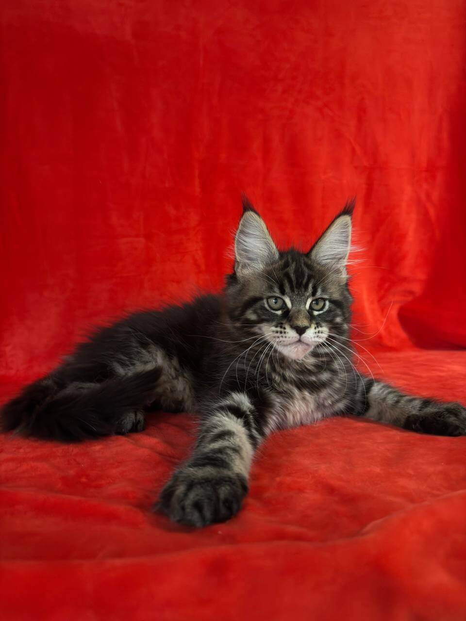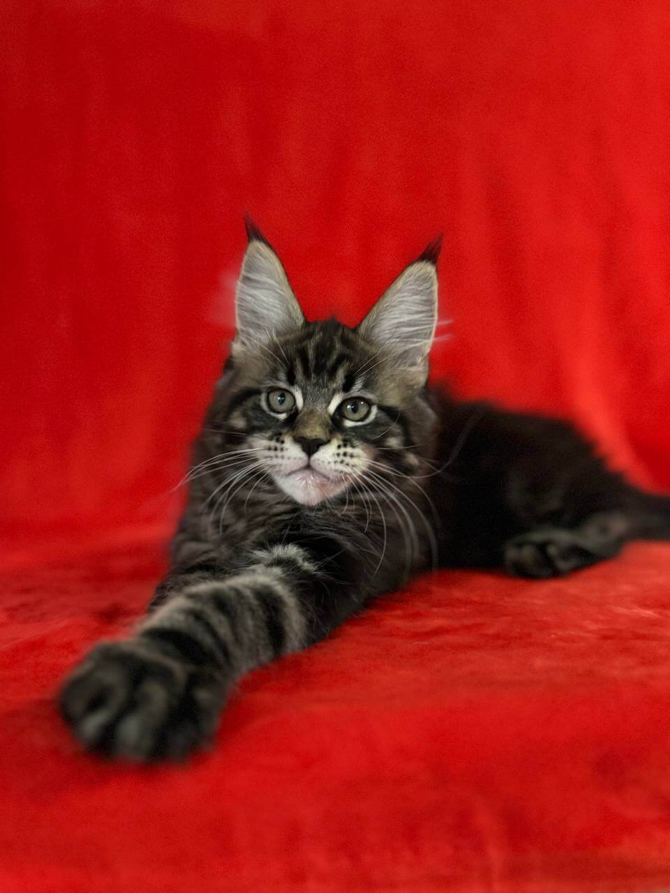 Imagine the soft warmth of black tabby fur nestling into your arms, golden-yellow eyes gazing up at you with endless trust. That’s Kuba—a breathtaking, show-quality Maine Coon kitten, ready to purr her way into your life and heart.