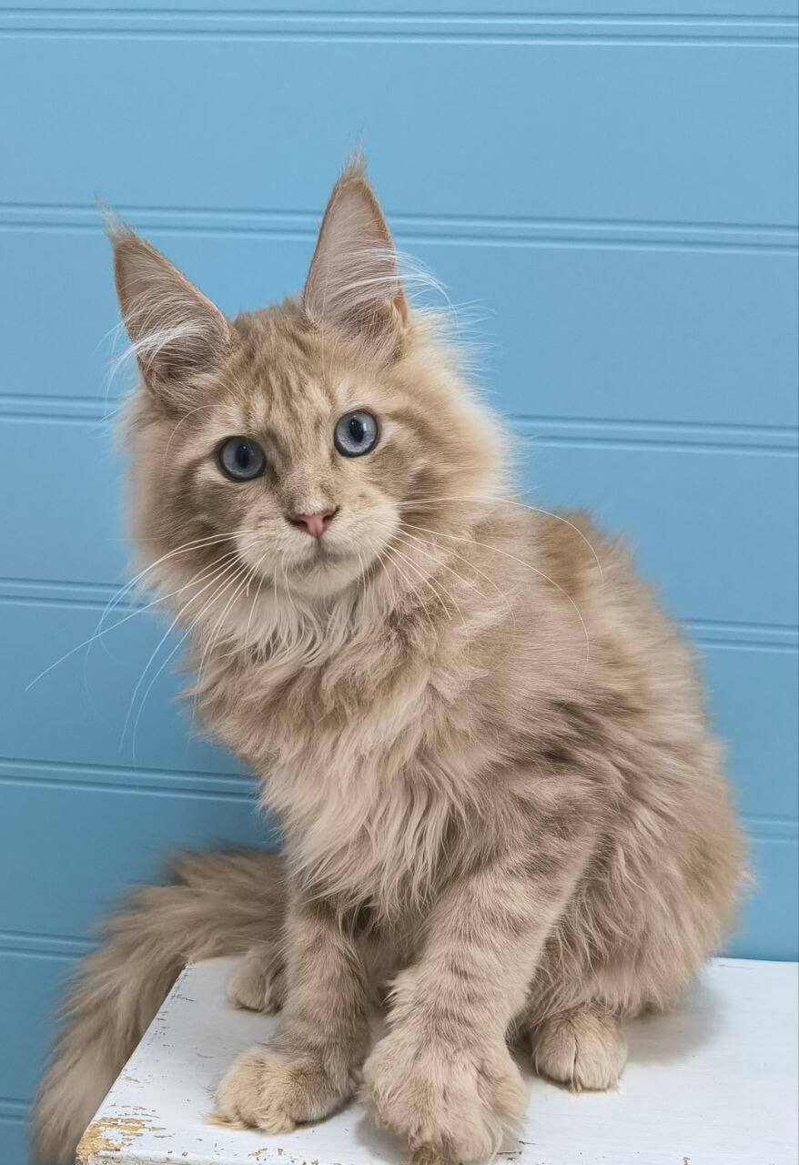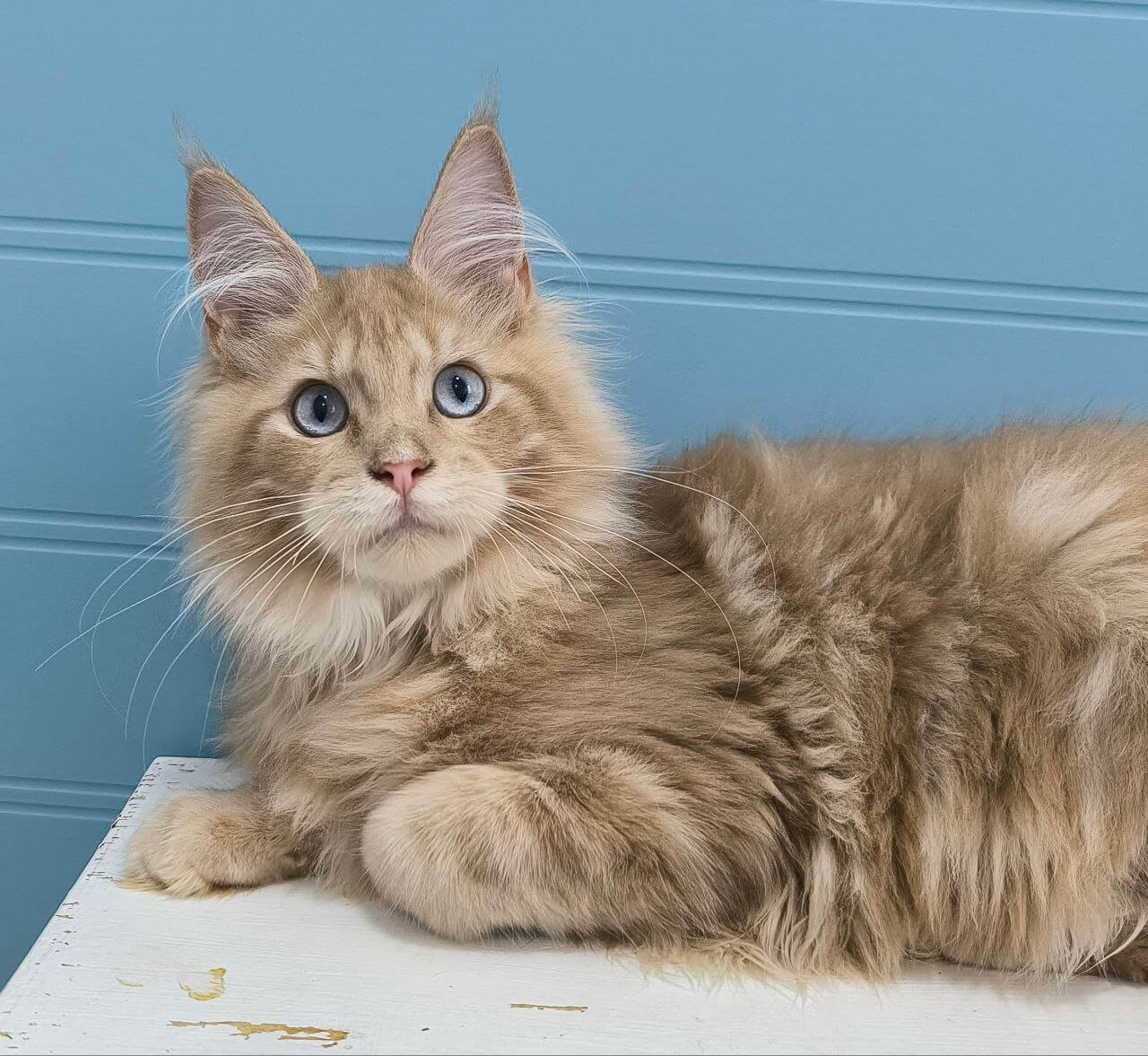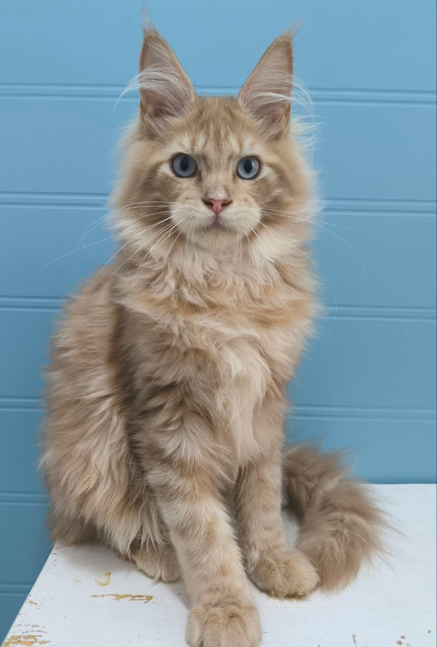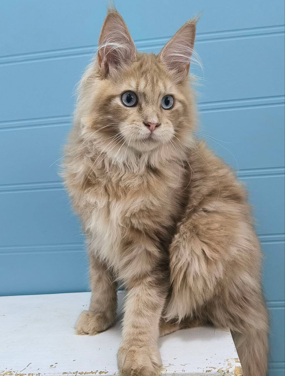 Let your heart be stolen by Kurt—a breathtaking Maine Coon boy whose blue eyes sparkle with mischief and warmth. His plush red silver marble coat, kissed with white, is as soft as a cloud and begs for gentle strokes and cozy snuggles.