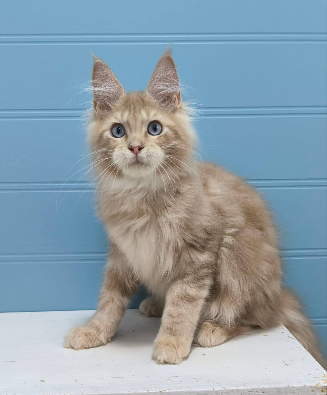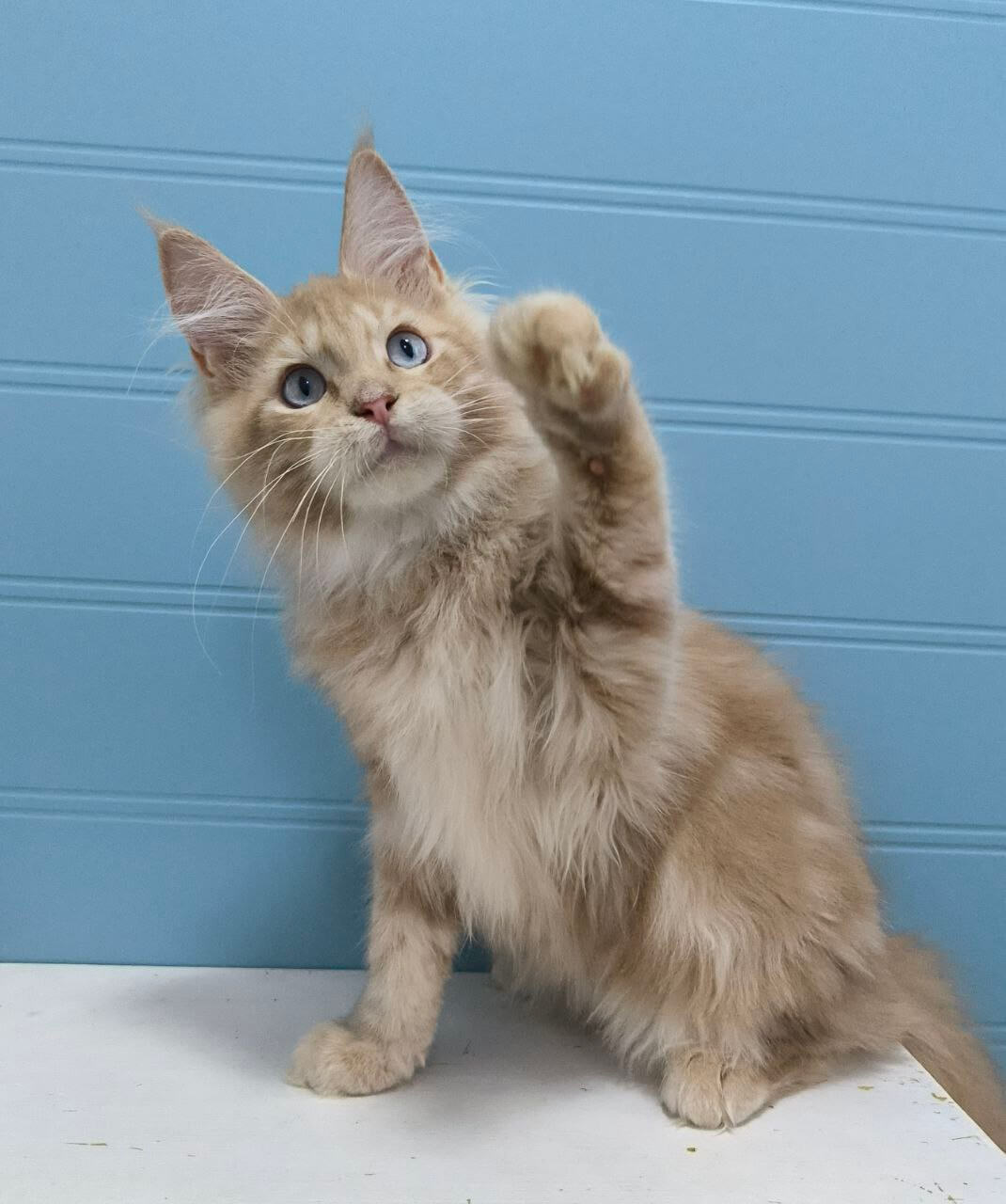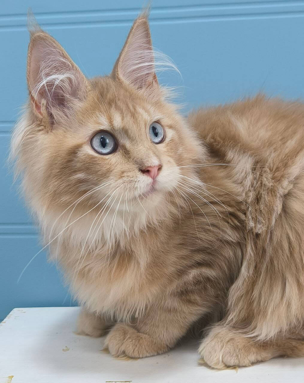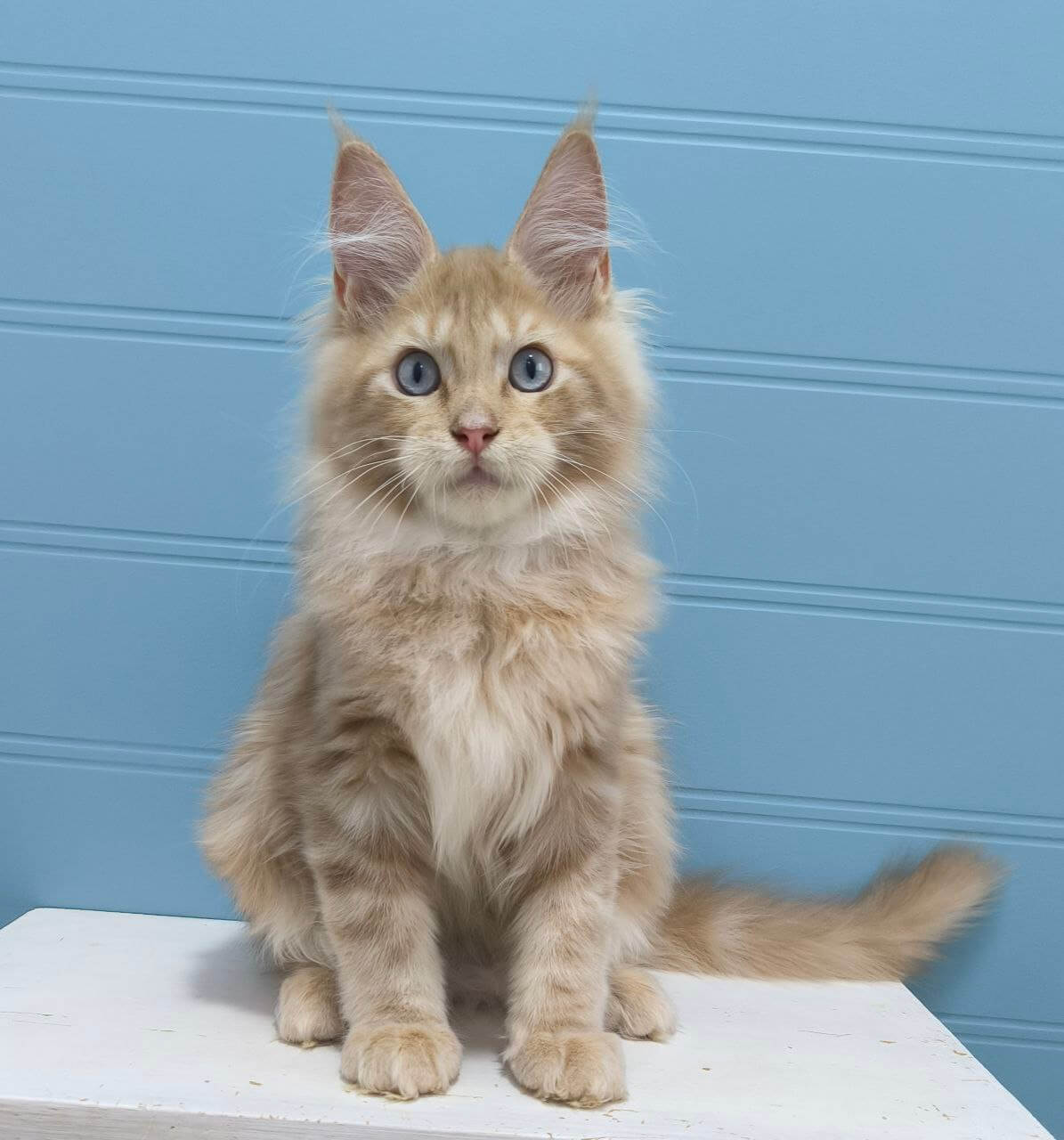 Let your heart be stolen by Kurt—a breathtaking Maine Coon boy whose blue eyes sparkle with mischief and warmth. His plush red silver marble coat, kissed with white, is as soft as a cloud and begs for gentle strokes and cozy snuggles.