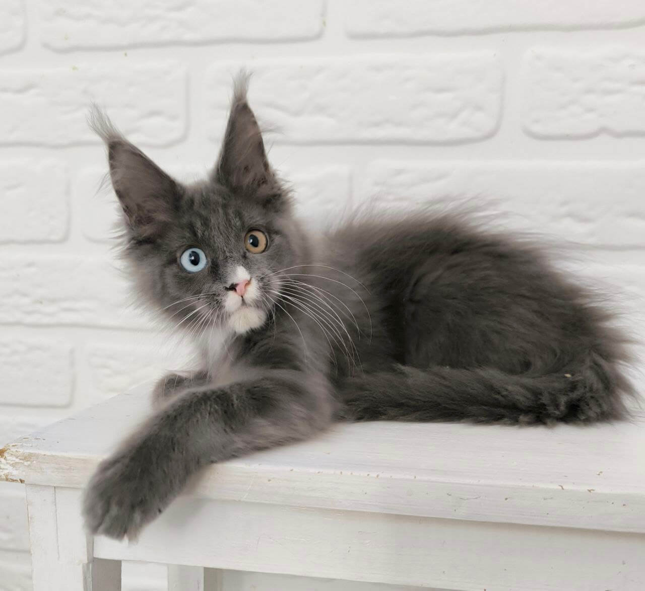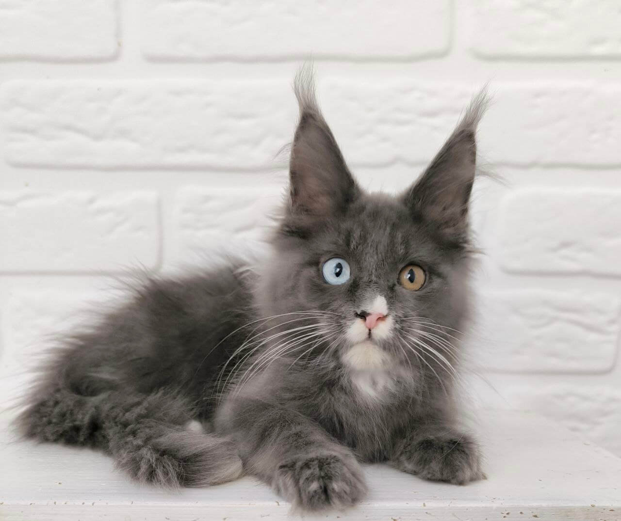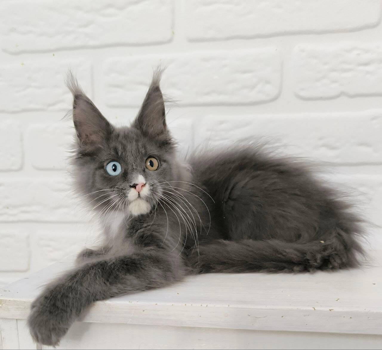 Meet Kyle — your dream Maine Coon kitten, ready to steal your heart the moment you see him. With his soft, blue-smoked fur kissed by gentle touches of white and enchanting odd-colored eyes that gleam with soul and playfulness, Kyle is sure to become the warm, purring center of your home.