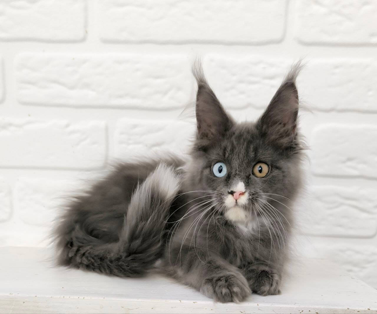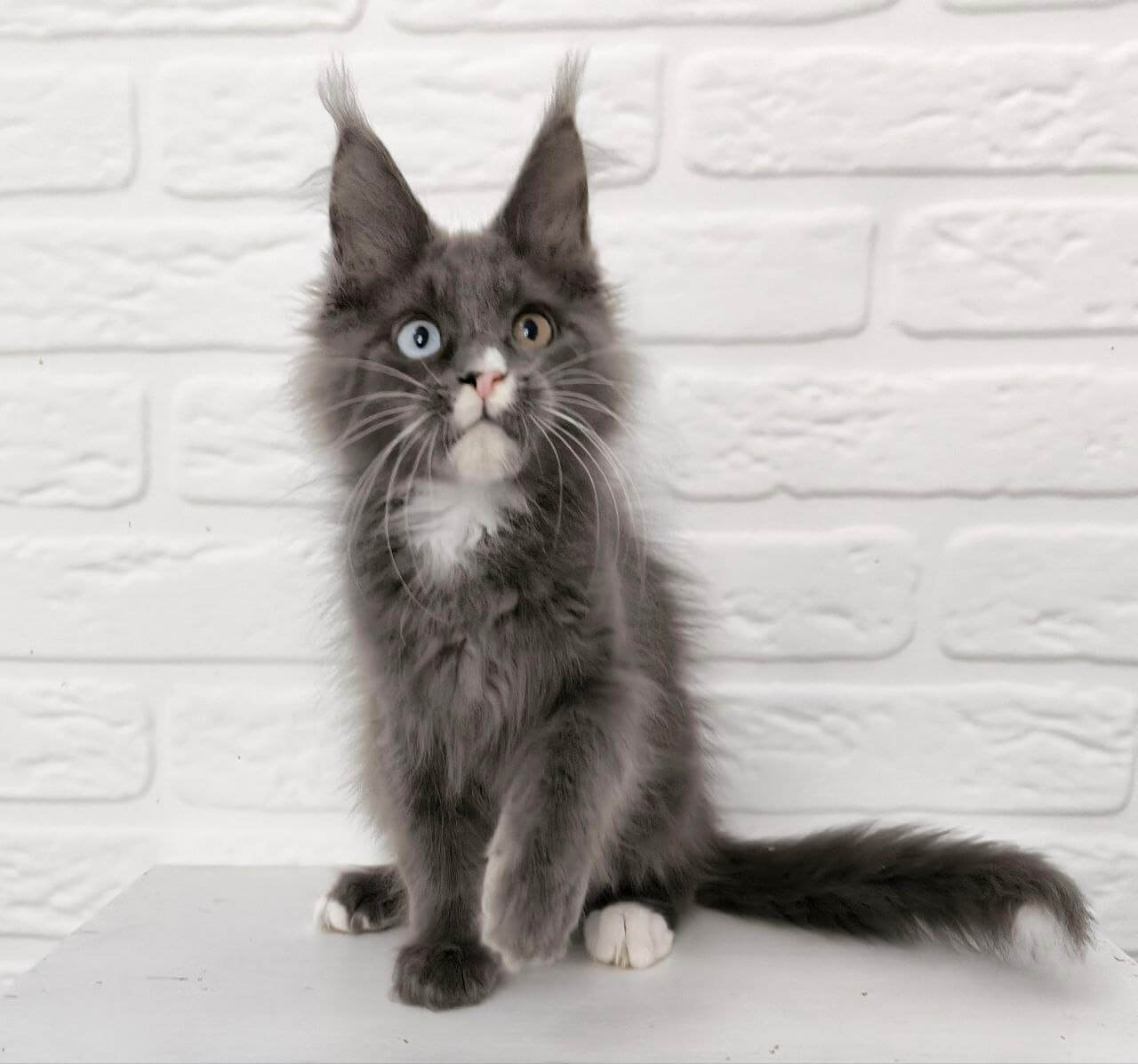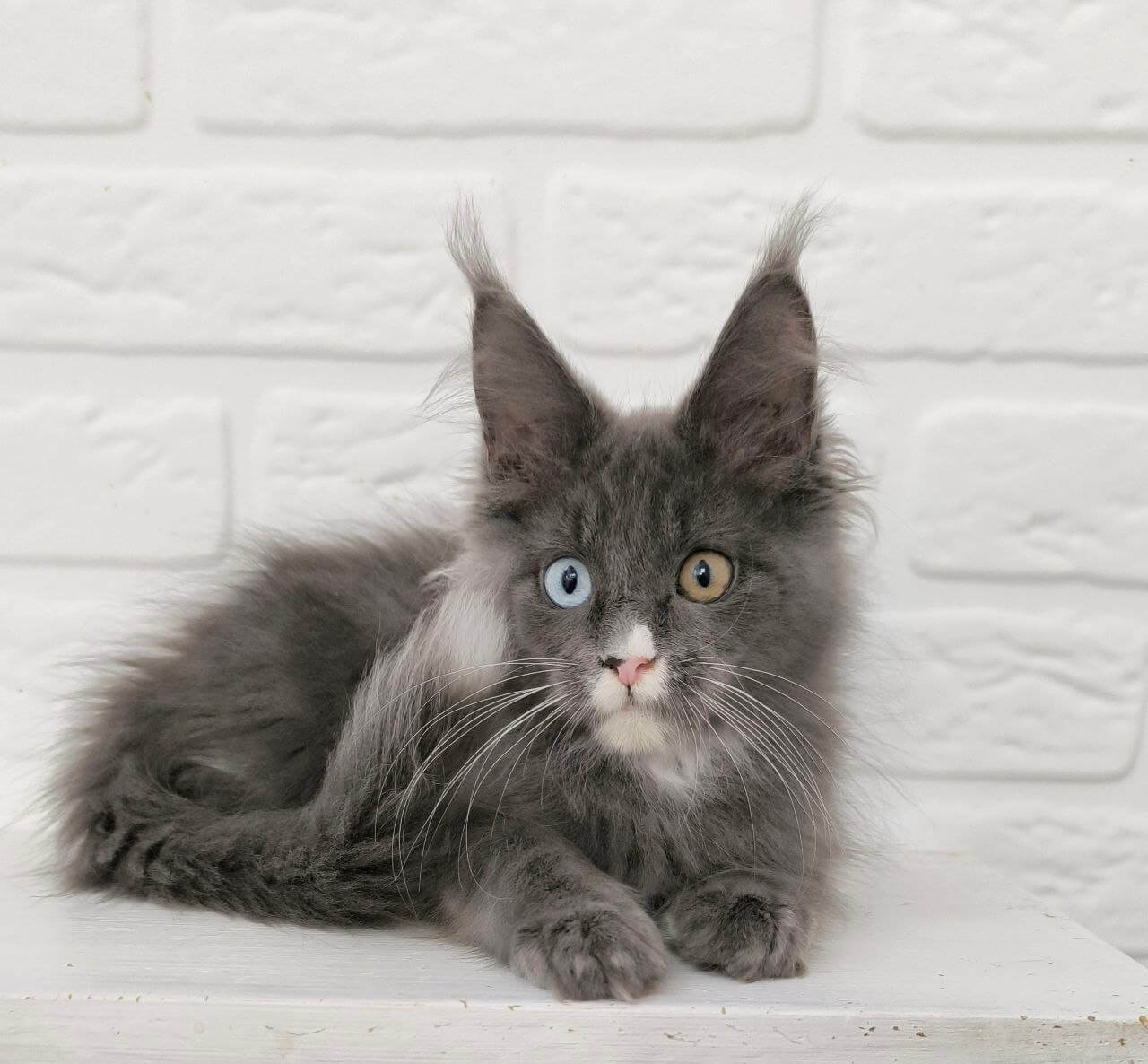 Meet Kyle — your dream Maine Coon kitten, ready to steal your heart the moment you see him. With his soft, blue-smoked fur kissed by gentle touches of white and enchanting odd-colored eyes that gleam with soul and playfulness, Kyle is sure to become the warm, purring center of your home.