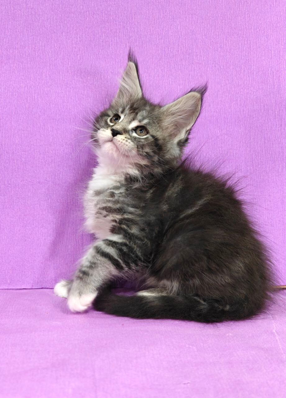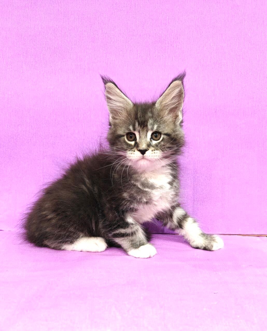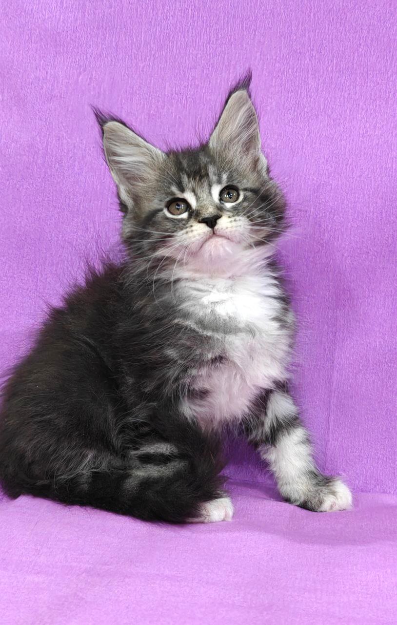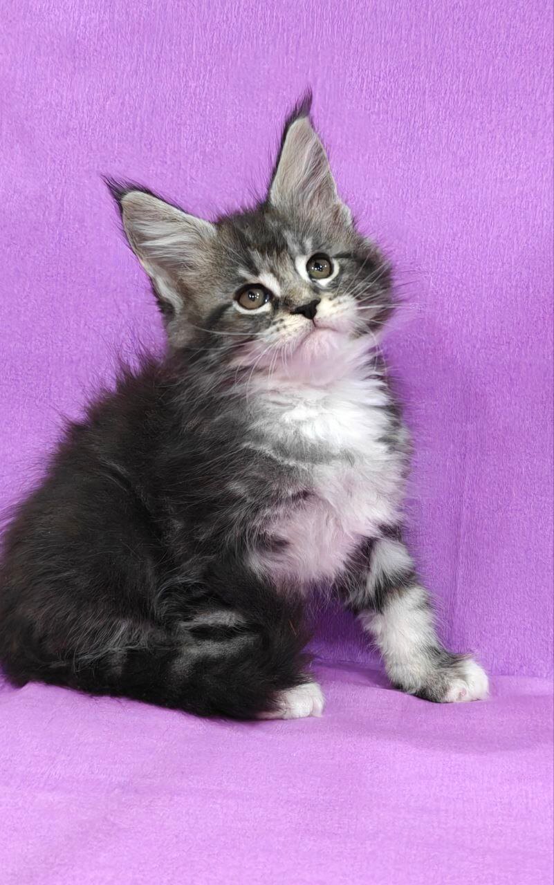 Meet Leo, a mesmerizing Maine Coon boy with a heart as big as his golden eyes and a coat as enchanting as a moonlit forest—black silver tabby blotched with gentle streams of white. The moment he looks up at you, you’ll feel an irresistible connection, as if his purrs were meant just for your touch.