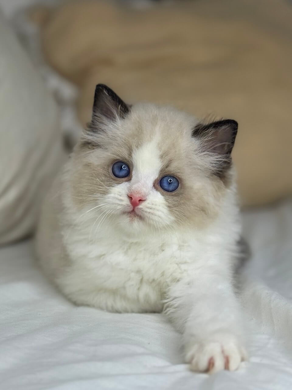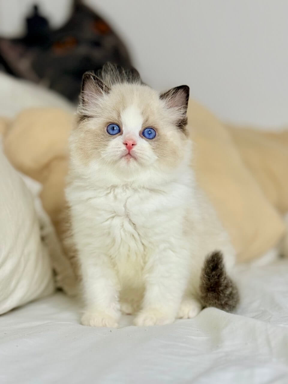 Meet Leon — a breathtaking seal bicolor Ragdoll boy whose deep blue eyes will melt your heart from the very first cuddle. Imagine soft, warm fur nestled against your cheek, a gentle purr reverberating through your arms as Leon gazes up with trust and devotion. This precious kitten radiates a calm, loving spirit—he adores gentle play, friendly lap time, and will greet you every day with a soothing touch.