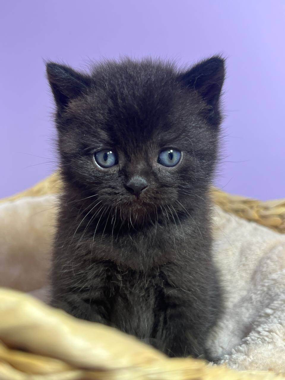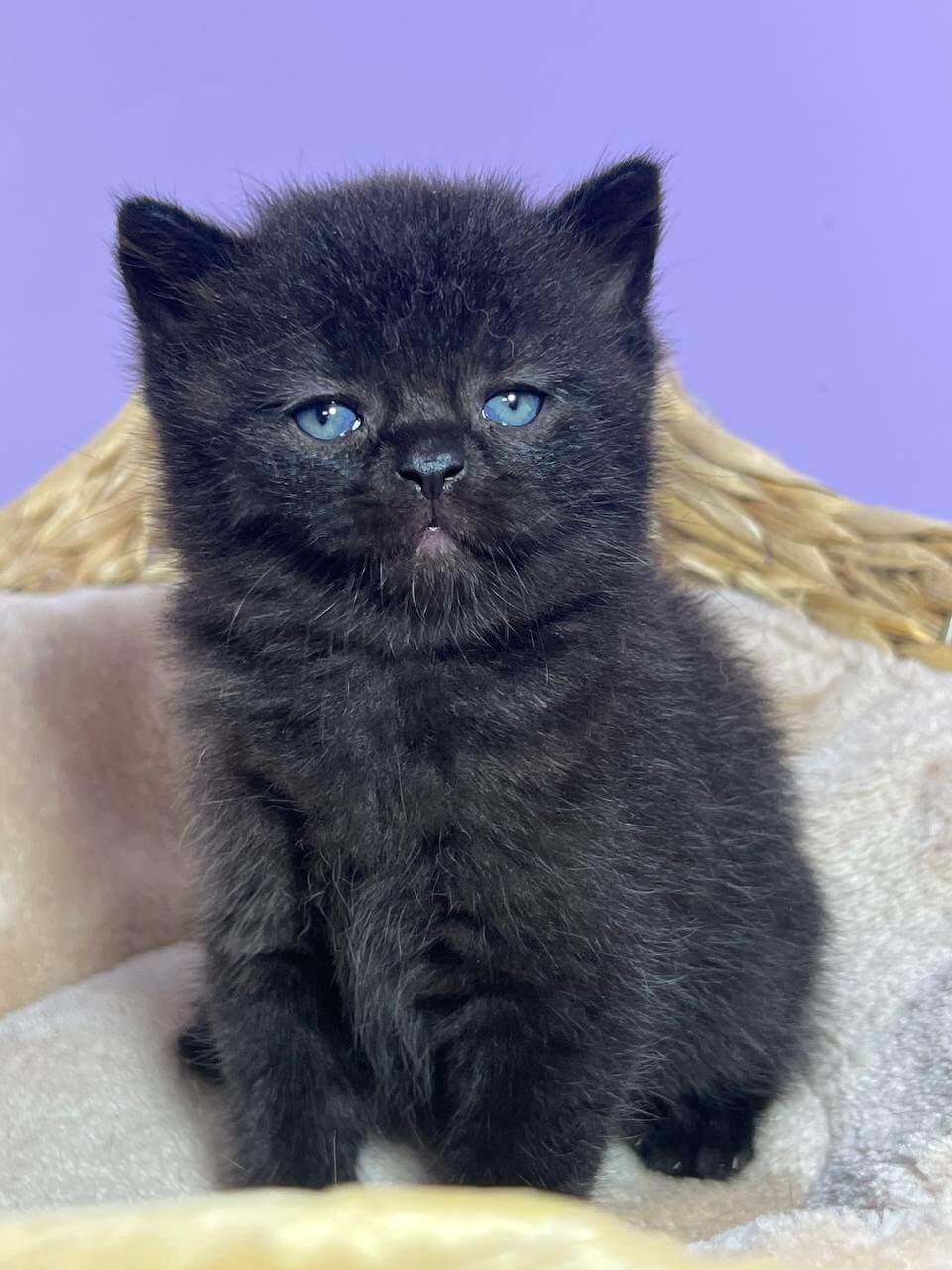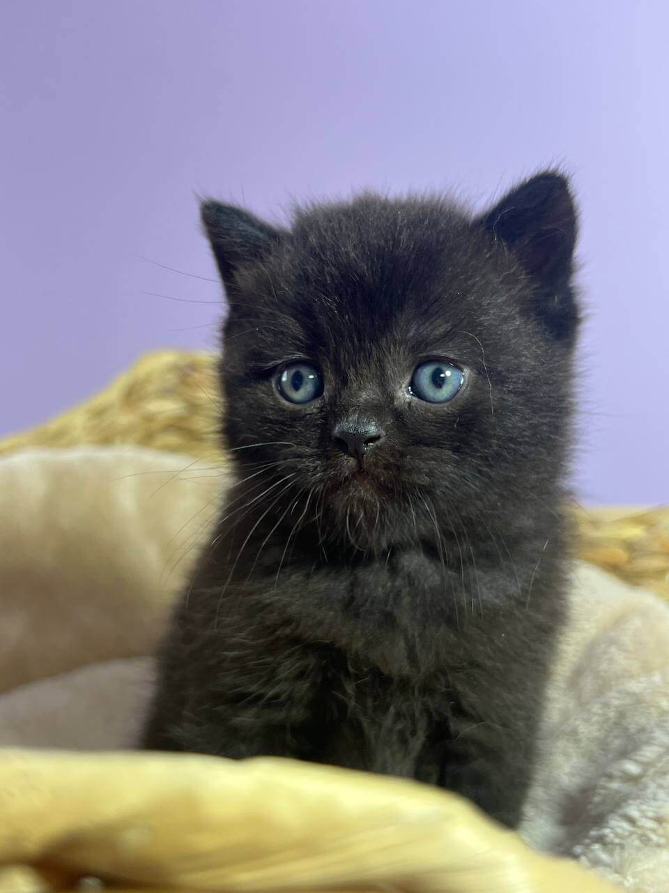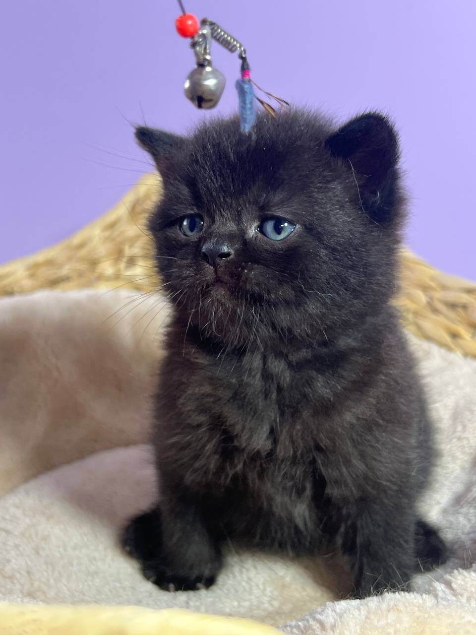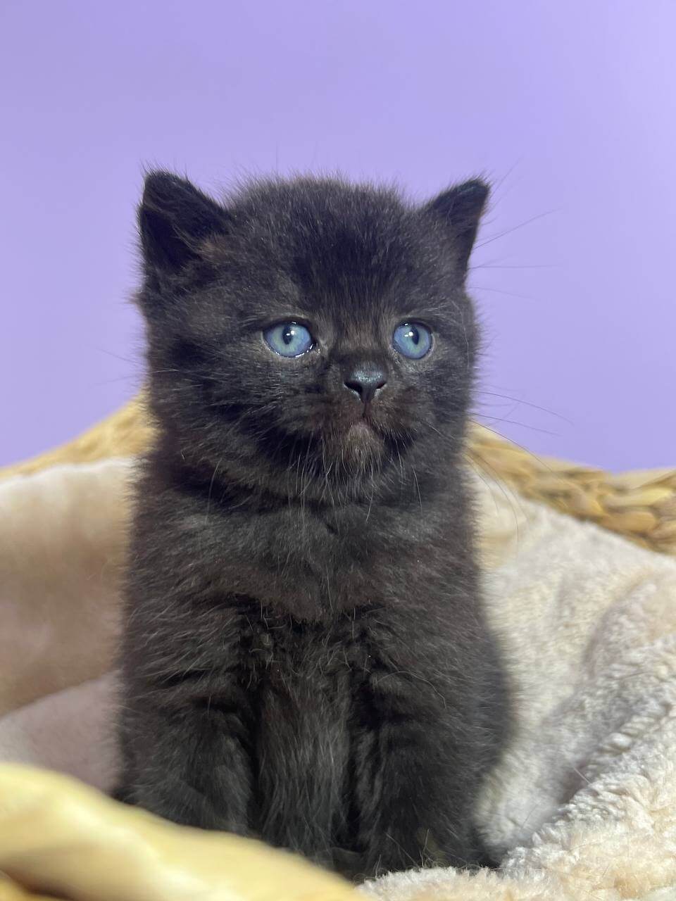 Meet Leon, your soon-to-be heart-stealer—a stunning black Scottish Straight boy with mesmerizing golden-yellow eyes that light up every room he enters. With his soft, plush coat and gentle, soulful gaze, Leon brings instant warmth and comfort to any lap he graces.