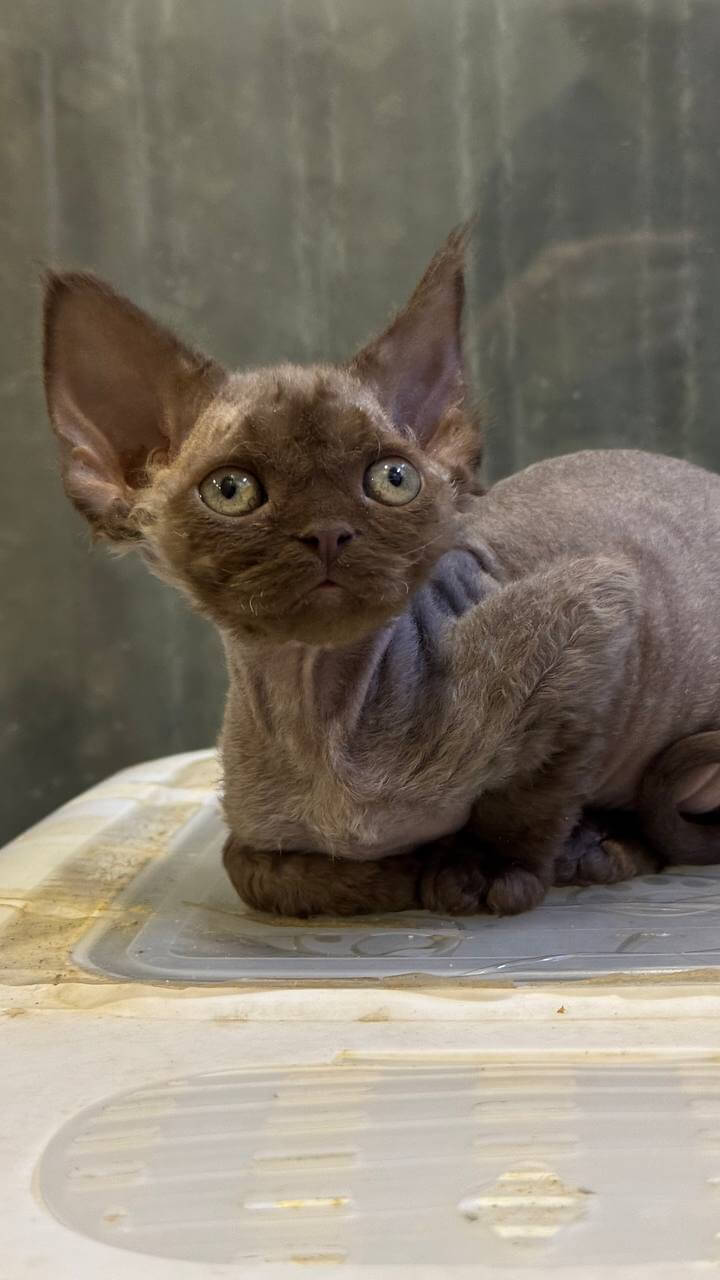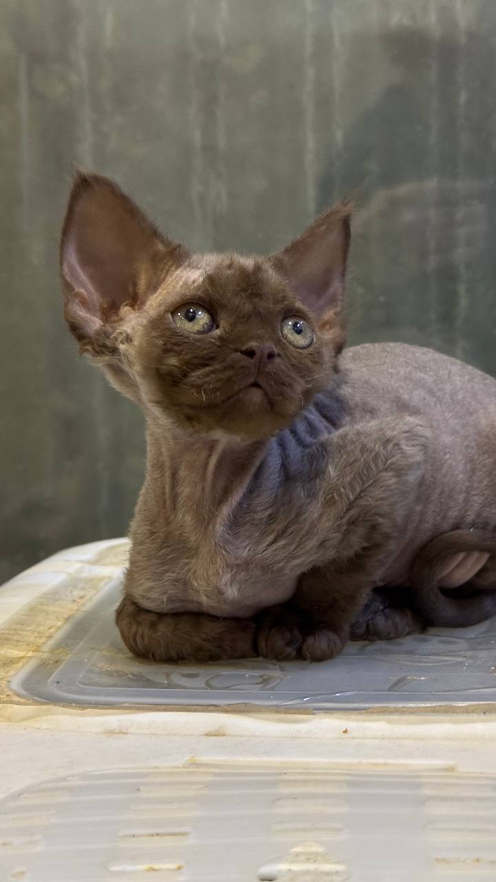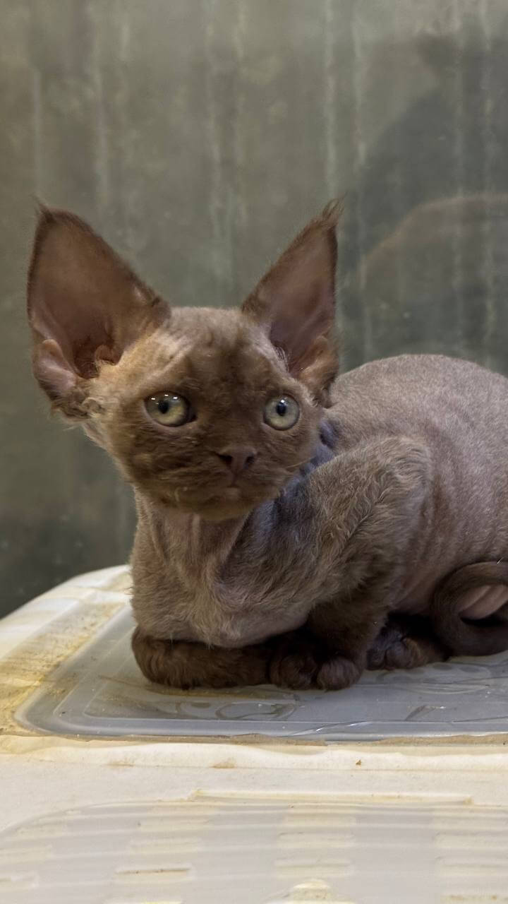 Linda is a Chocolate Devon Rex kitten whose plush, rippling fur feels silky and warm beneath your fingers. Her soft, curly coat makes every cuddle irresistible, while her deep yellow eyes capture the golden afternoon light with a honeyed glow. Linda’s petite, muscular body settles perfectly in your arms, purring contentedly, inviting you into her gentle orbit.
