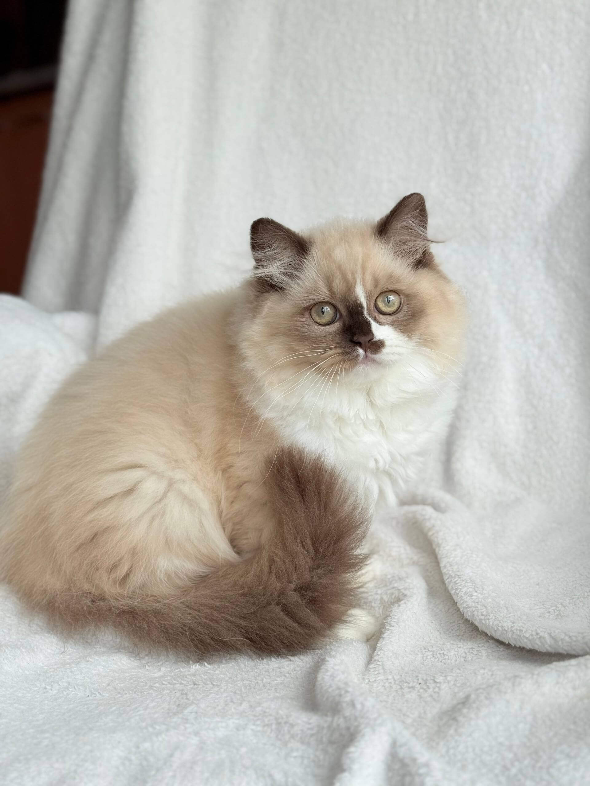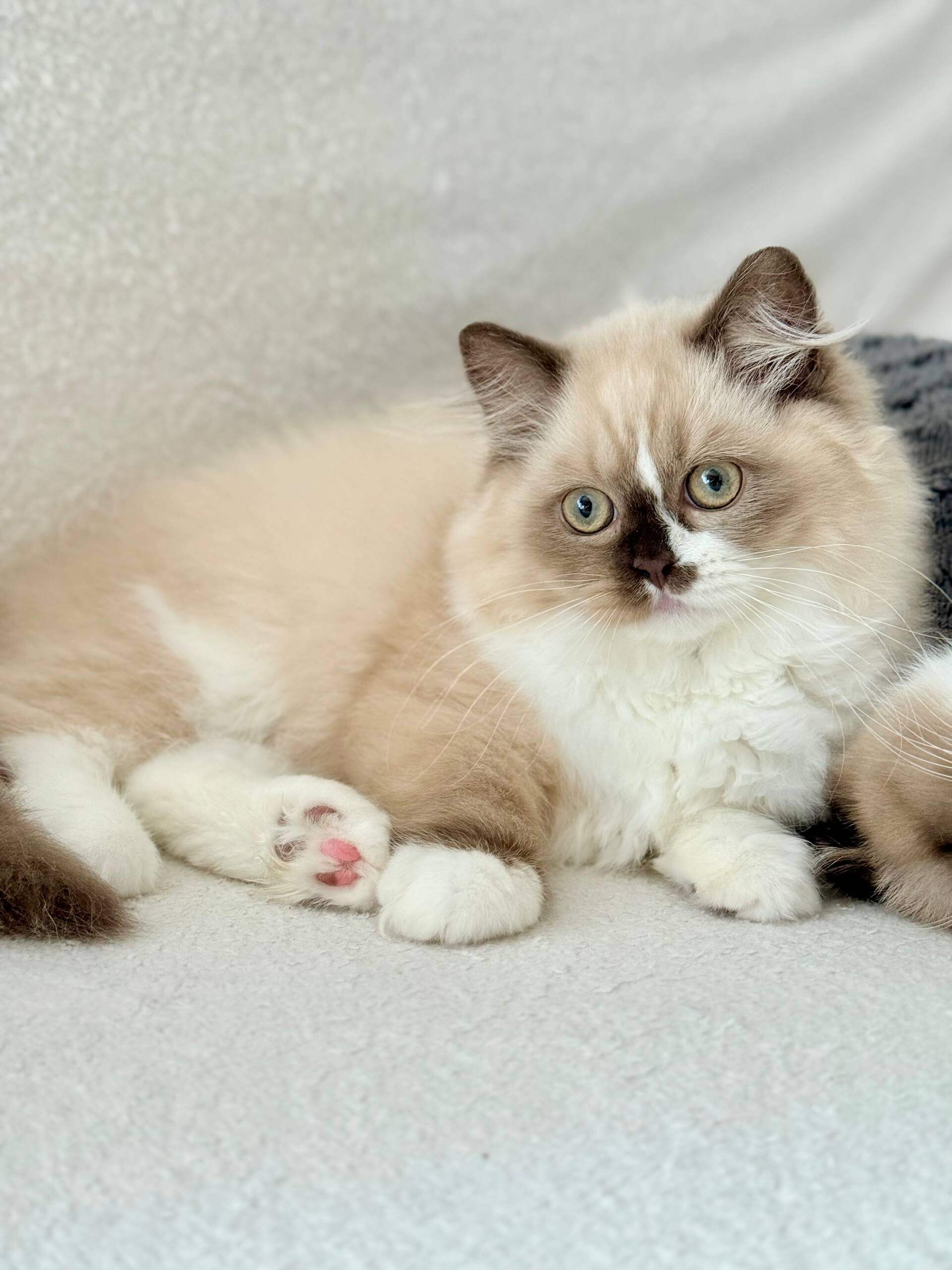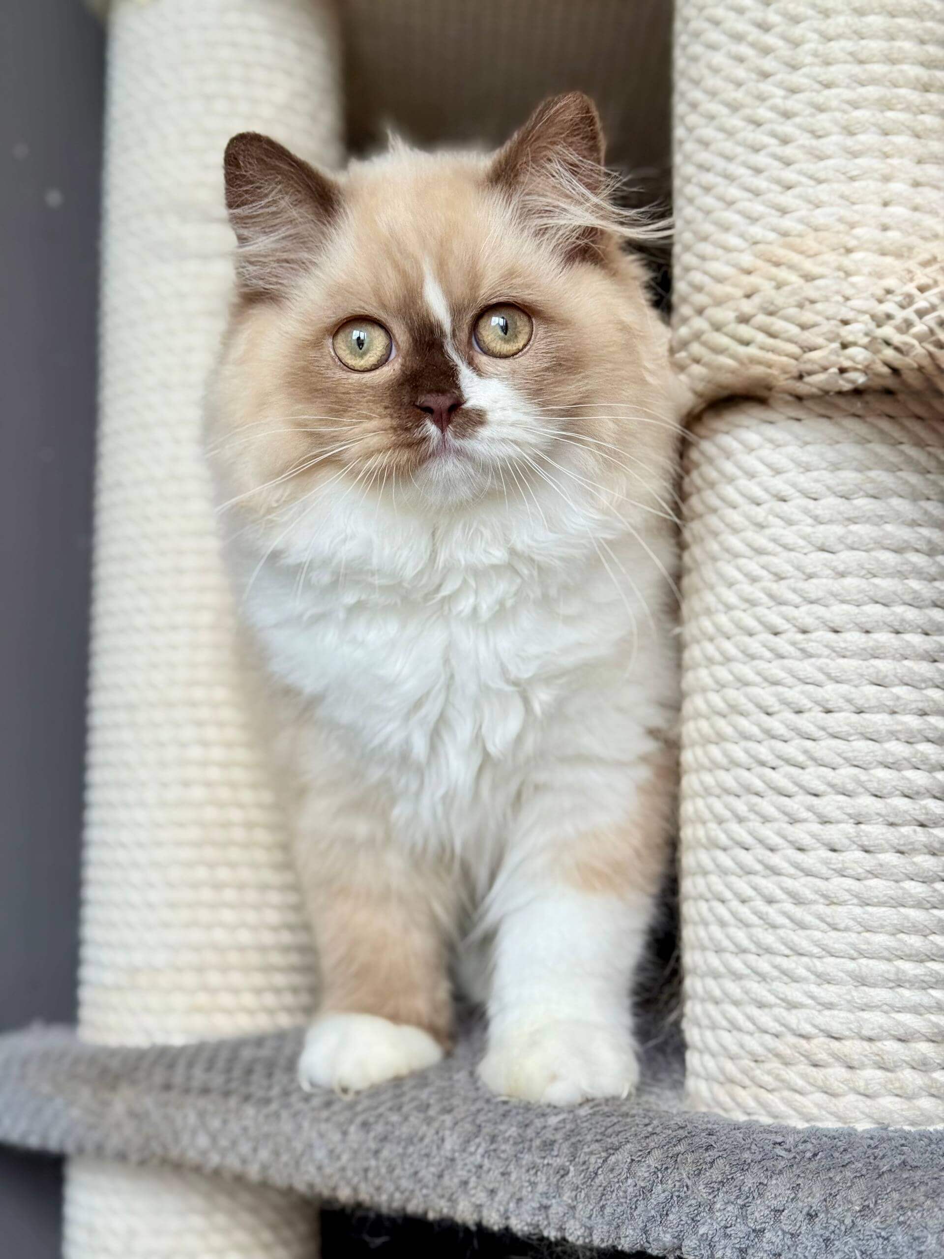 Like all true Scottish Straights, Lisa blends gentle serenity with clever mischief. She’ll greet you with an upward tilt of her head and a delicate chirp, always anticipating your voice. At naptime, she curls close enough for you to feel her whiskers flutter as she breathes. Play sessions reveal her dancer’s grace: feather toys spark leap after poised leap, each landing soft and sure.