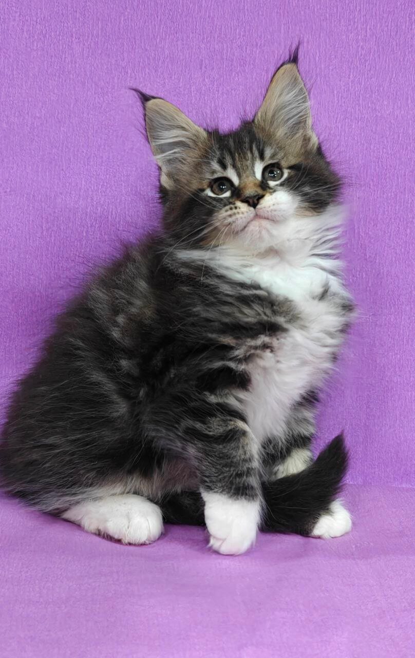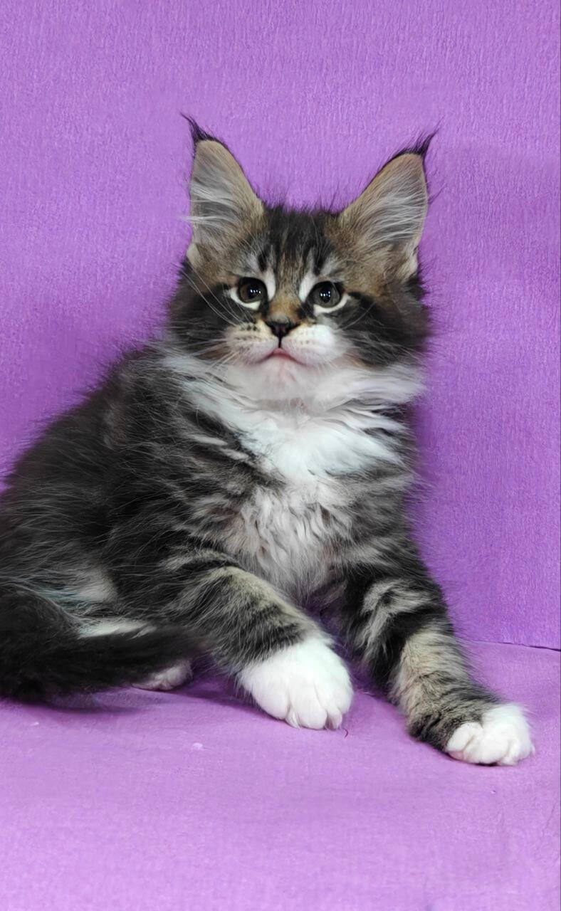 Meet Lolly – a Maine Coon kitten whose gentle spirit and bright yellow eyes will instantly steal your heart. Her plush black tabby fur, kissed with gleaming white, feels as soft and warm as a cozy blanket, and she loves to snuggle into your arms, serenading you with a whisper-soft purr.