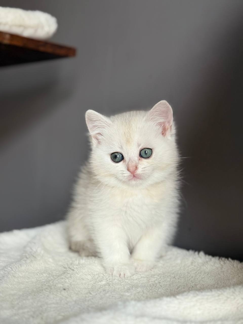 Meet Lyna, our enchanting Scottish Straight kitten whose gentle spirit will win your heart from the very first purr. Her glistening black silver tabby ticked coat and mesmerizing green eyes are truly unforgettable—a little beauty with a world of love to give.