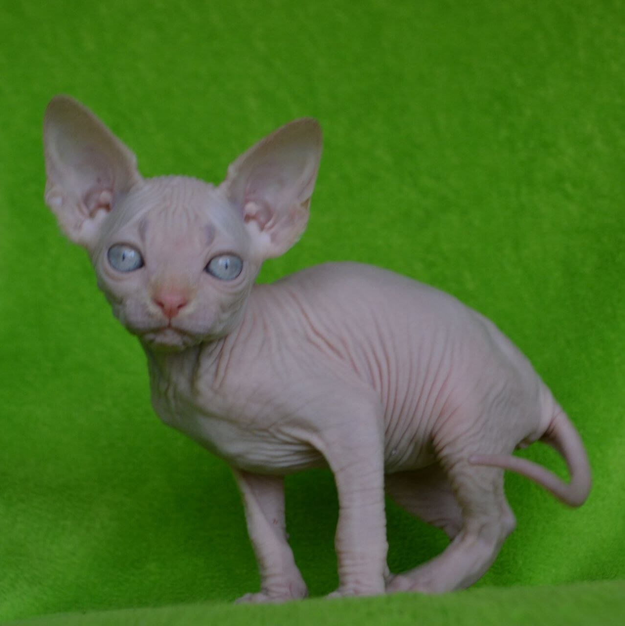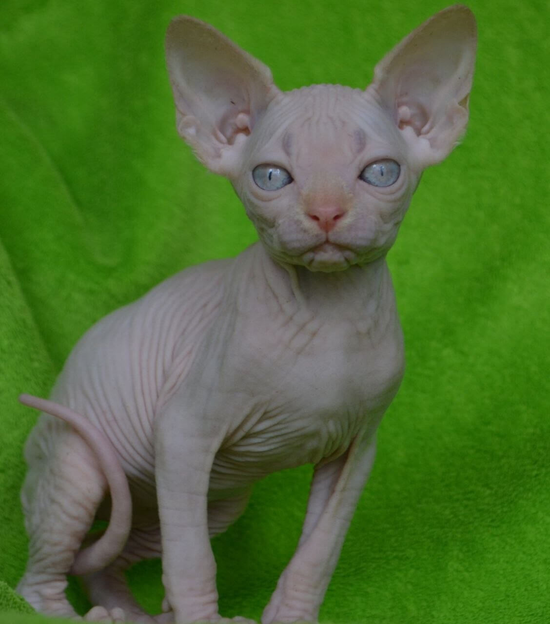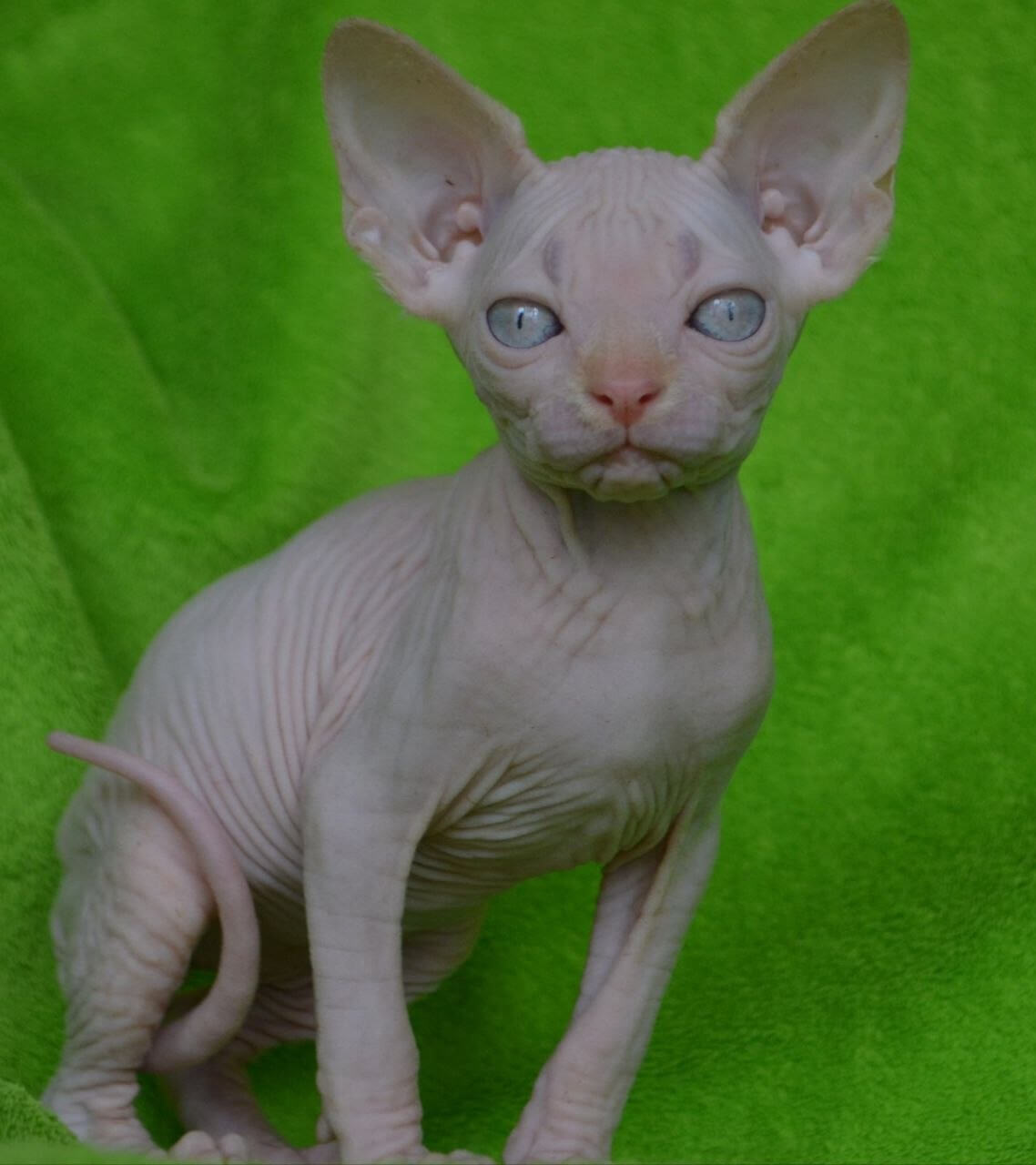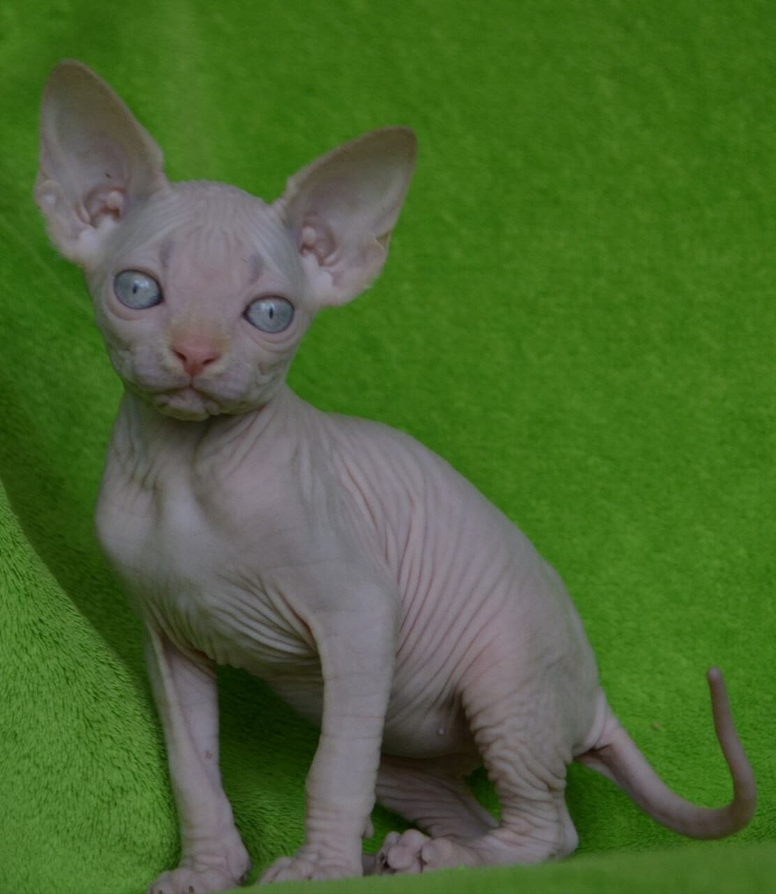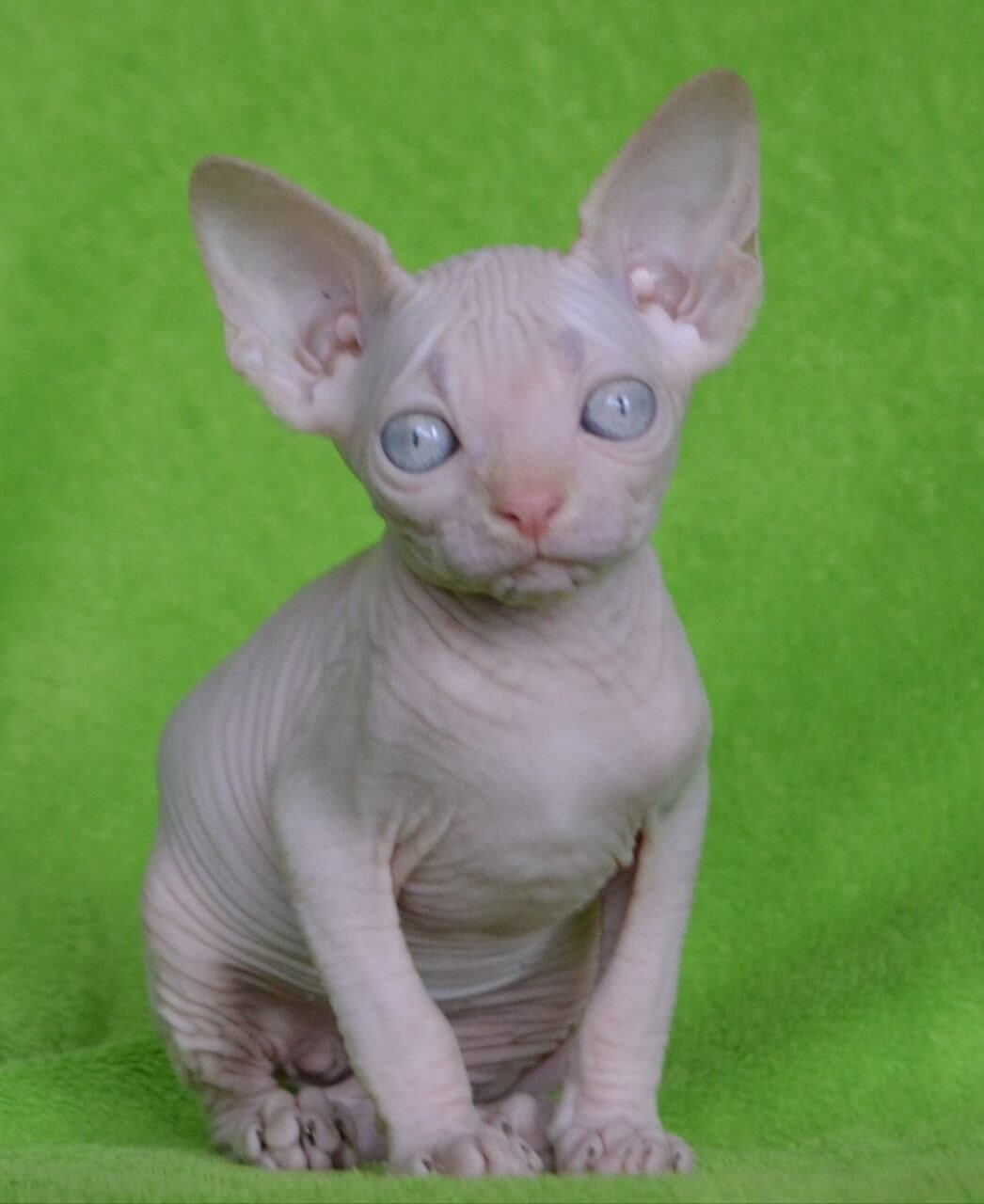 Malibu is a Cream Sphynx kitten whose silken skin feels like warm suede cupped in your hands, while her deep blue eyes shimmer with intelligence and curiosity. Press your cheek to her side, and you’ll sense her steady purr—a gentle, living heartbeat—radiating trust as she claims her cozy spot beside you every evening.
