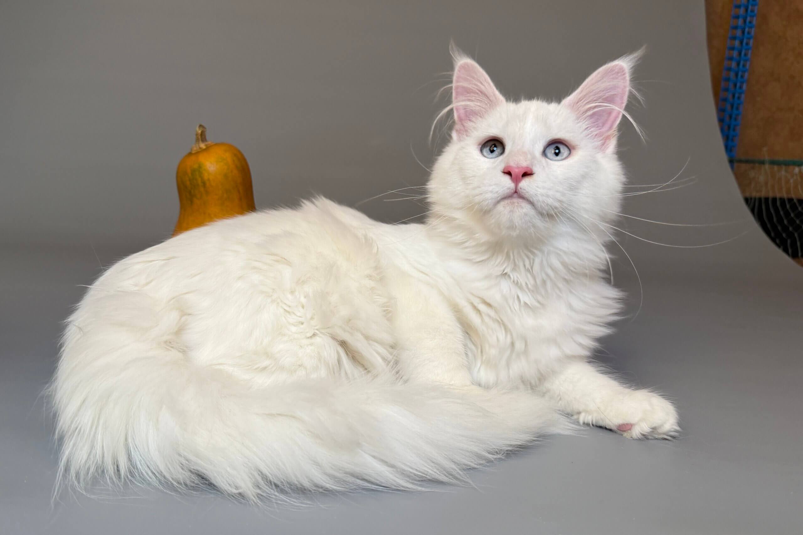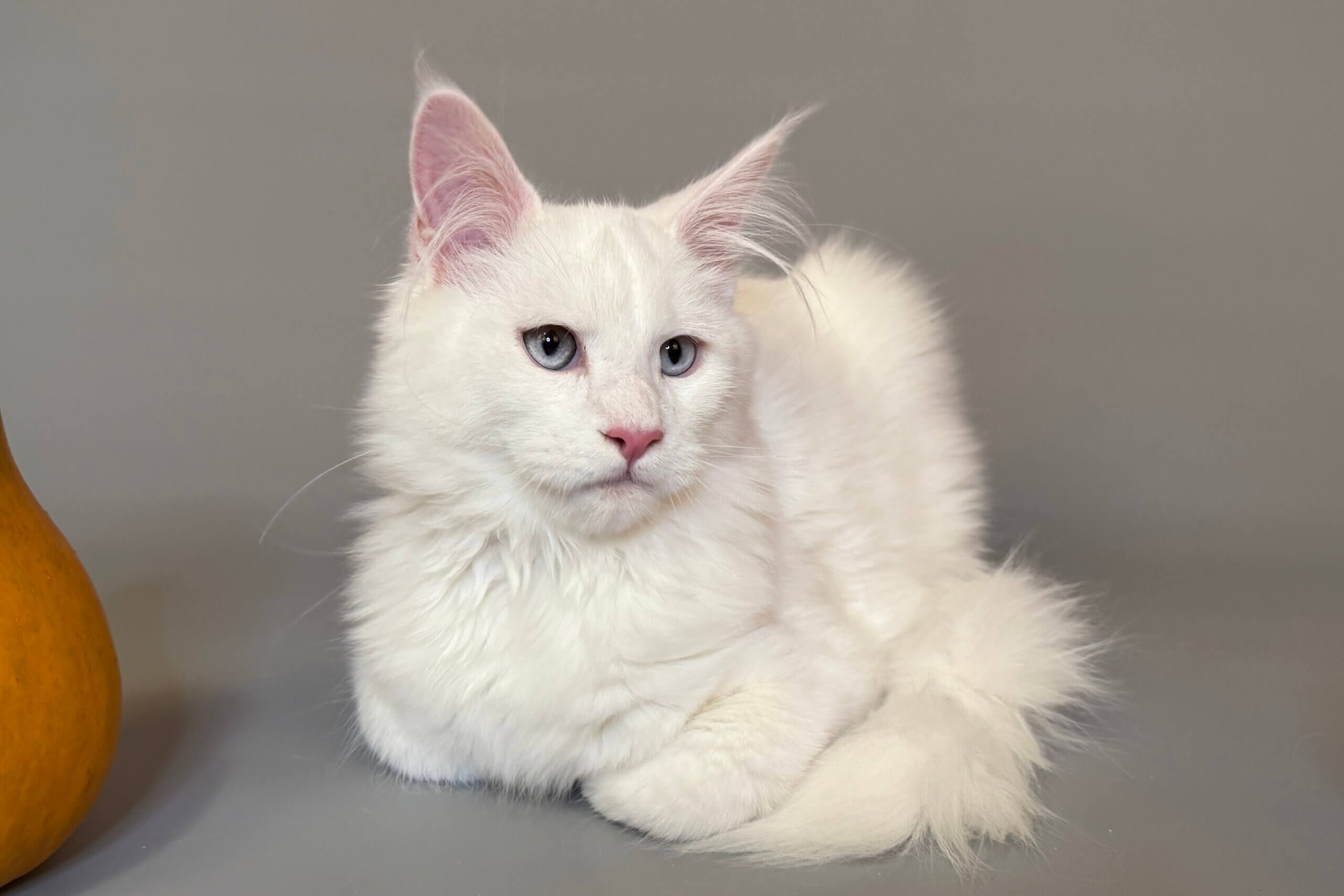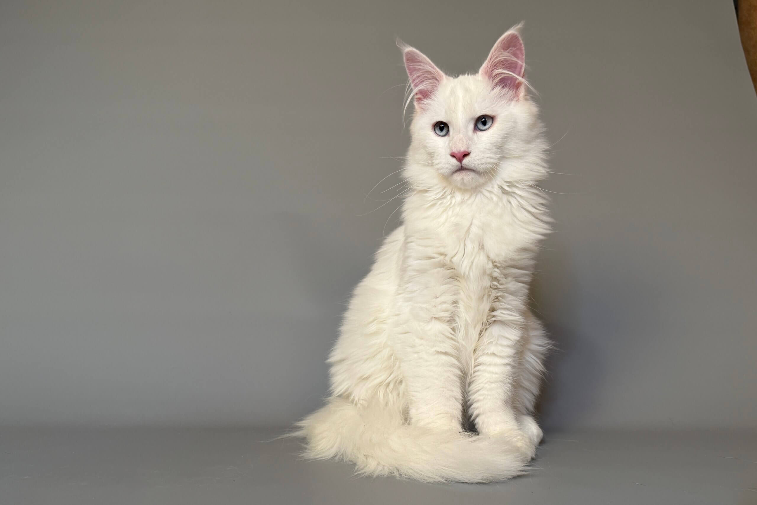 Meet Malto, our snow-white Maine Coon boy with spellbinding blue eyes—a gentle soul ready to melt your heart the moment you brush his silken fur. His purrs echo warmth and belonging, promising soft cuddles and affection that fill your home with sunshine.
