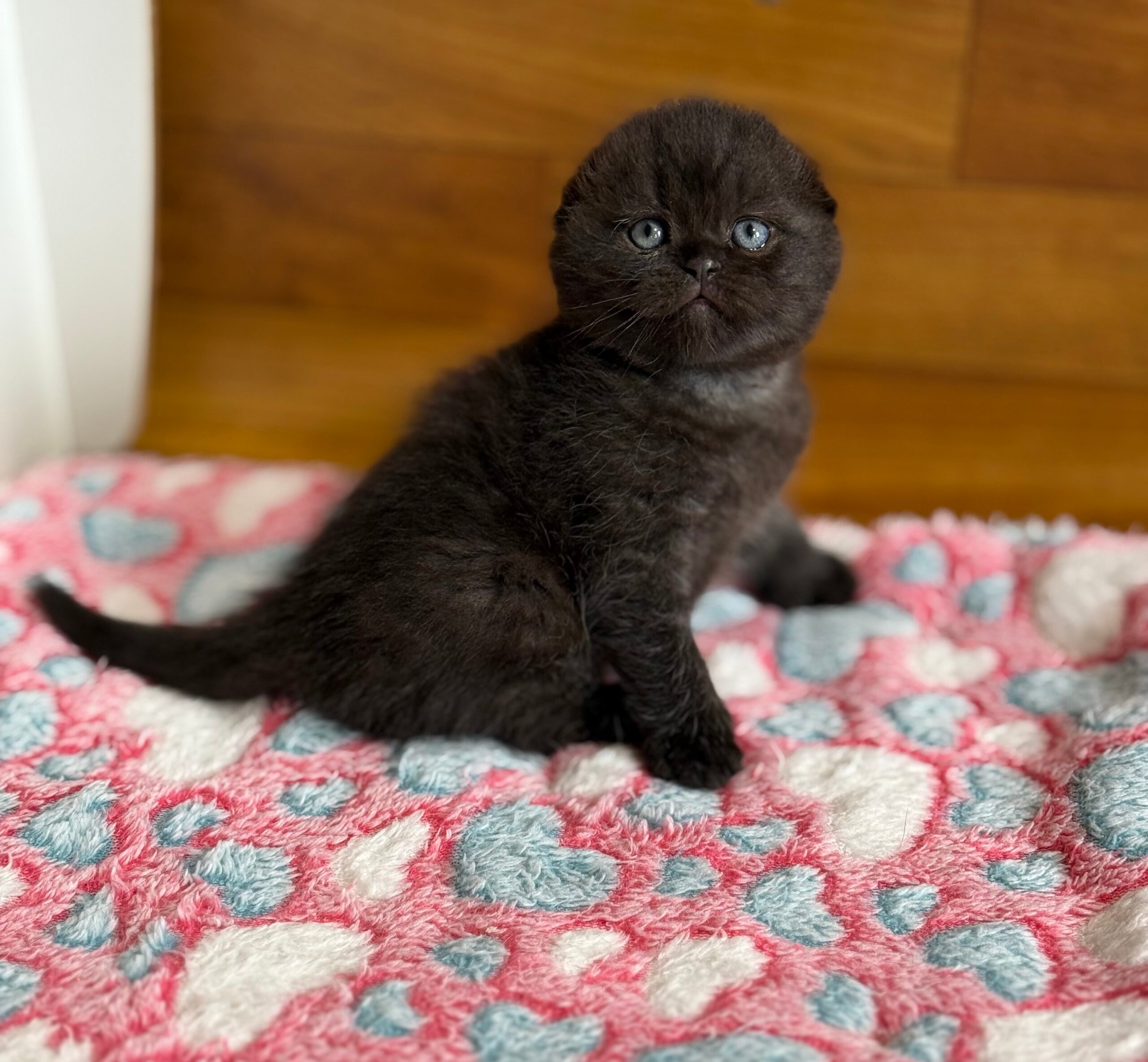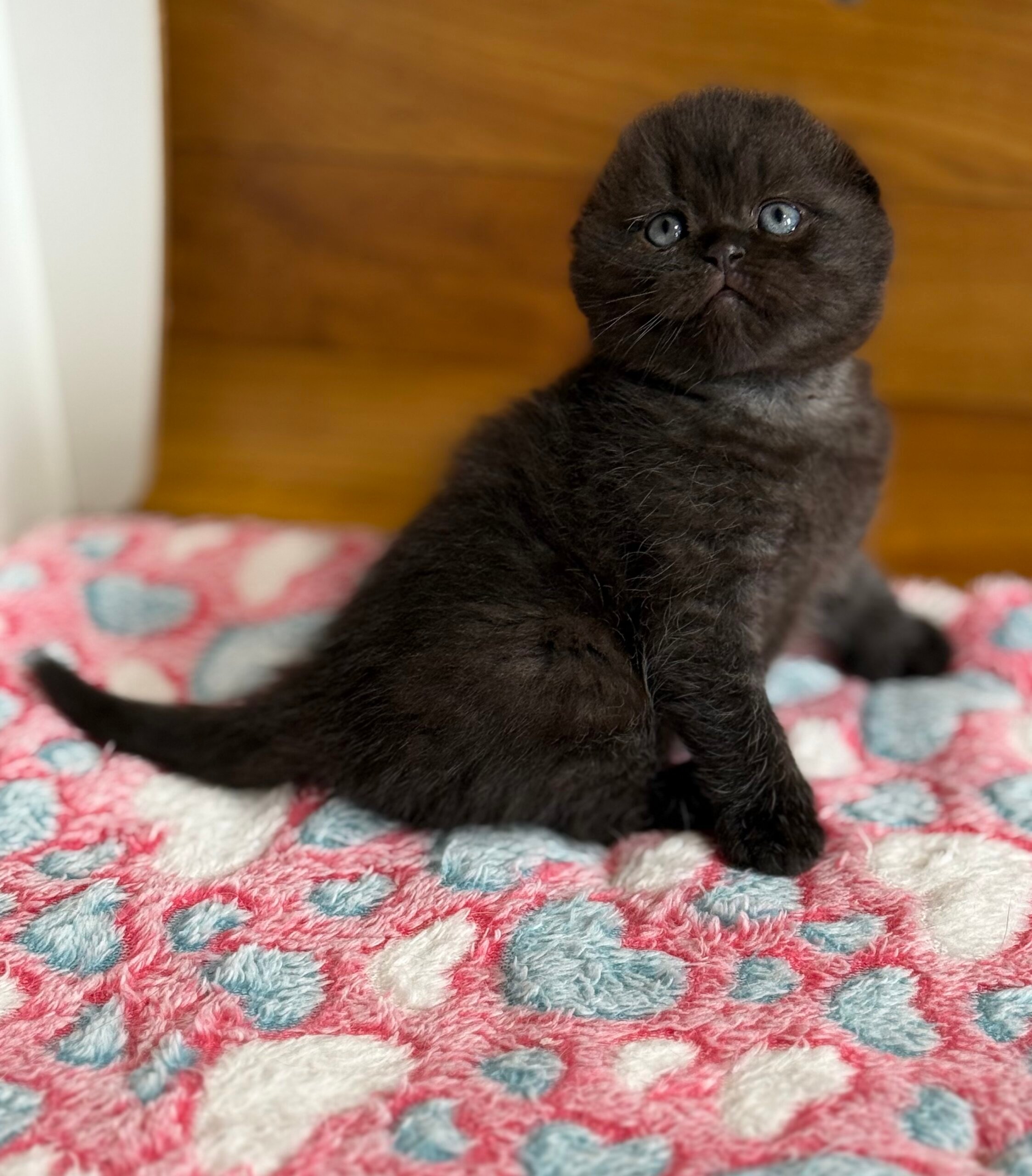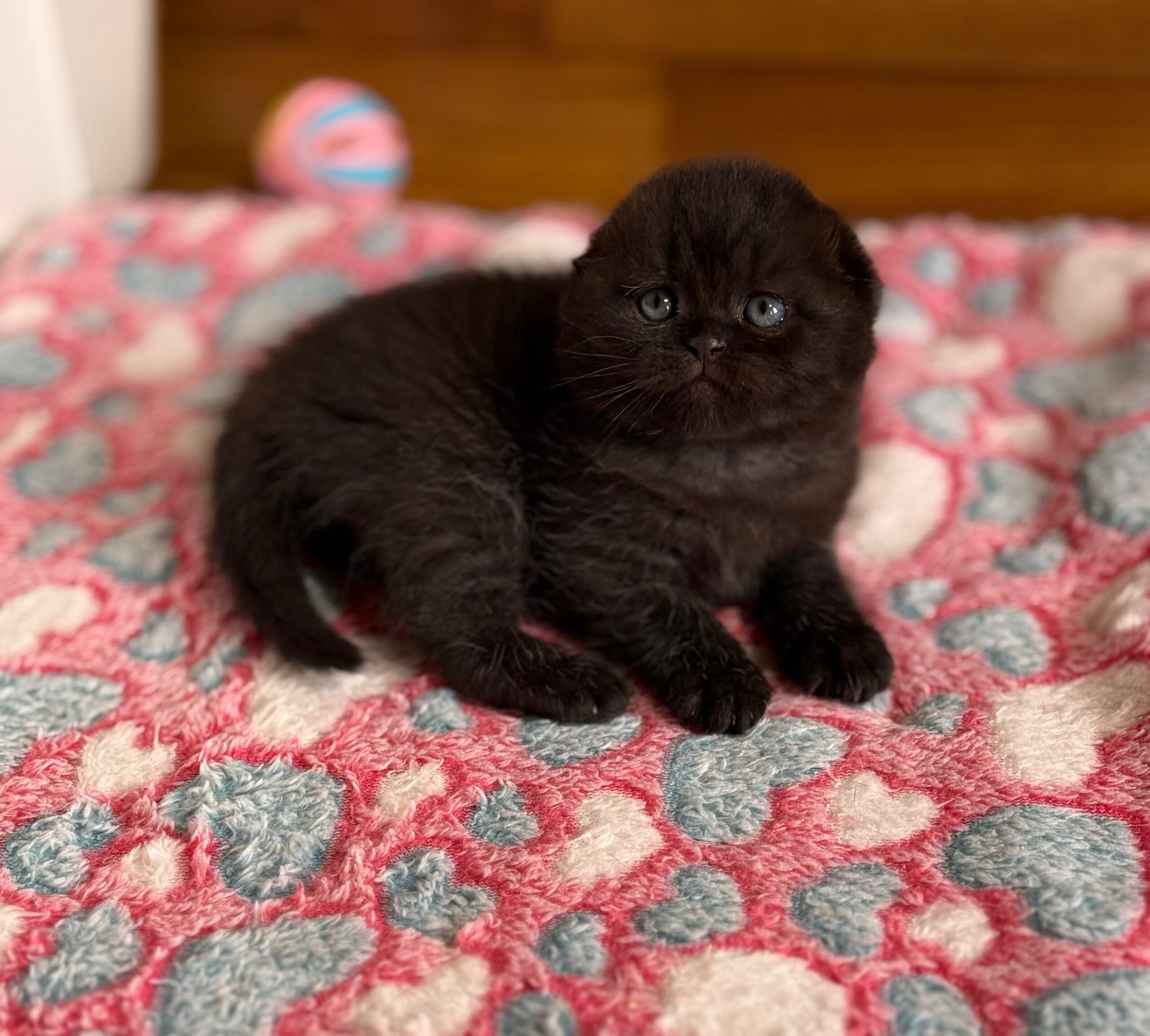 Meet Markus, our tender-hearted Scottish Fold boy with a silky black coat as deep as midnight and bright, soul-searching yellow eyes. From the first gentle purr to his soft nuzzles, Markus is the kitten whose warmth will melt your heart and turn every cuddle into a precious memory.