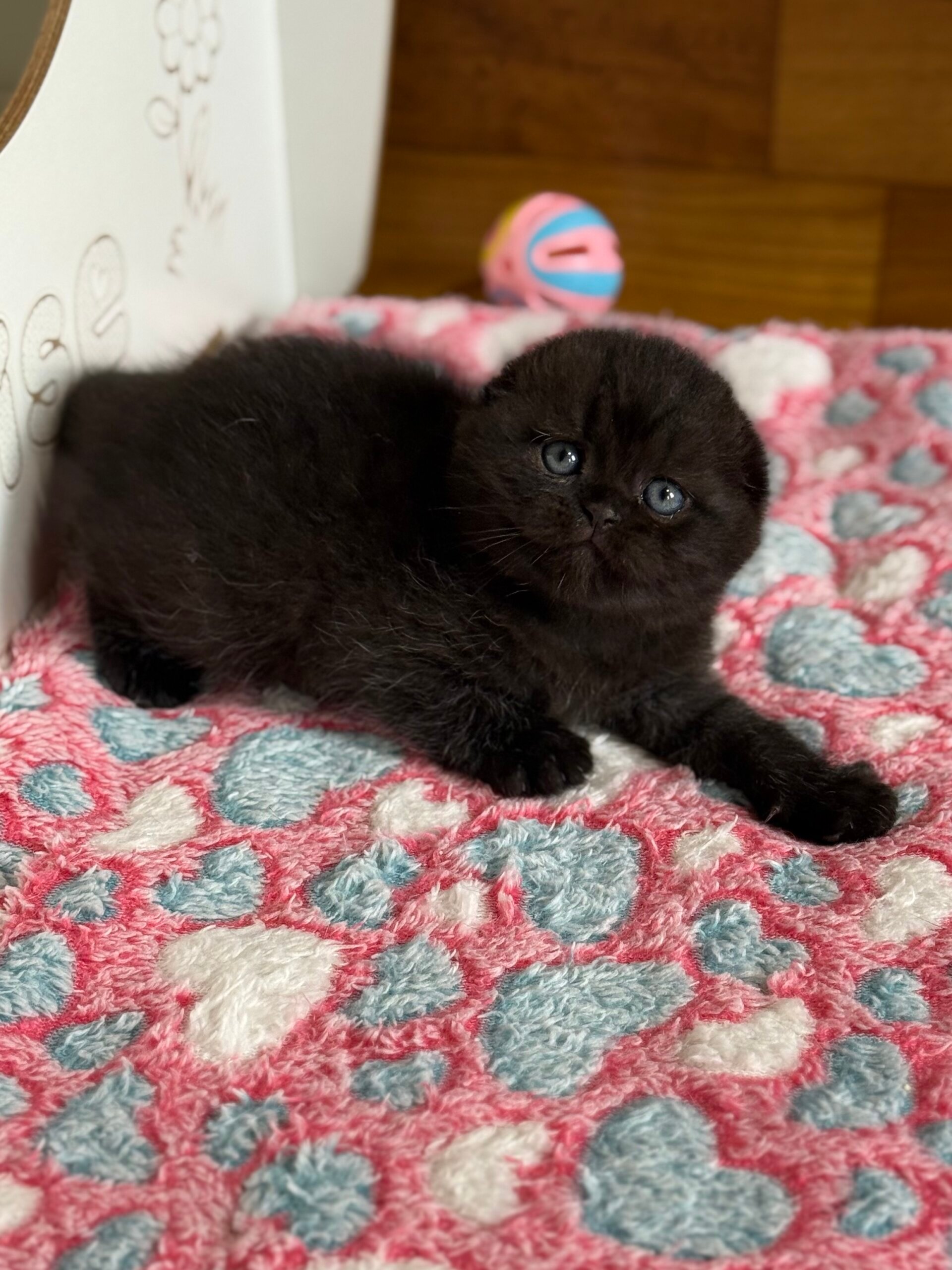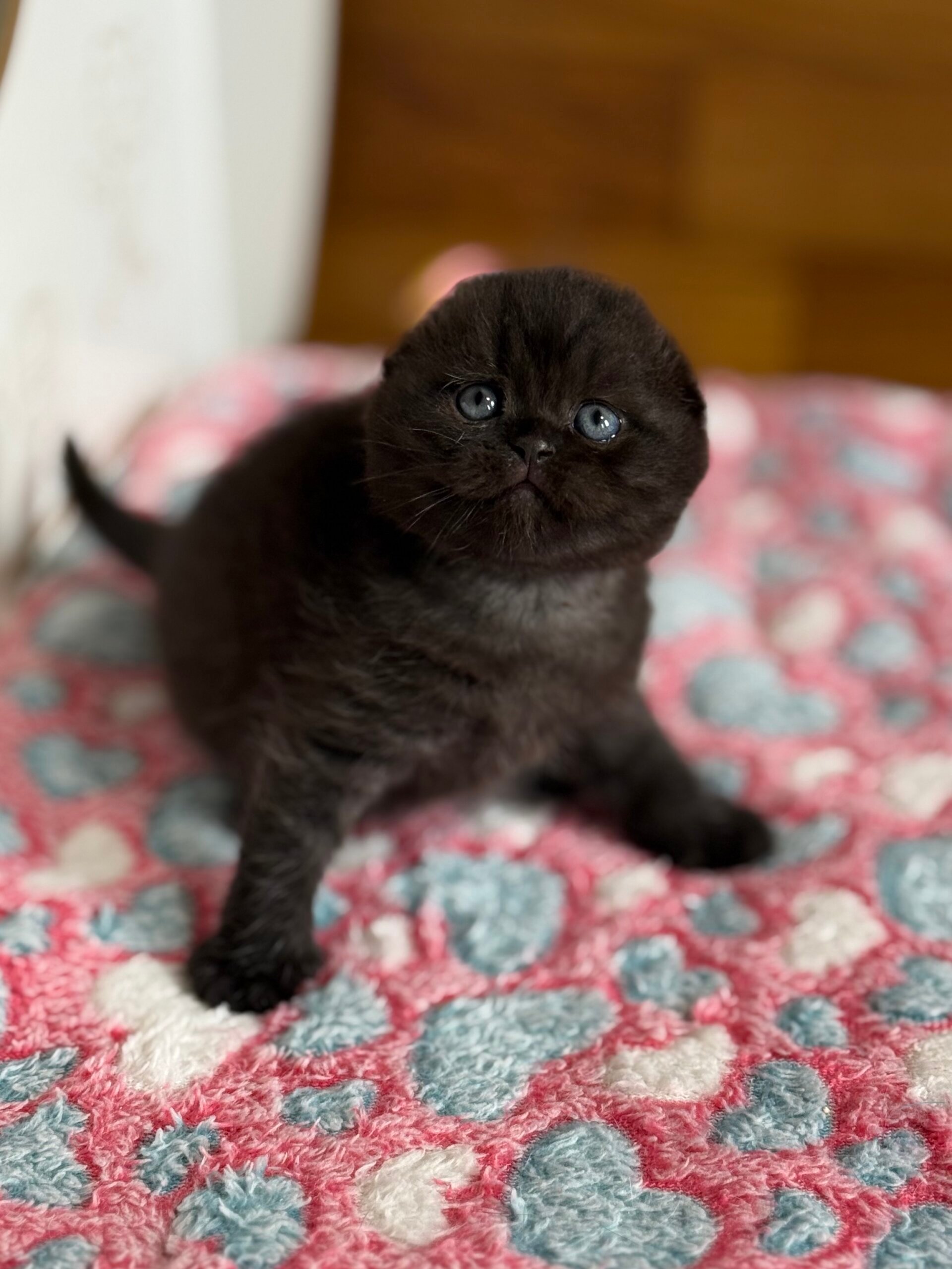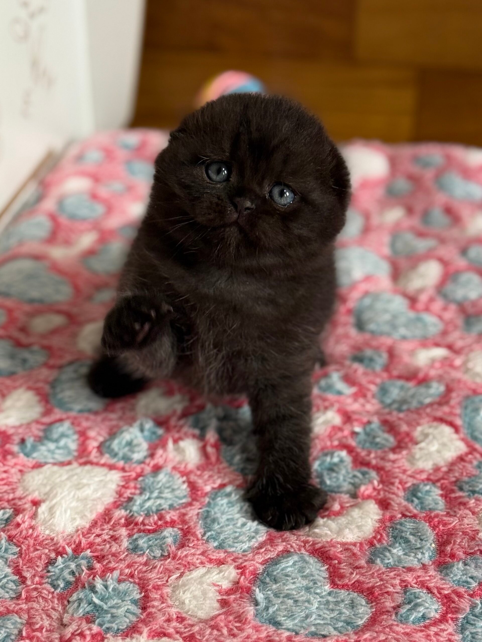 Meet Markus, our tender-hearted Scottish Fold boy with a silky black coat as deep as midnight and bright, soul-searching yellow eyes. From the first gentle purr to his soft nuzzles, Markus is the kitten whose warmth will melt your heart and turn every cuddle into a precious memory.