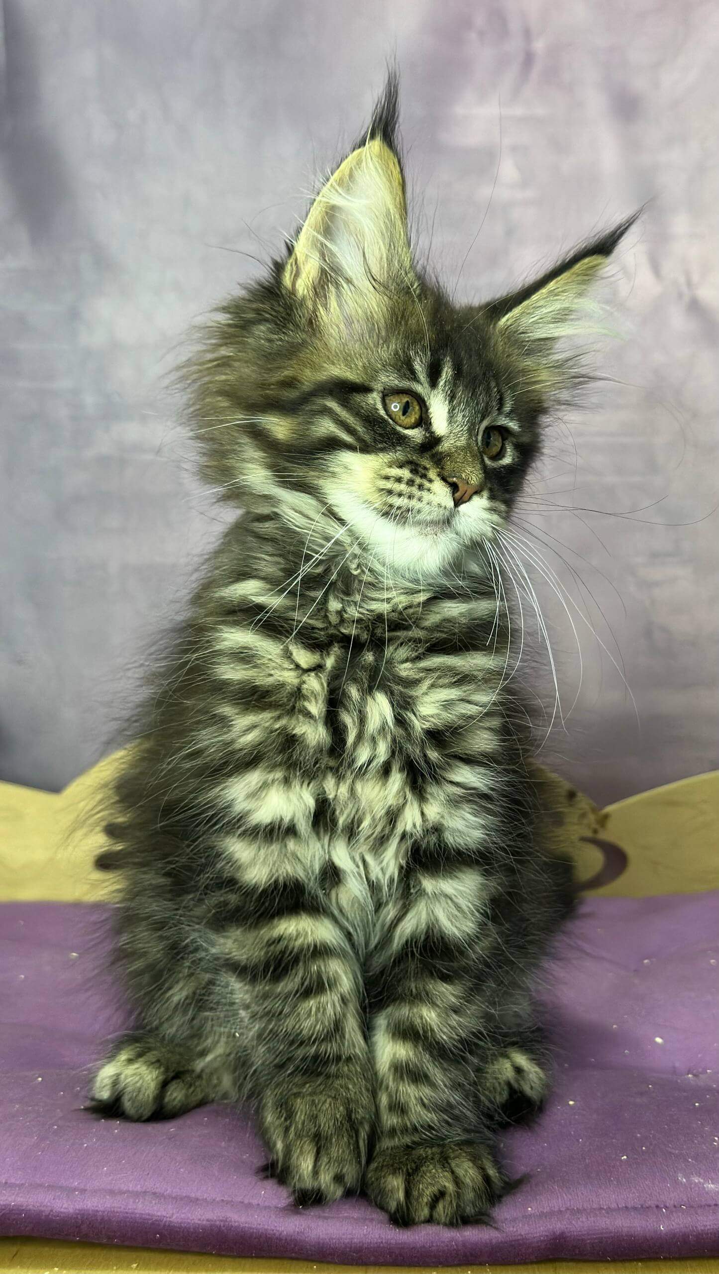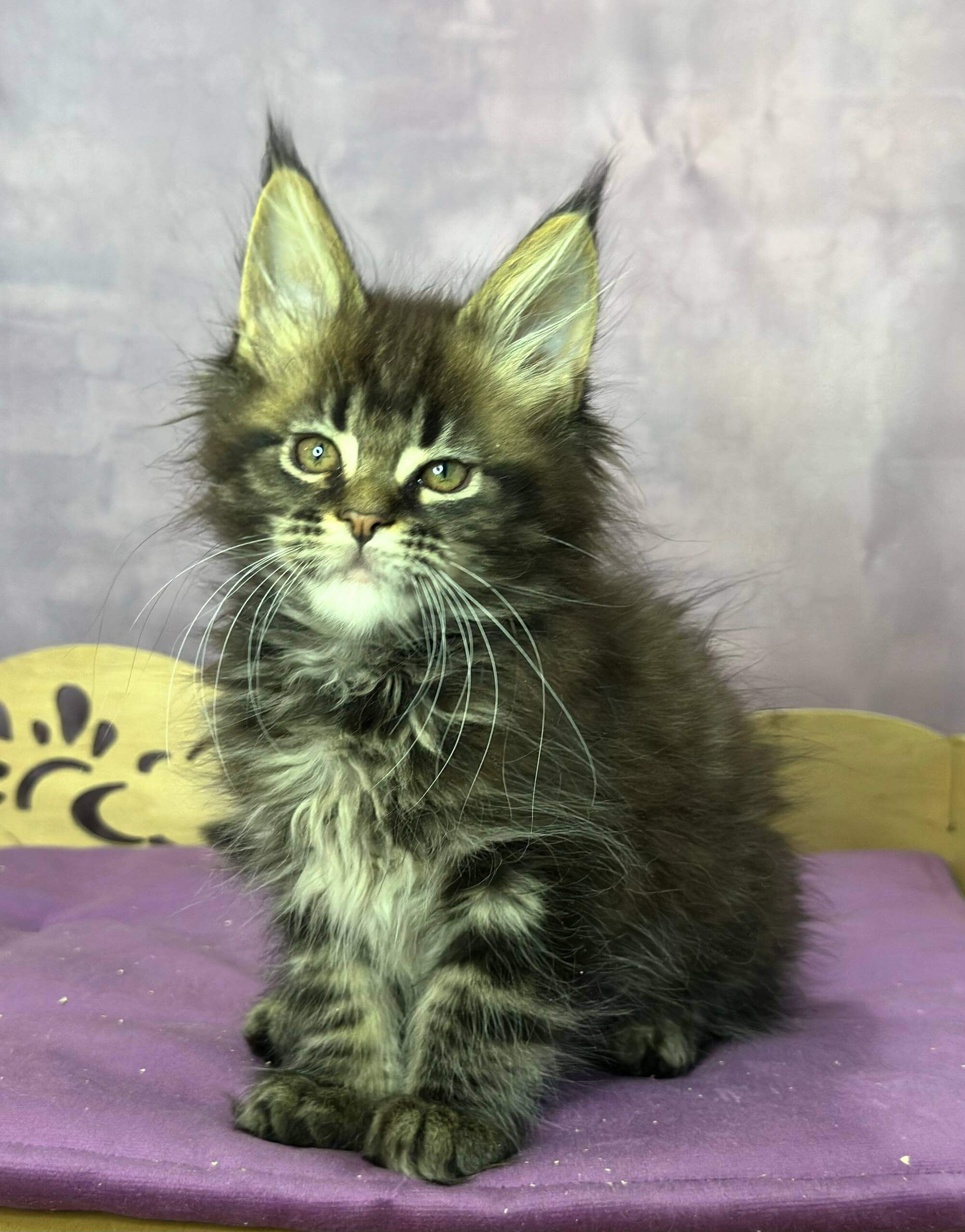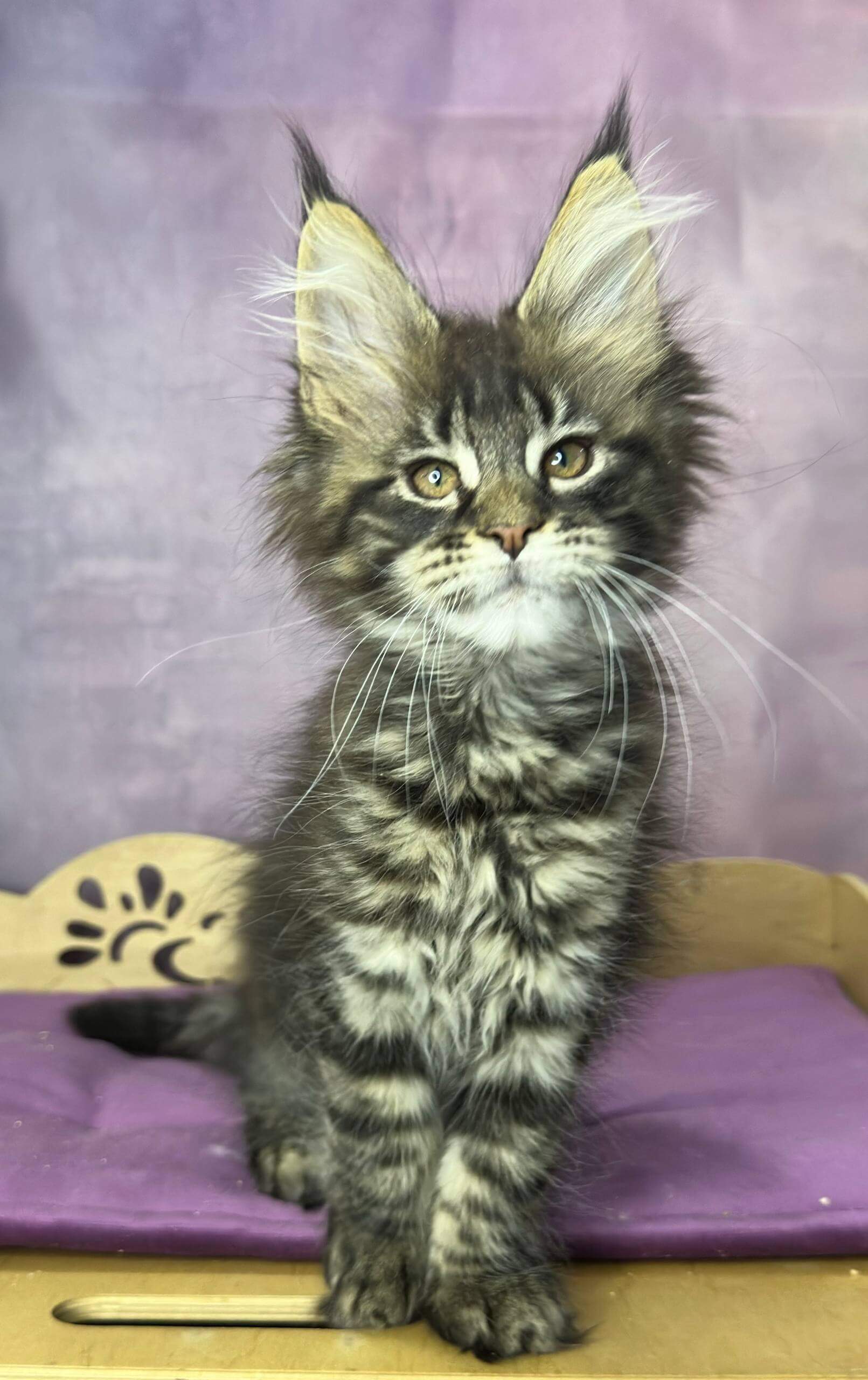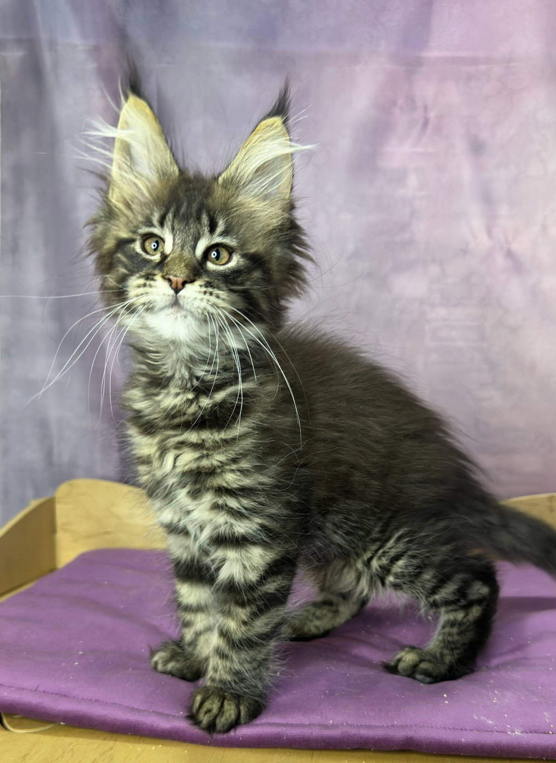 Miranda is show quality, born from champion bloodlines and proudly WCF registered—a rare gem among Maine Coons. She’s been raised in a family setting, fully socialized, and accustomed to all the daily sounds of a loving home. Your mind is at ease: Miranda comes vet-checked, vaccinated, and litter trained on high-quality clumping litter. Our team offers support seven days a week after adoption.