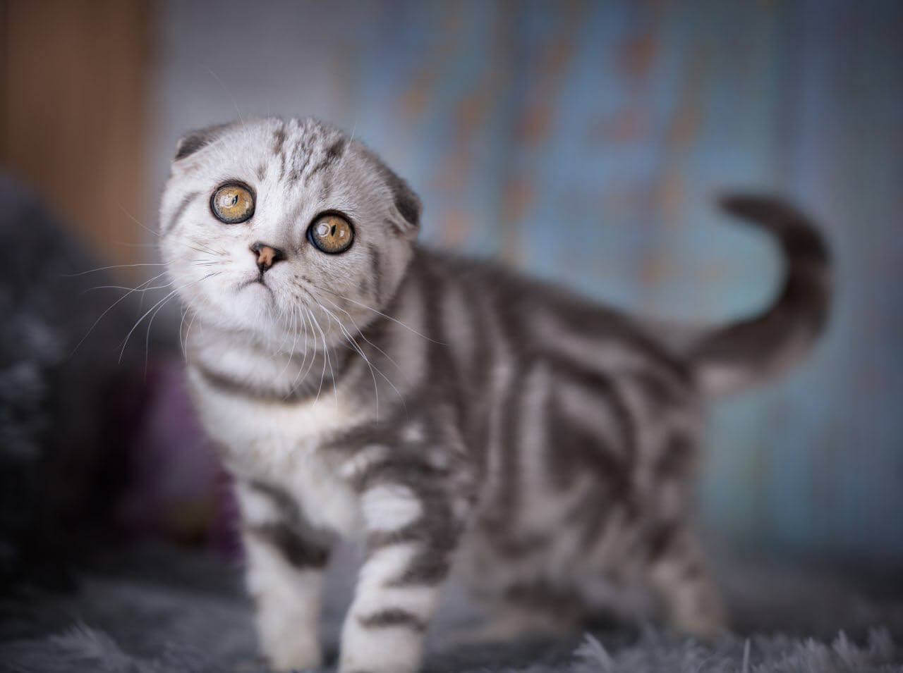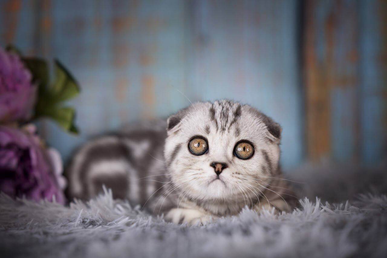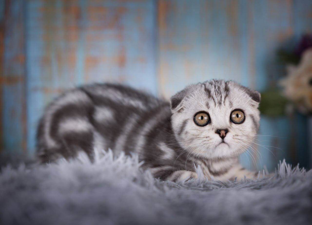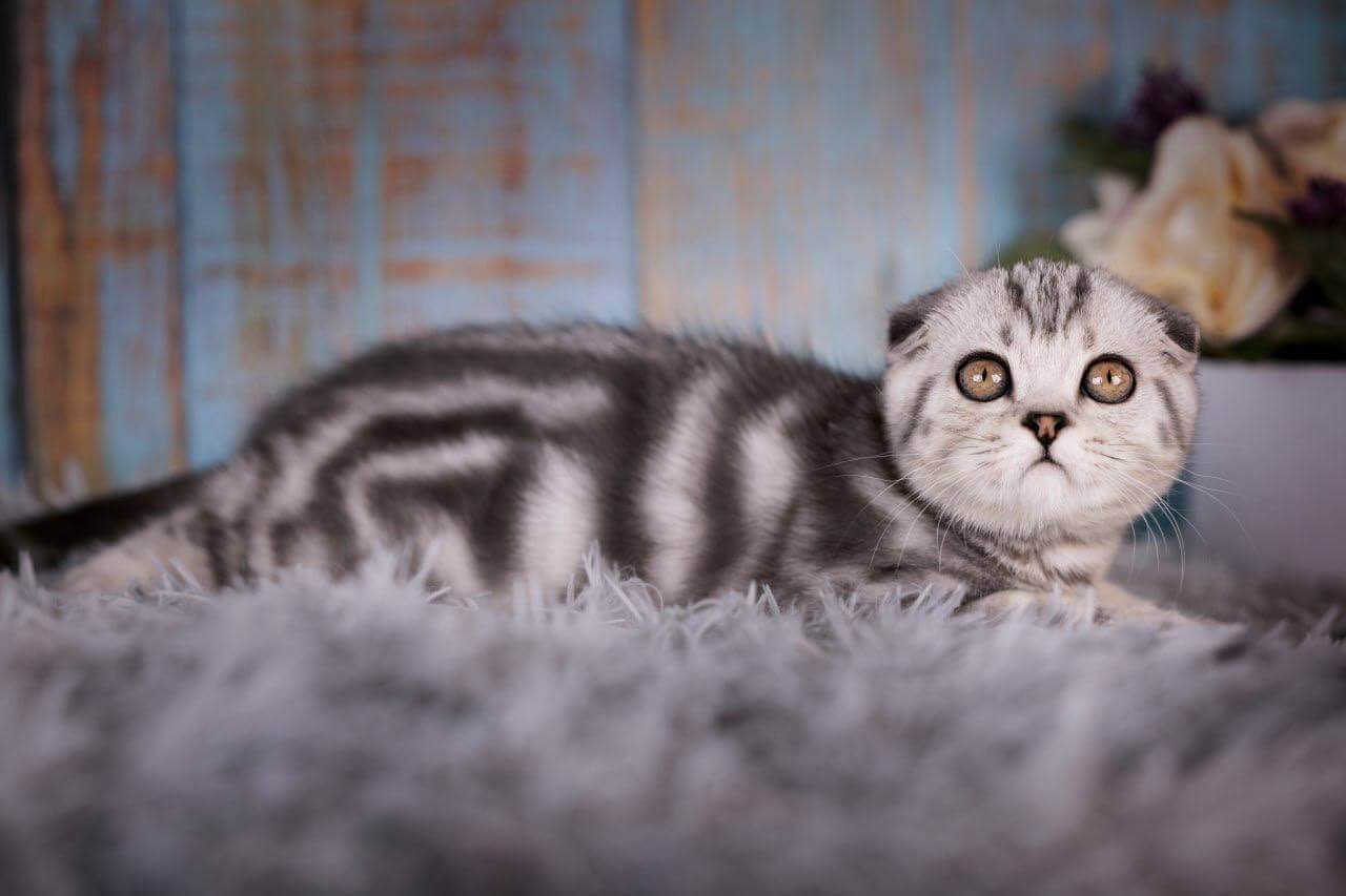 Meet Nala, an enchanting female Scottish Fold kitten with eye-catching black silver tabby blotched markings and striking yellow eyes. Born on June 27, 2025, Nala hails from champion bloodlines and is show-quality, making her a wonderful addition to any home. She’ll be ready to join her new family on October 27, 2025, and is available for reservation on our website.