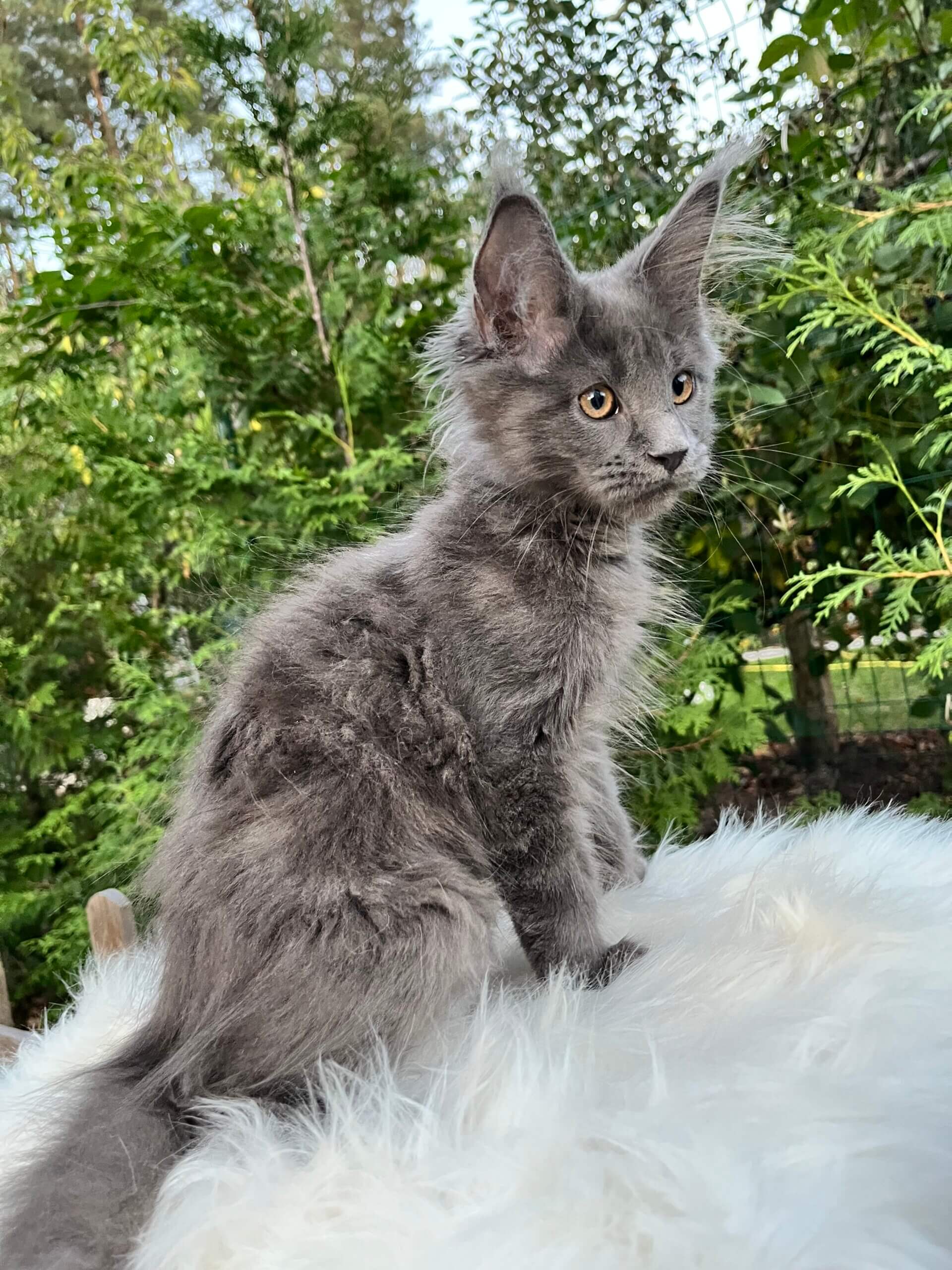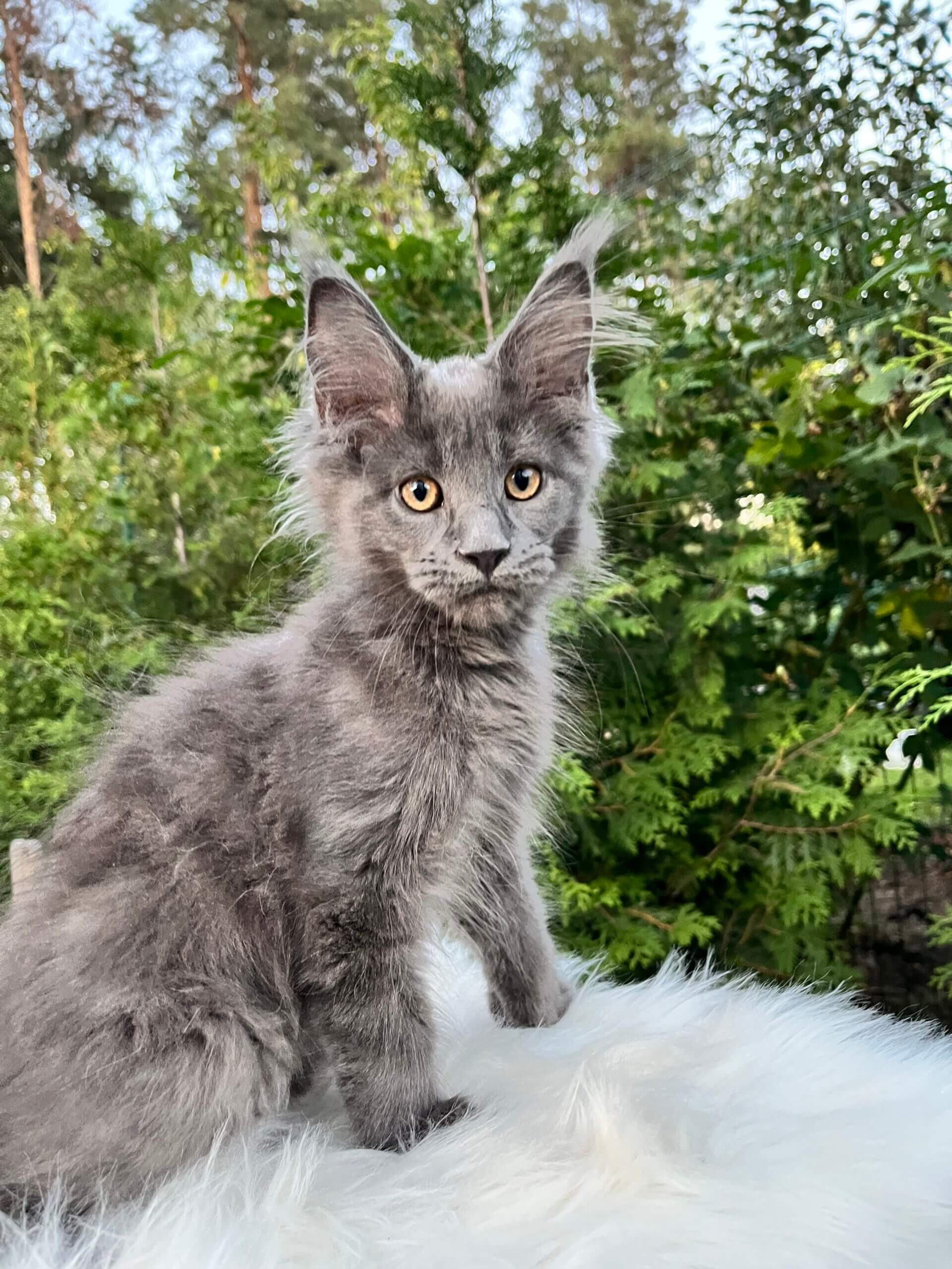 Newton is a breathtaking show-quality Maine Coon boy, his plush fur the color of twilight and glowing yellow eyes that light up every room. Playful but composed, he’s happiest curled in your lap or gently chasing sunbeams from window to window, always eager for affection and gentle strokes.