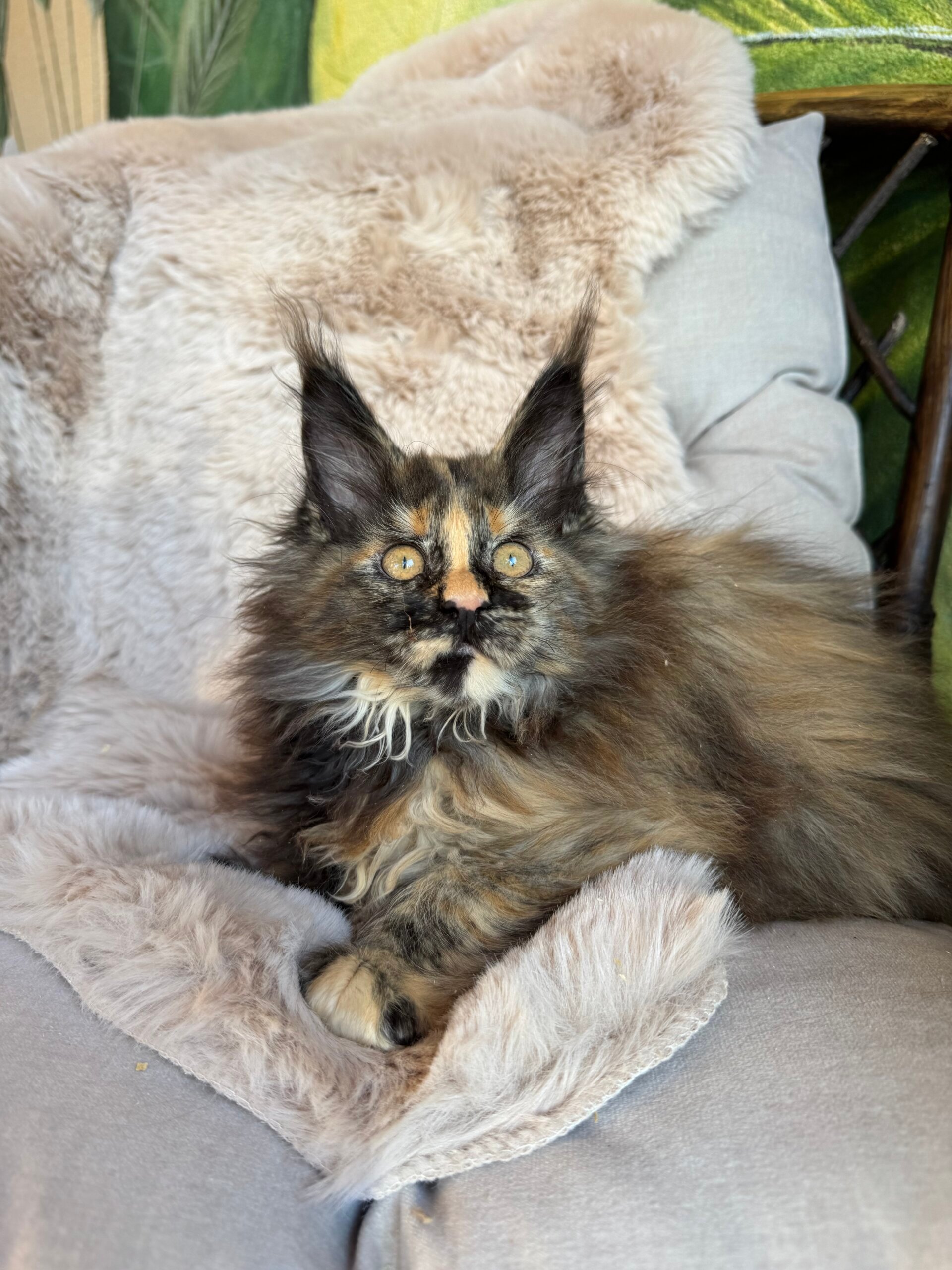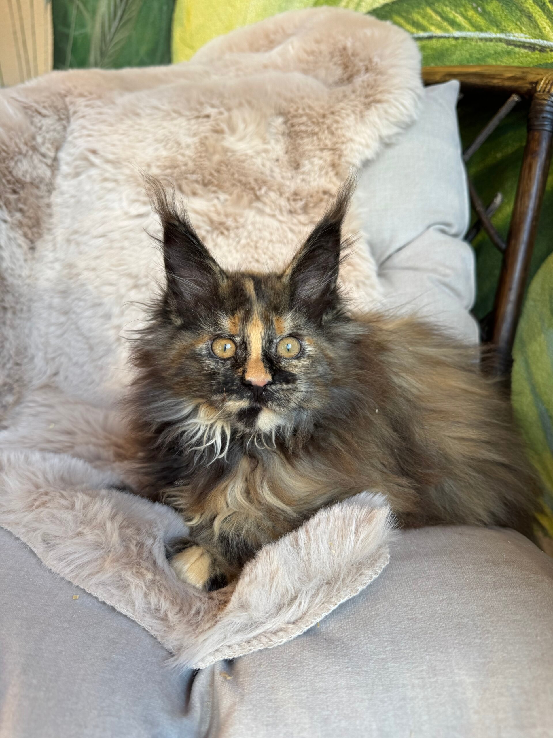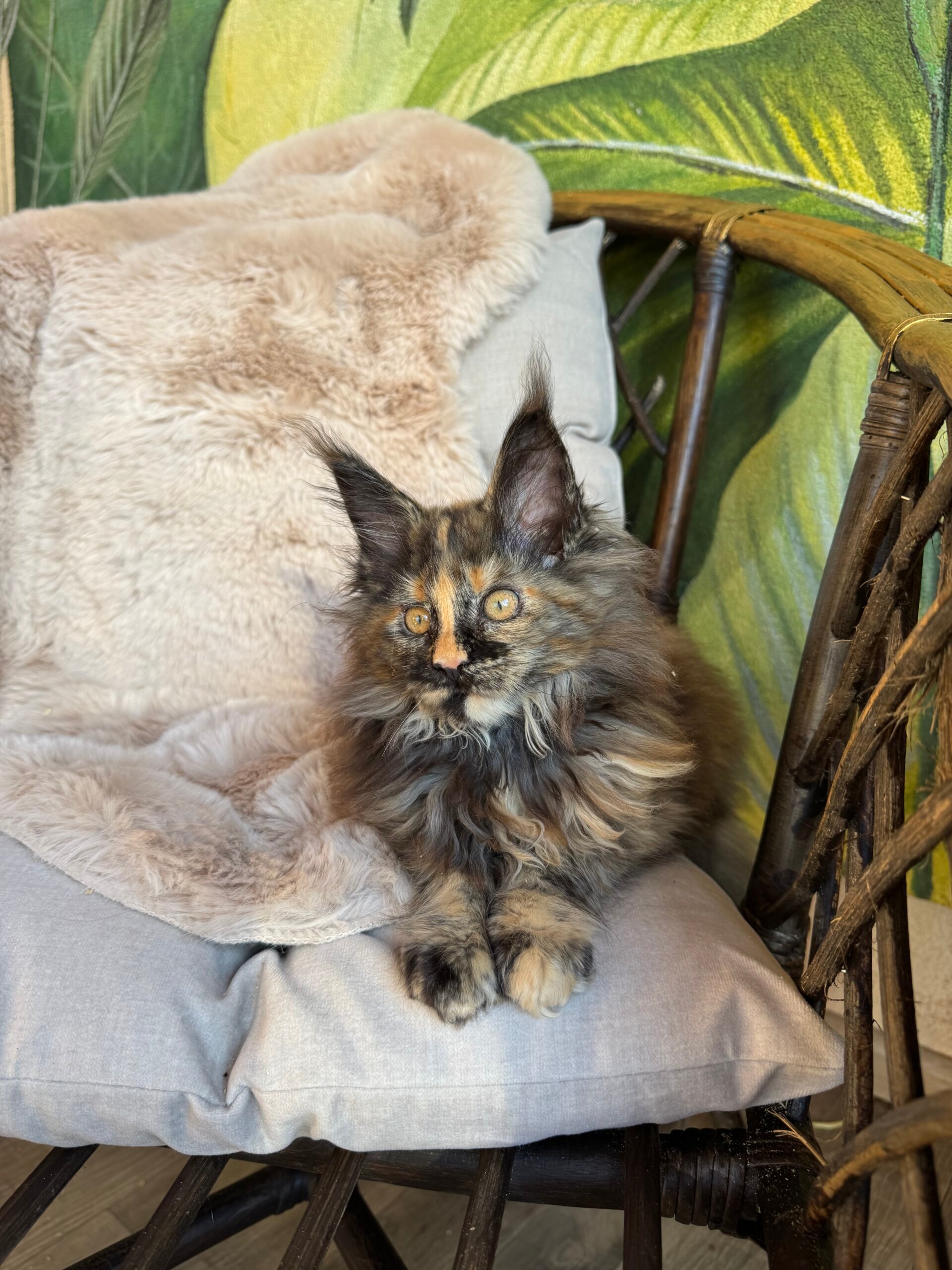 Nicky is a stunning Maine Coon princess: show-stopping yellow eyes, a silky, dramatic coat with swirls of midnight and fiery amber, and enchanting tufts at her ears. Her playful curiosity brings magic to every corner, yet her sweetest joy is nestling into your arms, rumbling with contentment as you stroke her velvety fur.