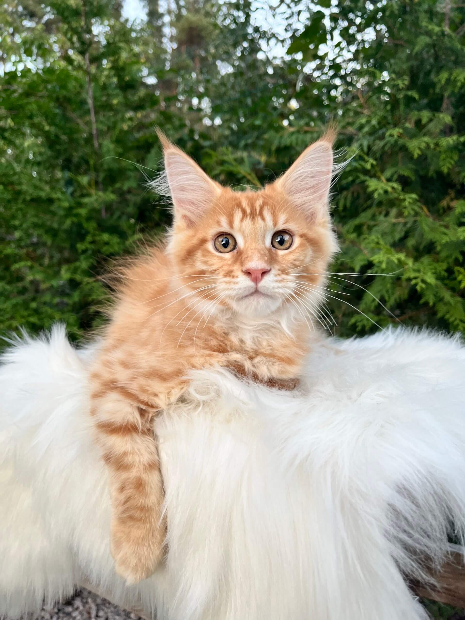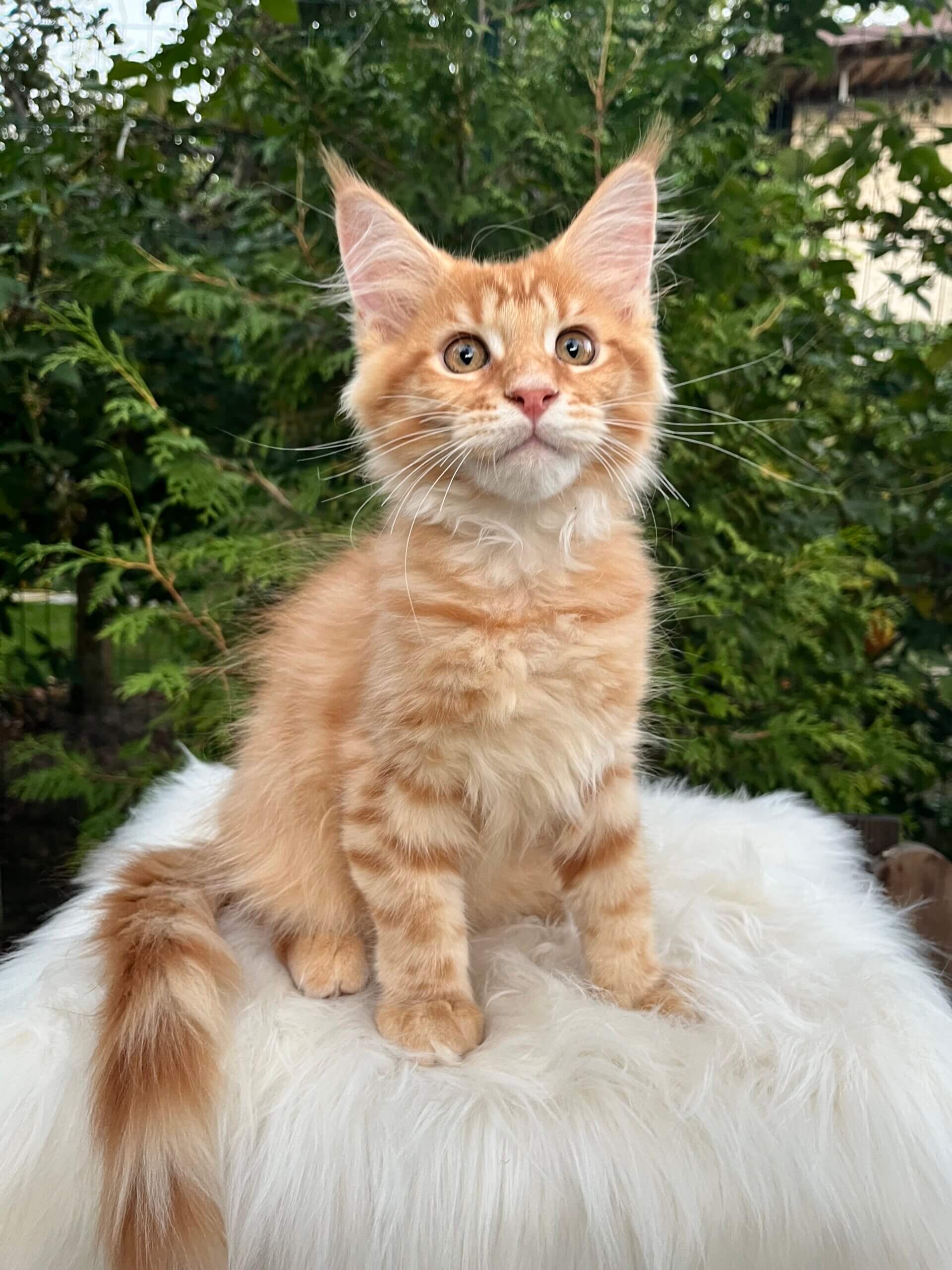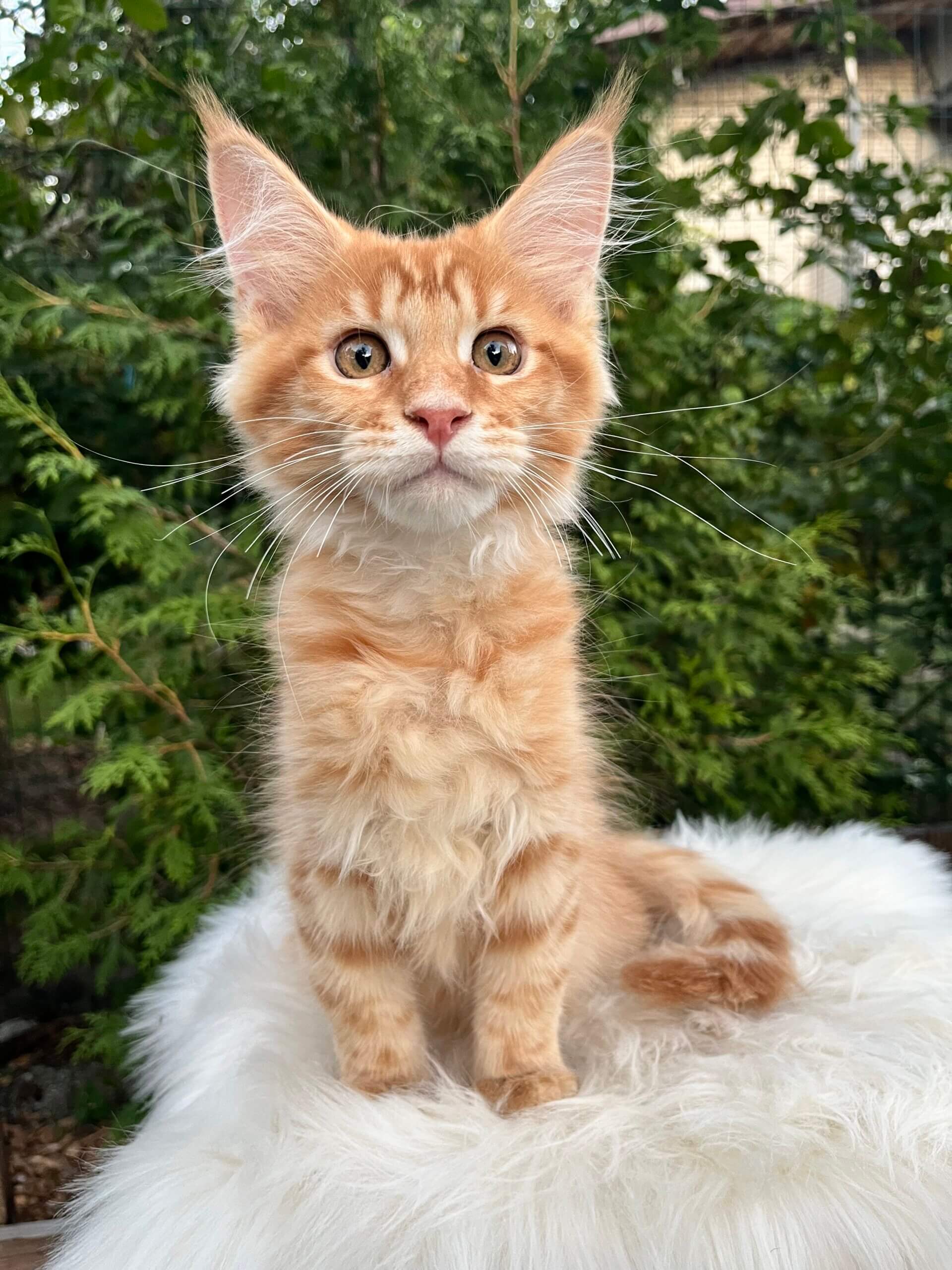 Meet Nixon—a glowing ray of ginger sunshine, waiting to purr his way into your heart. This red tabby Maine Coon boy gazes up at you with soulful yellow eyes, his soft, plush coat shimmering with warmth you’ll want to run your fingers through every morning.