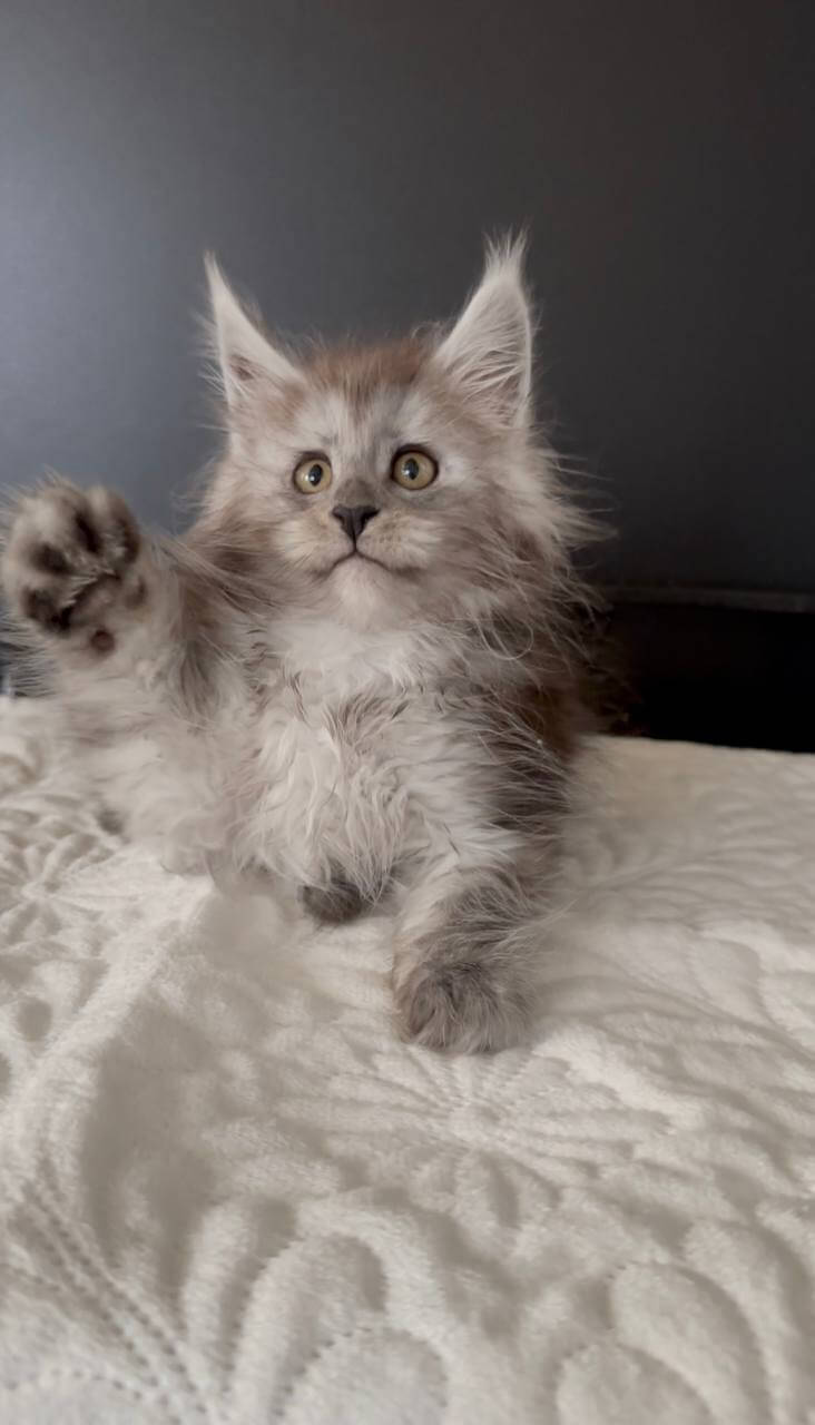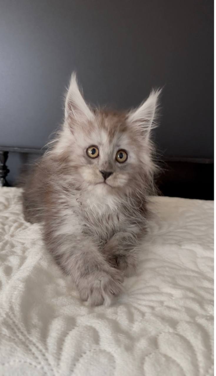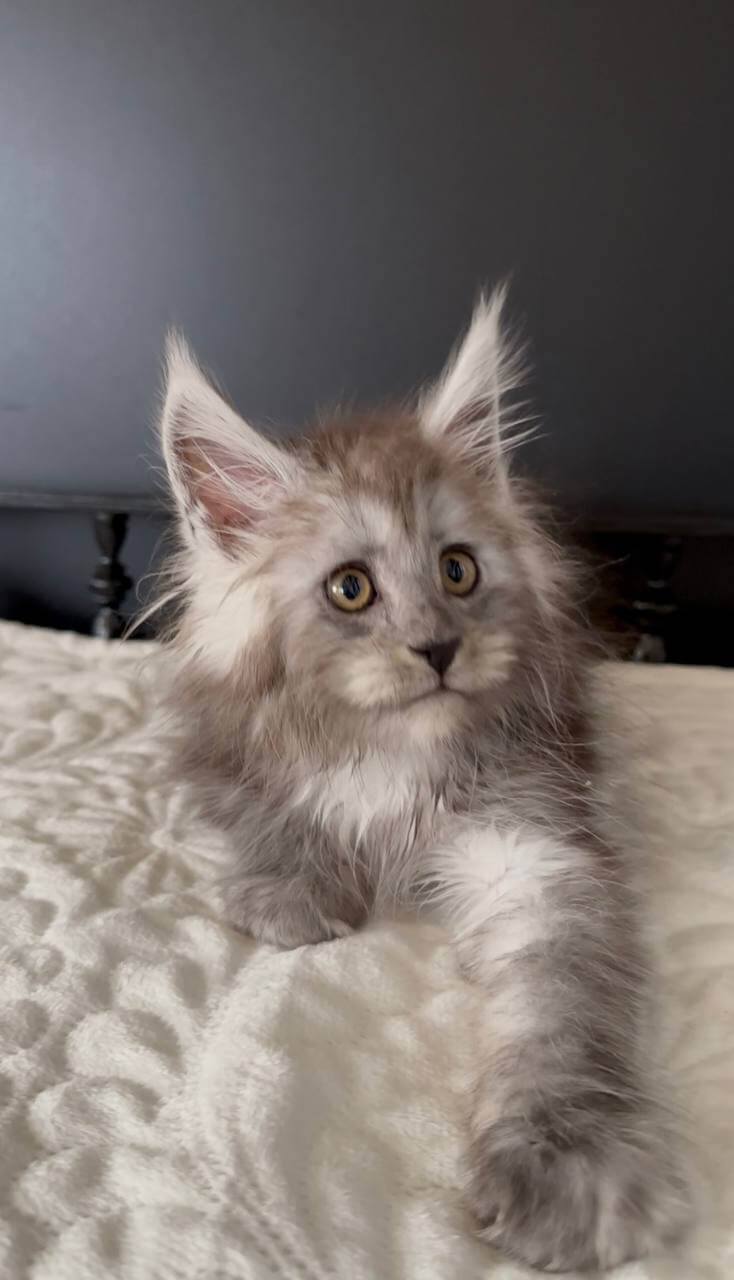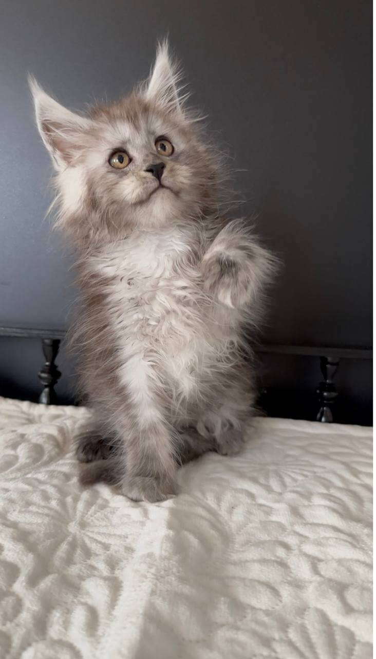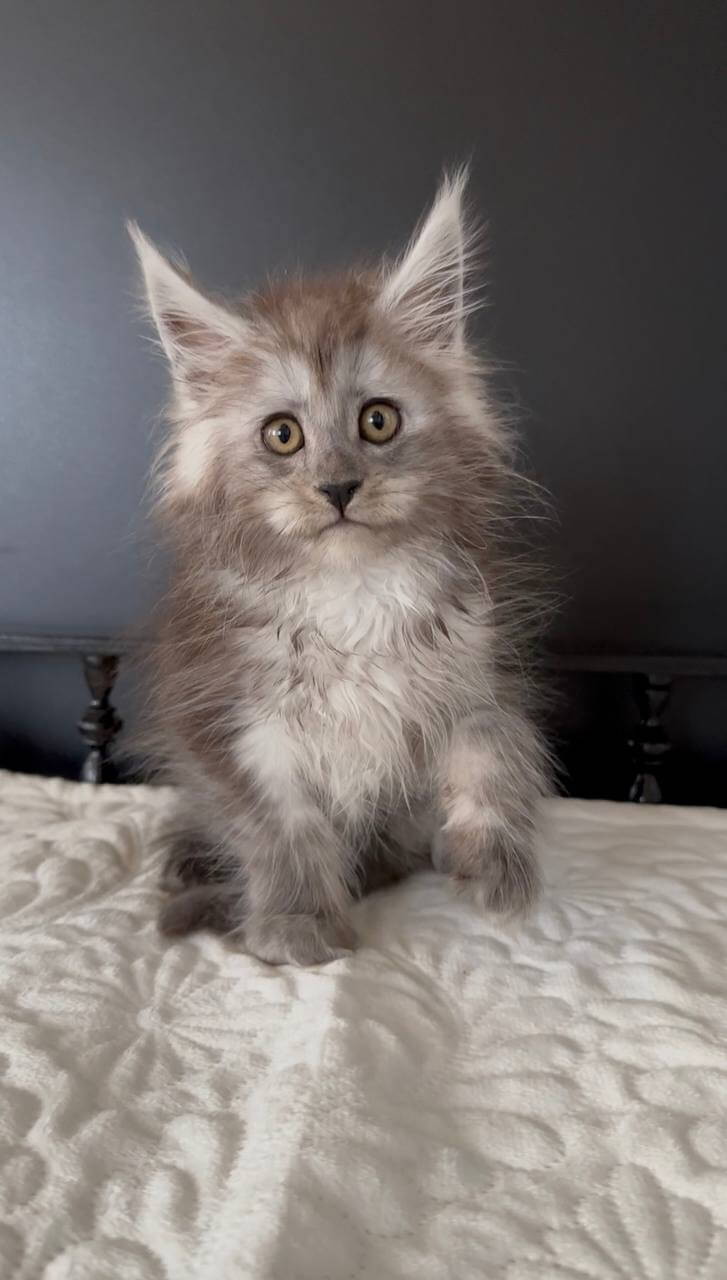 Meet Nora, your future heart-stealer—a stunning black silver Maine Coon princess with enchanting yellow eyes that promise endless warmth and gentle companionship.