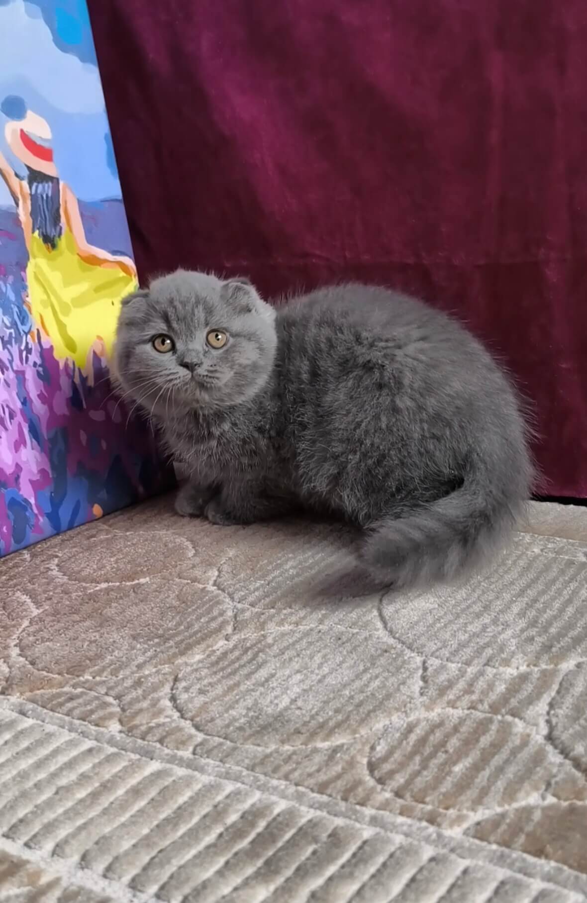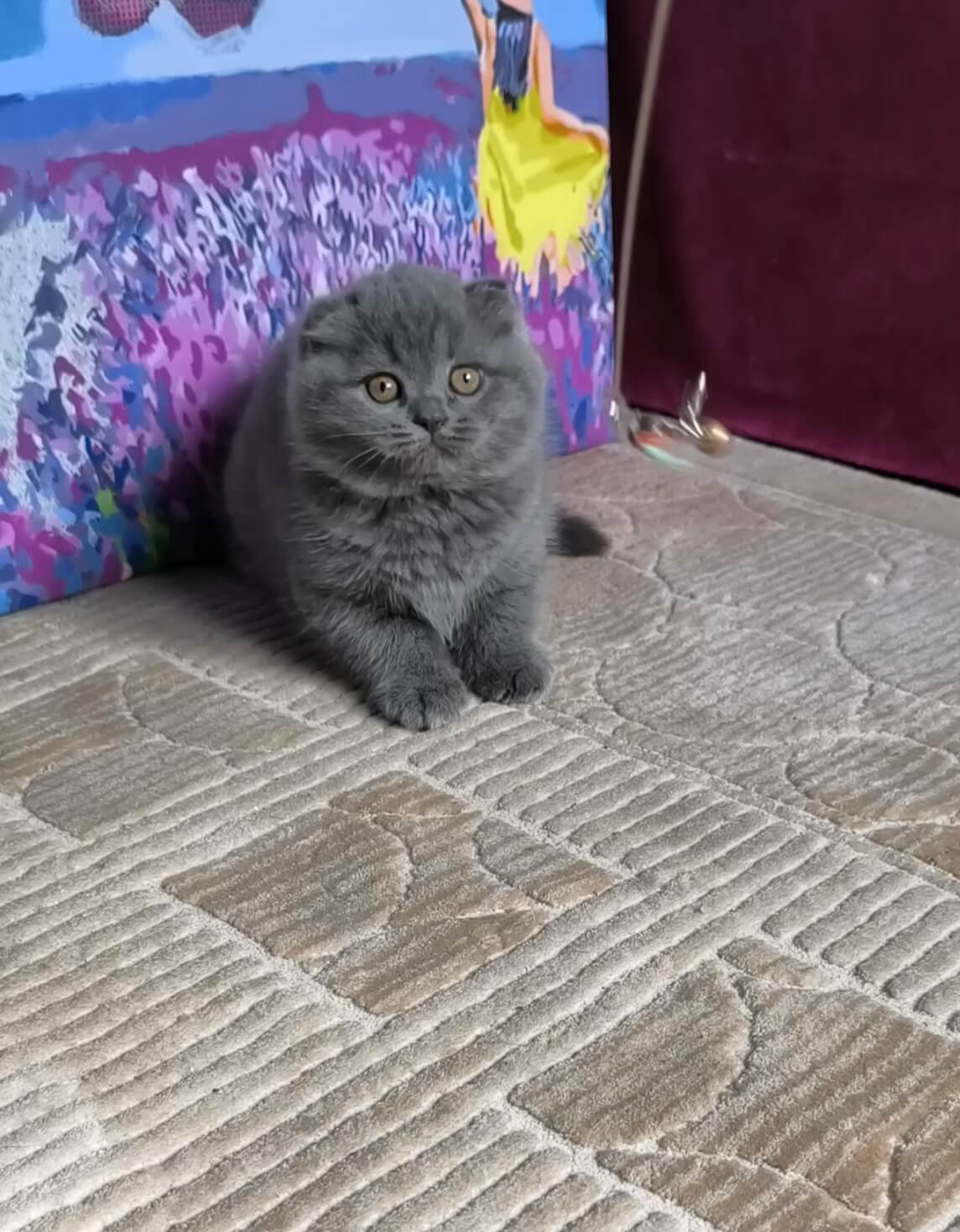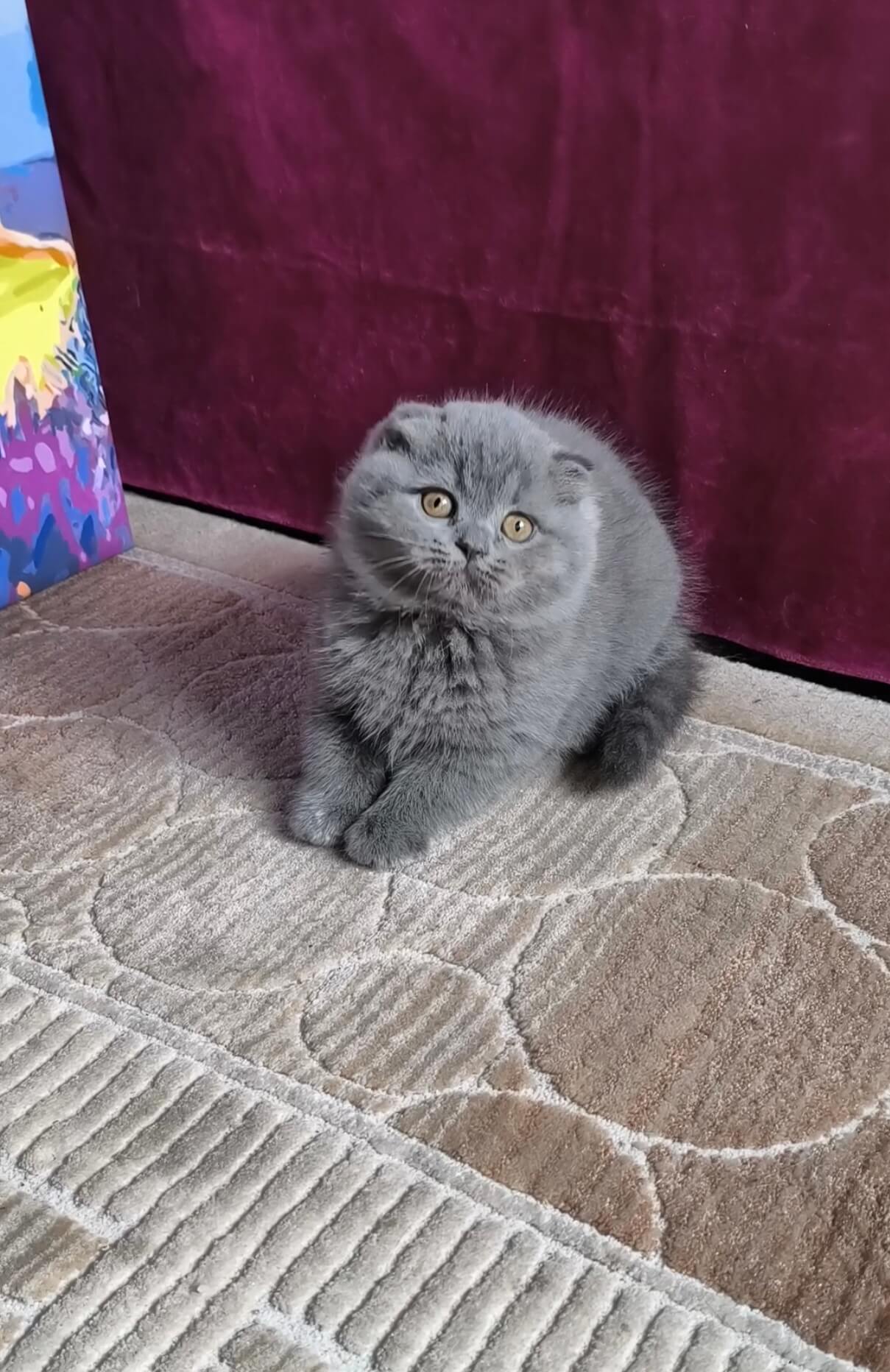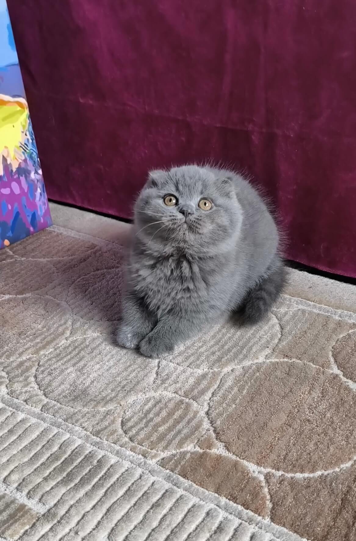 Meet Odette, a blue Scottish Fold princess ready to melt your heart from the very first nuzzle. With her plush silvery coat and enchanting yellow eyes, Odette radiates quiet charm—always gentle, always curious, and happiest curled sweetly in your arms, purring with contentment.