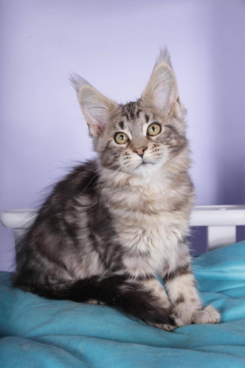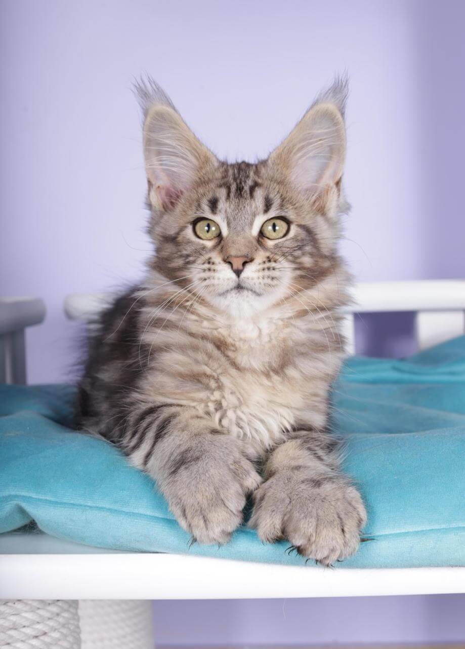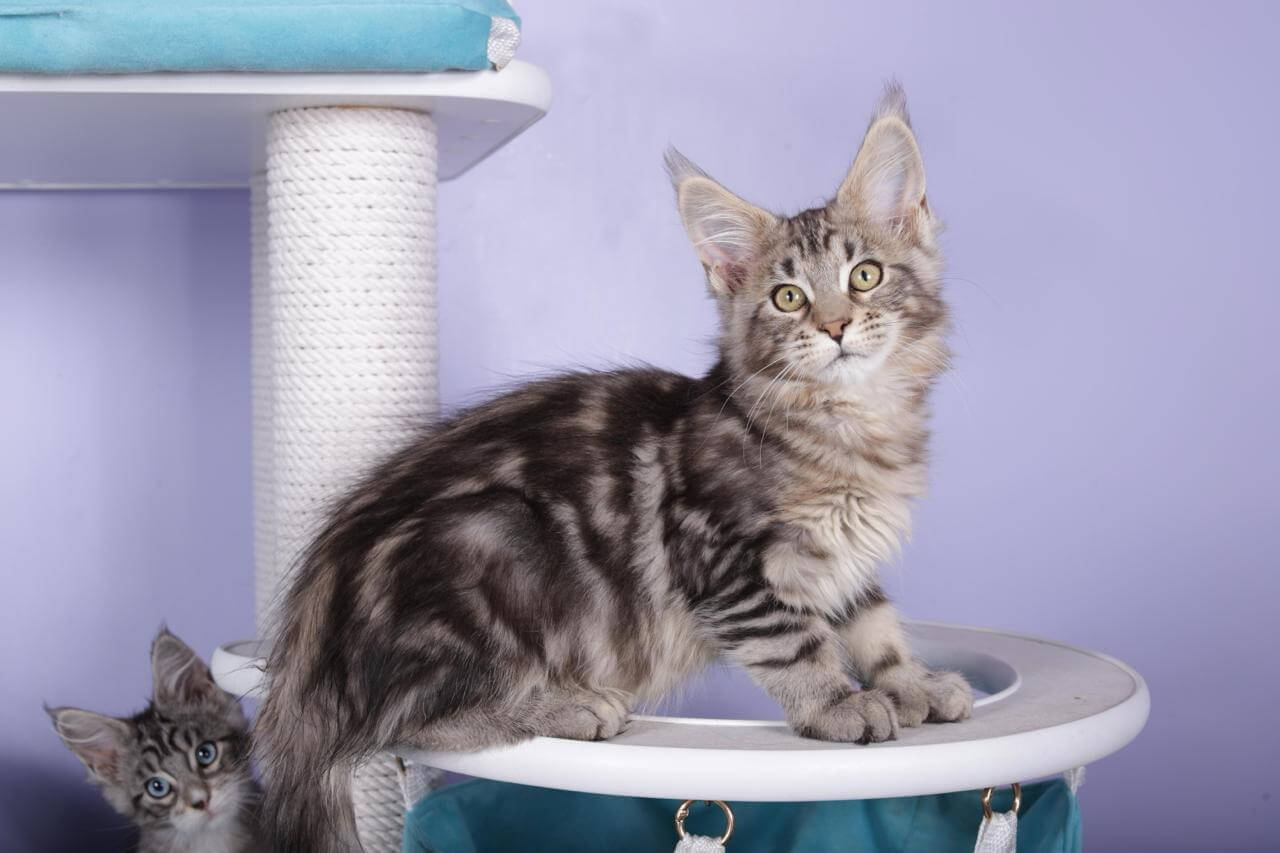 This darling Maine Coon girl, born July 27, 2025, is a rare beauty: shimmering black silver tabby swirls, mesmerizing yellow eyes, and adorable poly (extra-toed) paws made for gentle kneading. Olympia isn’t just breathtaking to see—she’s a cuddle expert, already purring for affection and exploring every nook with patient, playful grace.