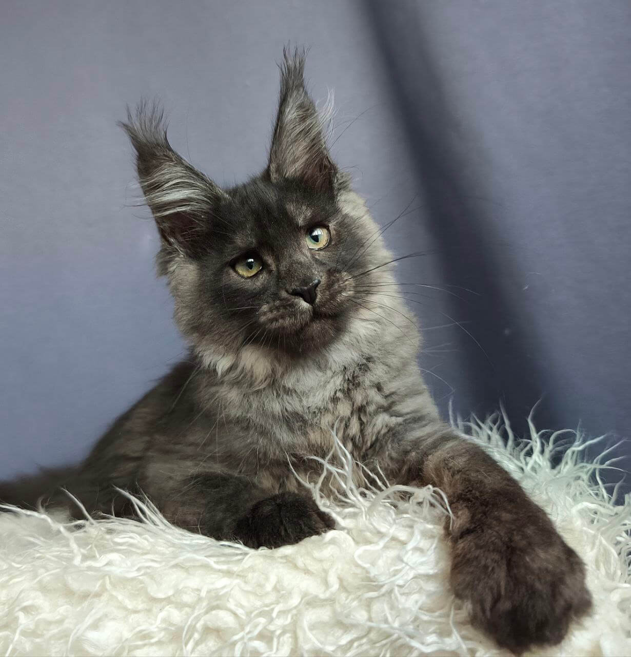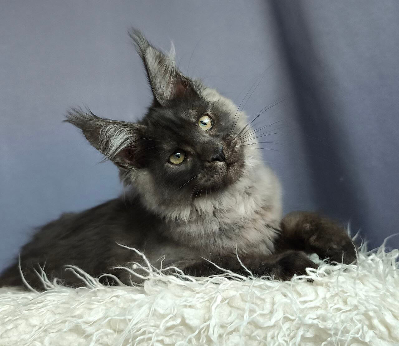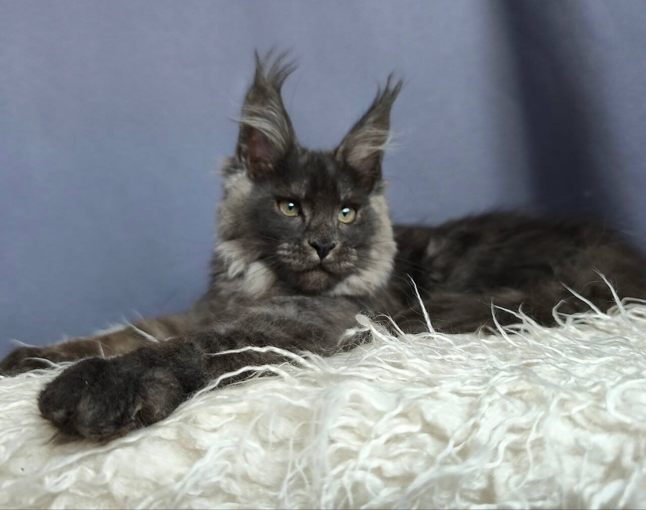 Meet O’maha – a mesmerizing black silver Maine Coon girl whose soft, cloud-like fur and soulful green-yellow eyes will capture your heart at first glance. From her gentle purrs to the warmth of her velvet paws, O’maha radiates sweet comfort—she adores curling up for snuggles and always greets you with curious affection.