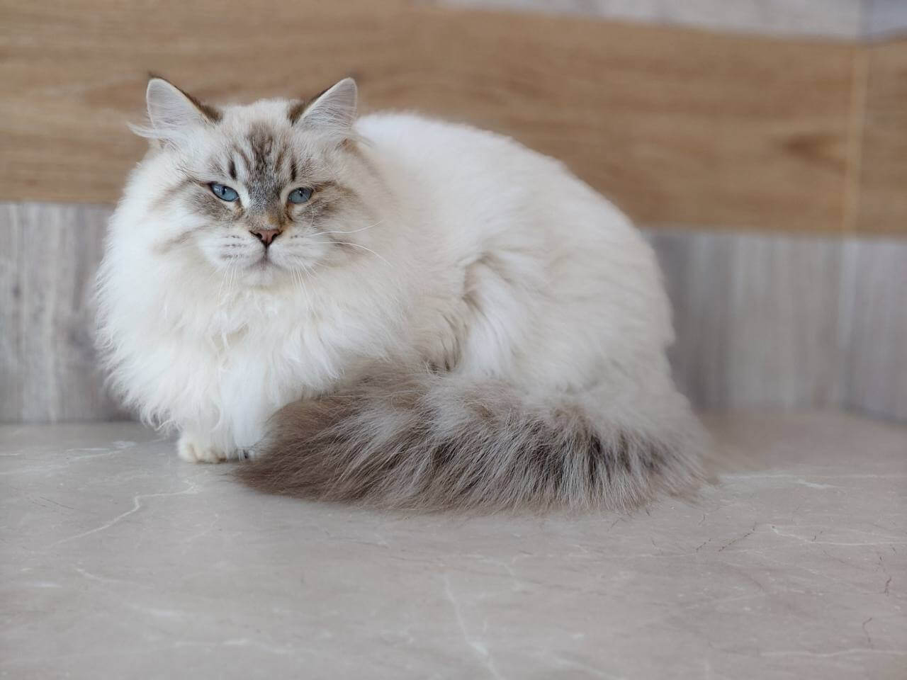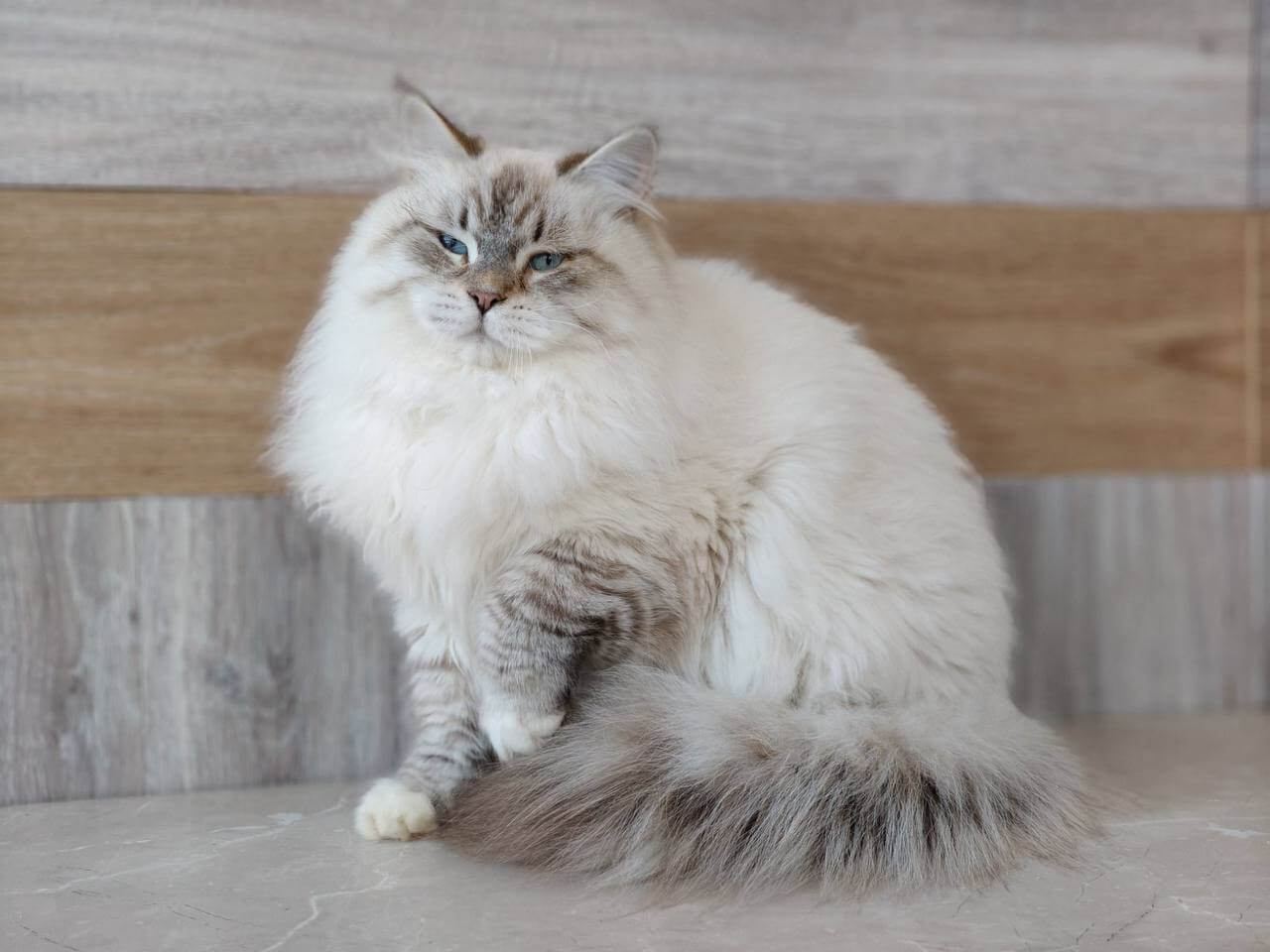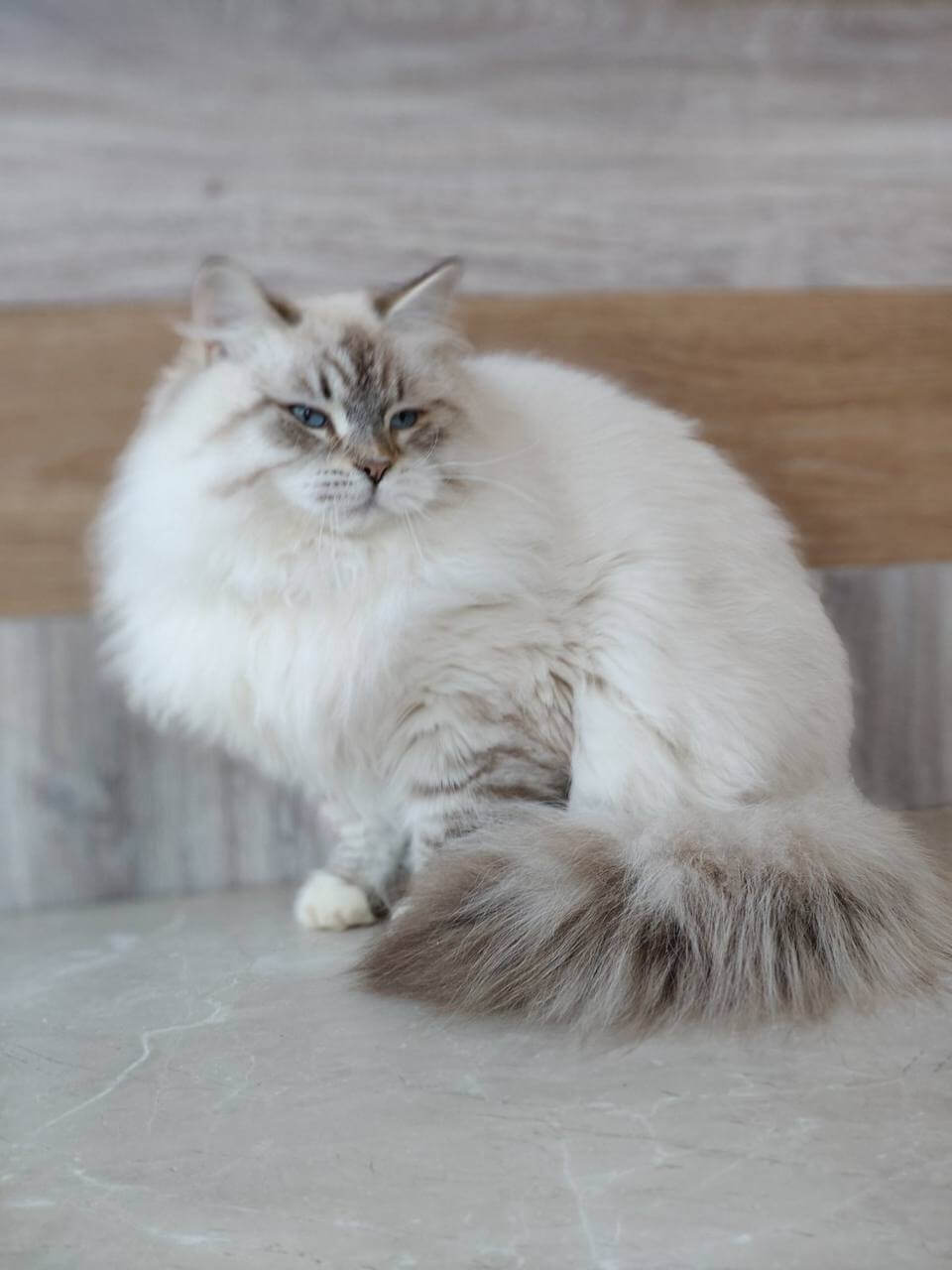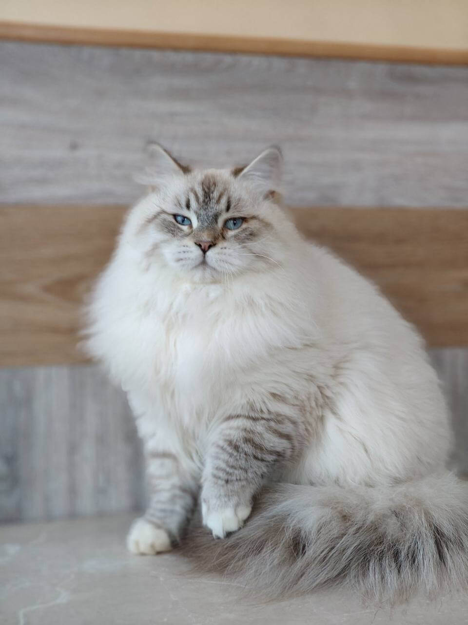 Run your fingers through Oskar’s plush Seal Lynx Point With White fur, and you’ll notice the delicate gradients of caramel on his velvety coat, paired with brilliant blue eyes alive with curiosity. He’s a Siberian kitten whose silken density is as inviting as it is rare, carrying a subtle warmth when nestled on your shoulder. Set against snowy paws and a whisper-soft muzzle, his appearance glows with gentle strength.